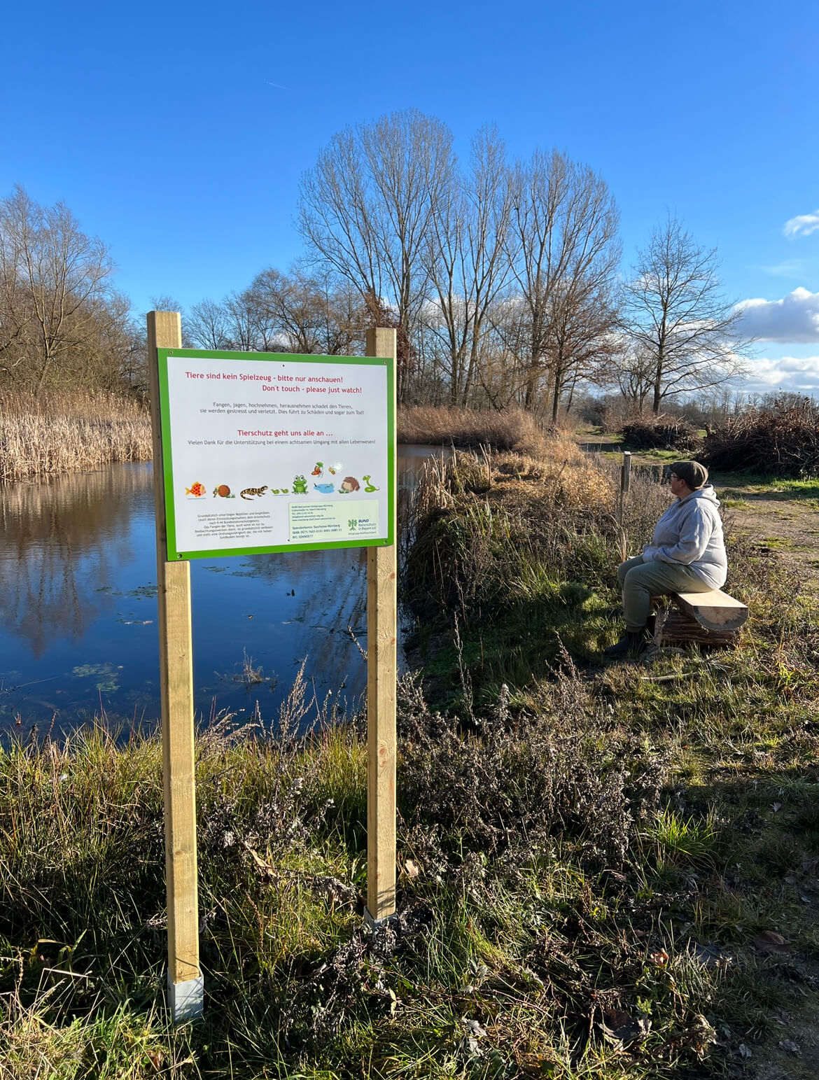 Das BN-Biotop in Reutles ist gesetzlich geschützter Landschaftsbestandteil (LB) und wichtiges Laichgewässer für Amphibien und Libellen. Mit der umfassenden Sanierung 2021 ist nun wieder eine große Wasserfläche entstanden. Die BN-Ortsgruppe Knoblauchsland hat ein Schild gestaltet, das zur Rücksichtnahme gegenüber den Tieren mahnt. Da zudem Vögel in der Röhrichtzone brüten, sollte man Larven von Fröschen und Molchen auch nicht spielerisch nachstellen. Naturgenuss ist aber durchaus erwünscht. Daher haben die Aktiven einen neue Sitzbank gestaltet, die zum Verweilen einlädt.
