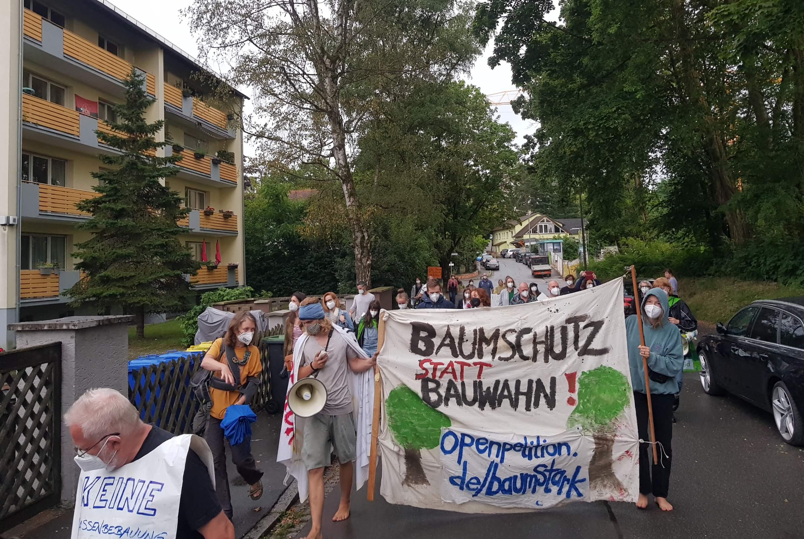 Etwa 50 Teilnehmende zeigten bei der Demonstration am Montag laut und kreativ, dass die Bäume geschützt werden müssen. Neben den Bürger:innen waren Fridays for Future, Parents for Future und der BUND Naturschutz – Ortsgruppe Nürnberger Süden aktiv. Artists for Future arrangierten Protesttafeln und Puppen in den Bäumen. Der BUND Naturschutz wies aktuell auf die große Bedeutung von Bäumen im Hochwasserschutz hin.