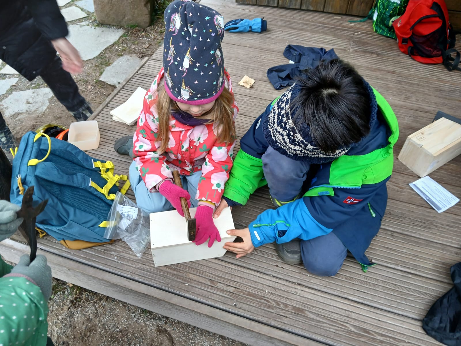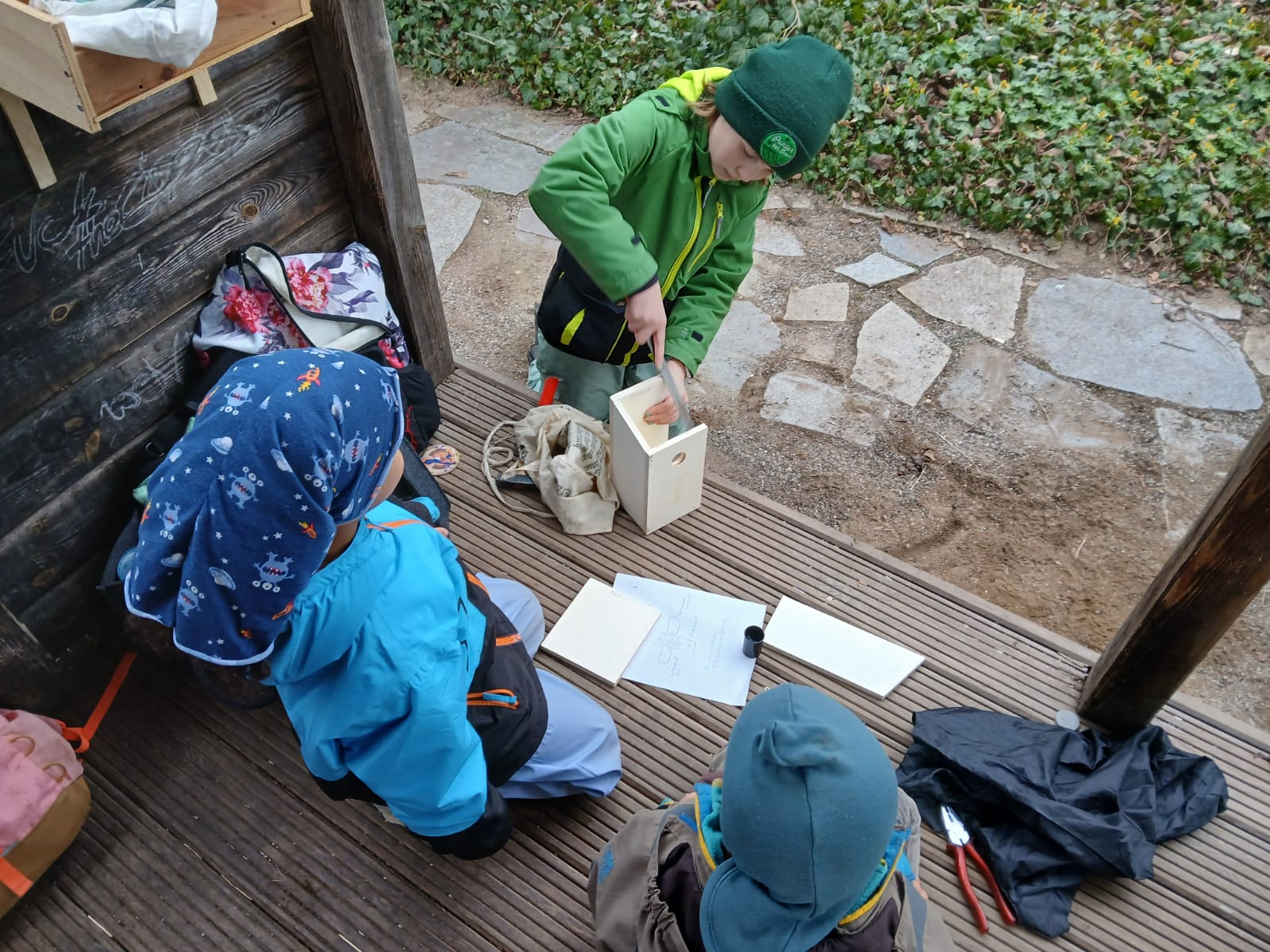 Am Ende soll ein kleines Vogelhäuschen entstehen. Nächstes Mal bauen wir es zu Ende und hängen es auf.