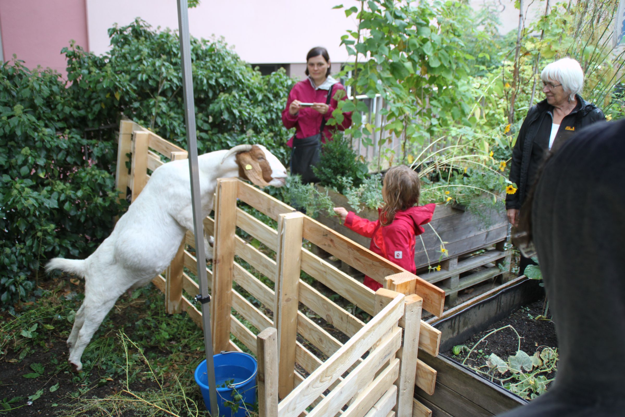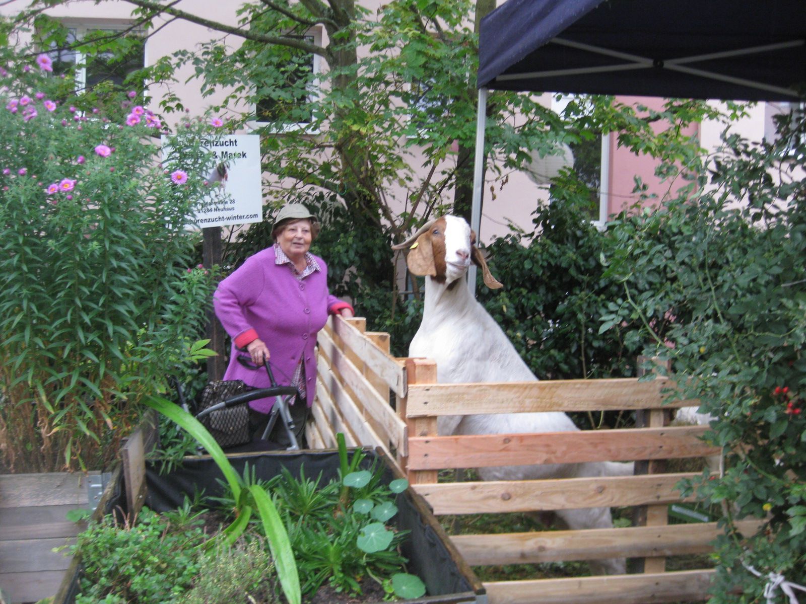 Die meisten waren sicher wegen der Burenziegen von Martin Winter aus Finstermühle gekommen. Die fühlten sich sichtlich wohl bei uns und machten sich erst einmal über Holunder, Vogelbeere und die Rose her – war sowieso zu viel Gestrüpp. Wir hatten ihnen ein Gatter gebaut, damit die guten Kräuter in den Beeten erhalten blieben – manche haben ihre Kräuter dann doch gern geopfert, um ein schönes Erinnerungsfoto machen zu können.