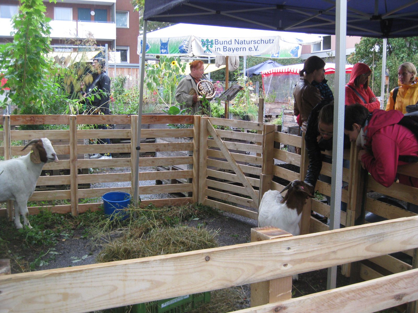 Aber auch unser kulturelles Programm war Publikumsmagnet. Wilfried Krüger, musikalischer Leiter der „Pegnitzschäfer Klangkonzepte“, hatte sein Horn mitgebracht und spielte mit Rossini, Messiaen etc. gegen den Regen an.