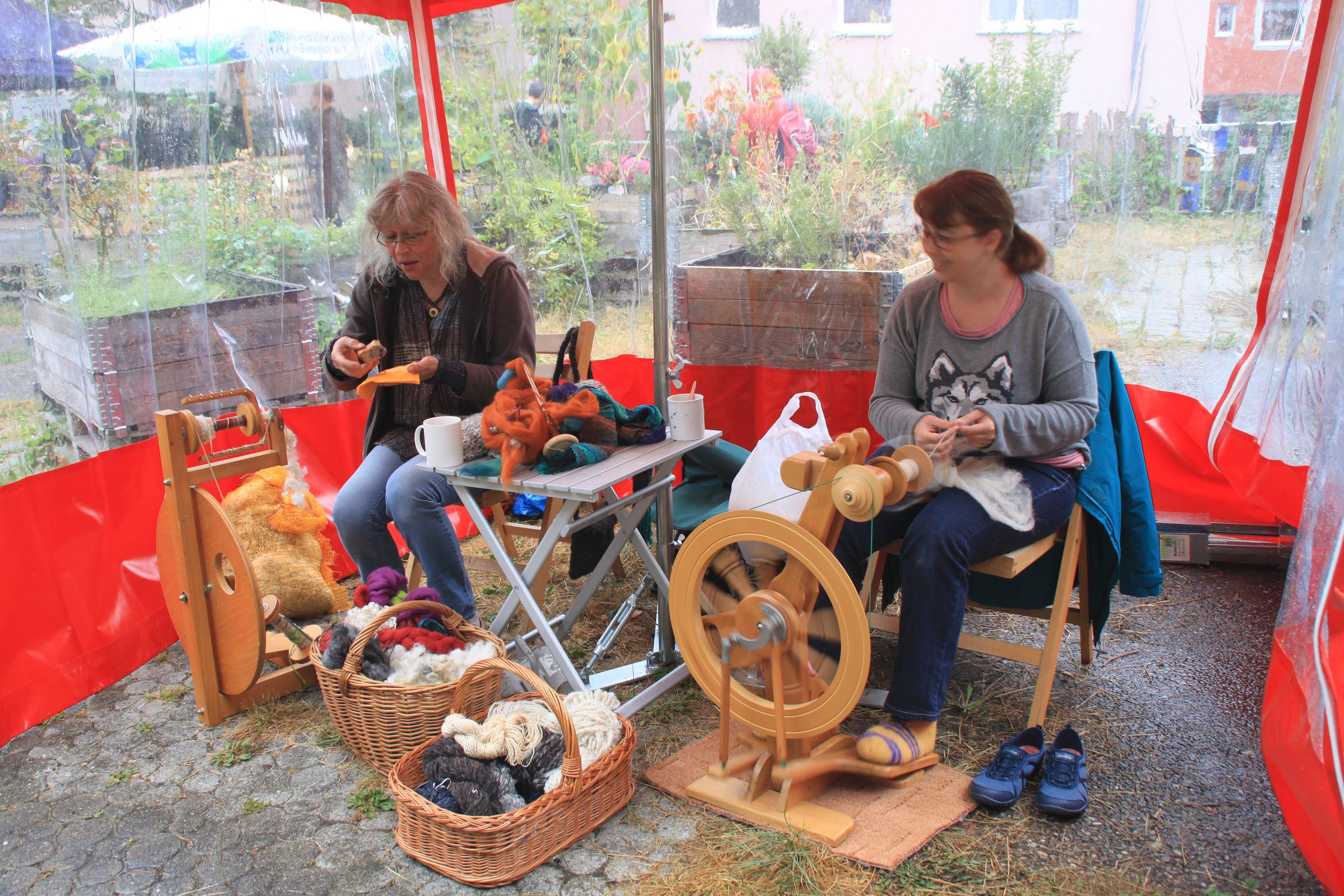 Aber auch sonst gab es einiges zu erleben. Zwei Spinnerinnen hatten ihre Spinnräder und Spindeln mitgebracht, spannen um die Wette und erklärten den Zuschauern, wie man das macht. Ab und zu traute sich sogar jemand, es selbst zu versuchen.