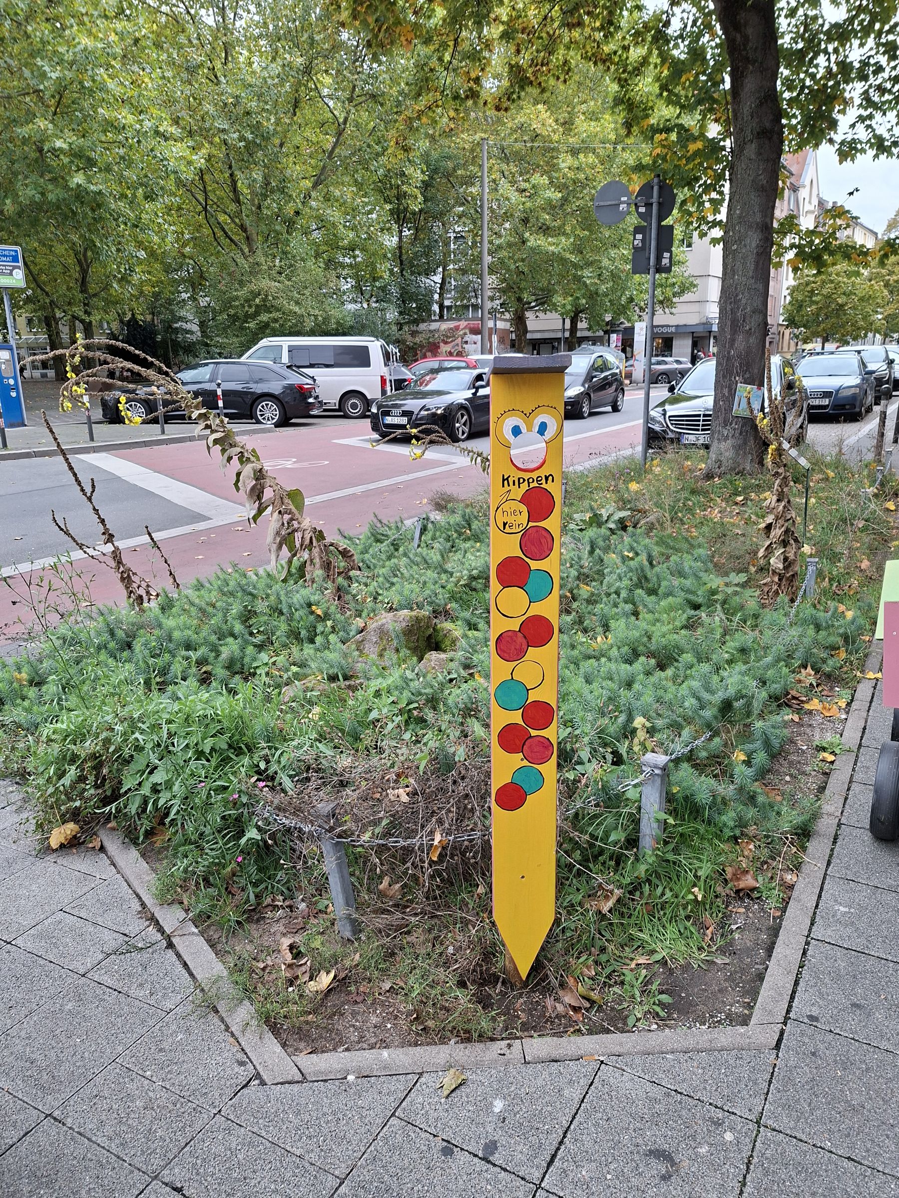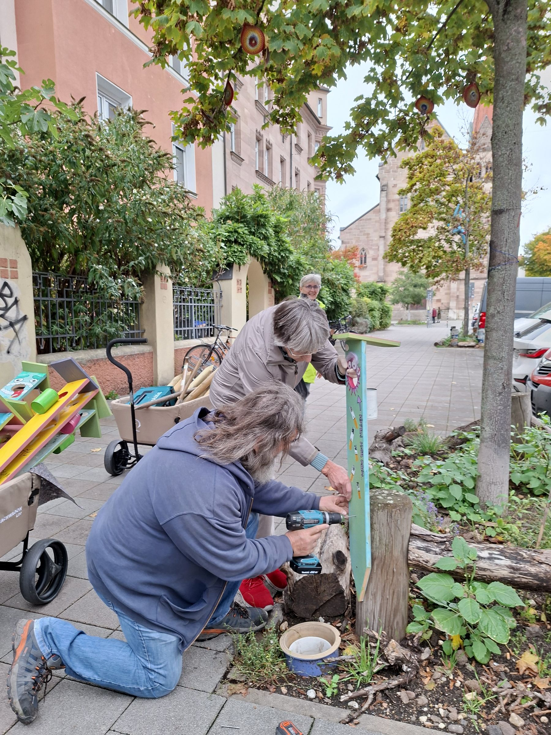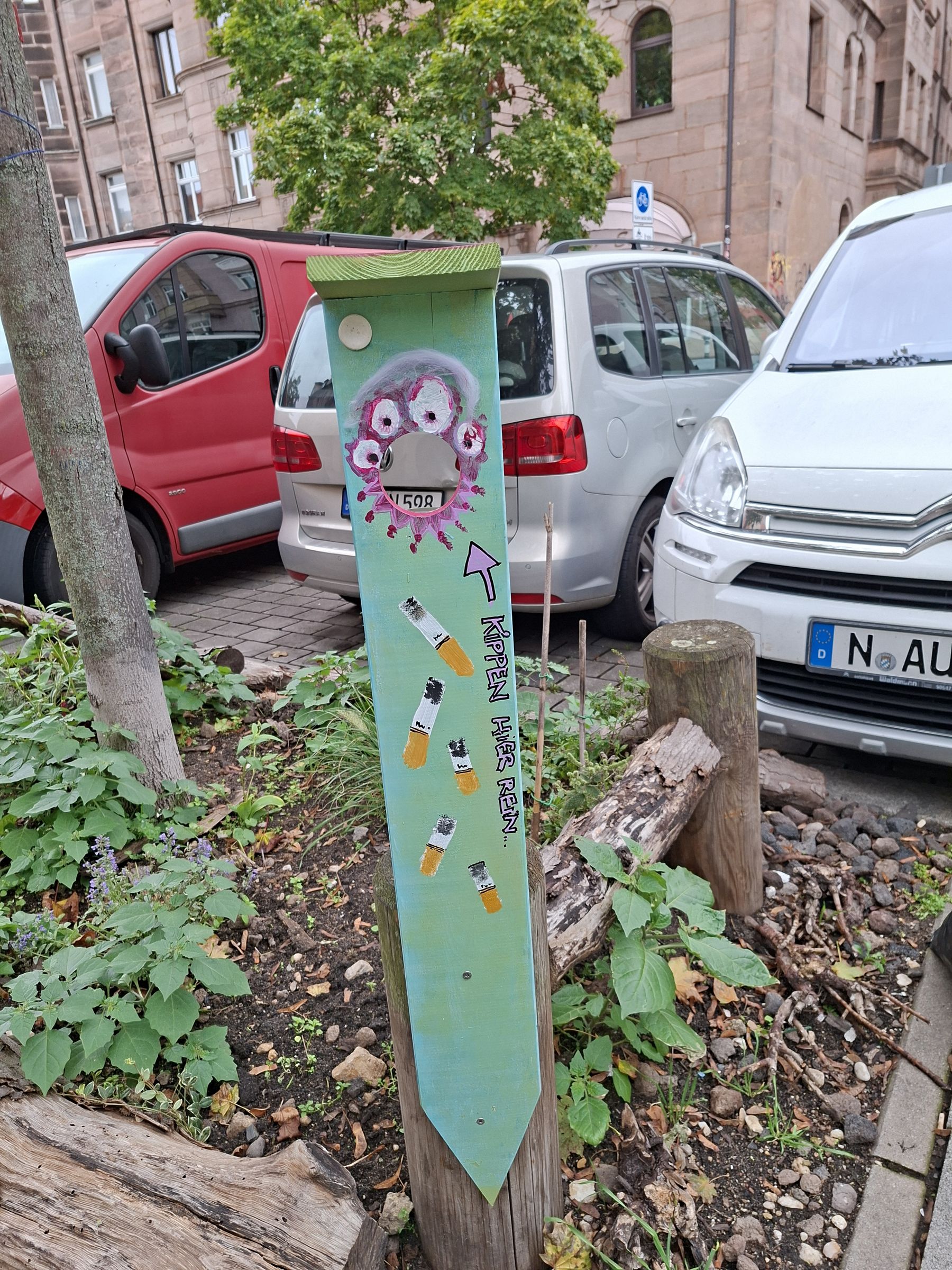 Am Folgetag ging es weiter. BUND Naturschutz, Zentrum Aktiver Bürger und die KomVorzone zogen los, um die Südstadt um bunte Kippenfresser zu bereichern und vor der Kippenflut zu retten. Selbst die Umweltreferentin Britta Walthelm griff zwischen zwei Terminen zum schweren Hammer und klopfte in der Endterstraße Pfosten als Halterung in den harten Boden.