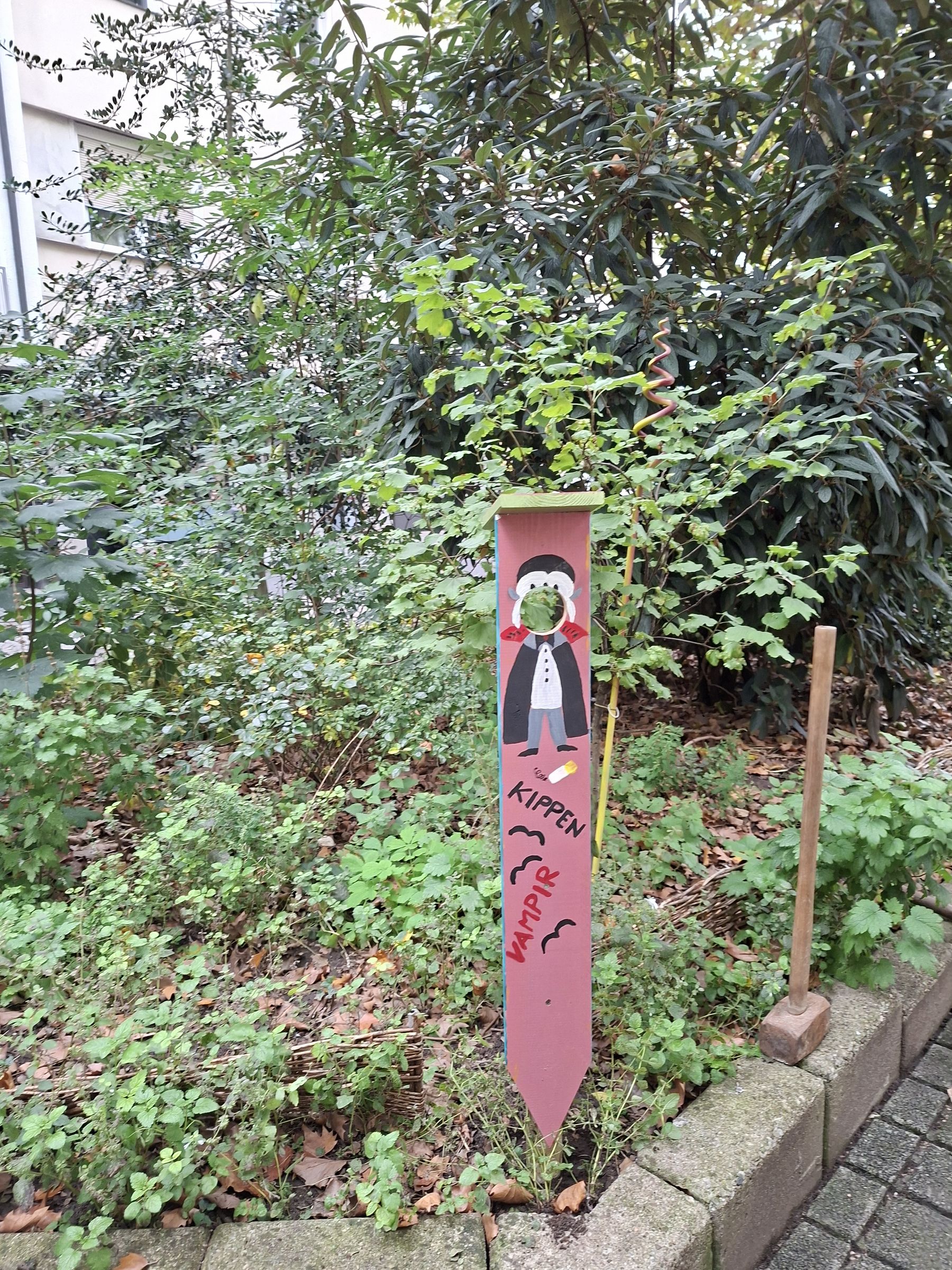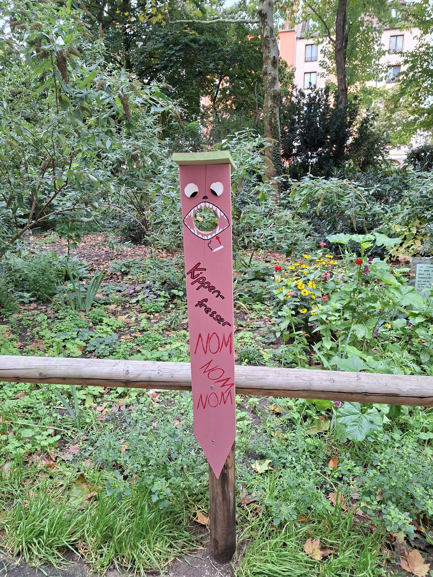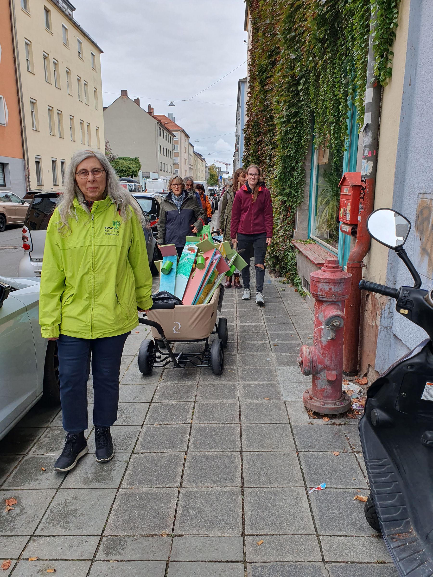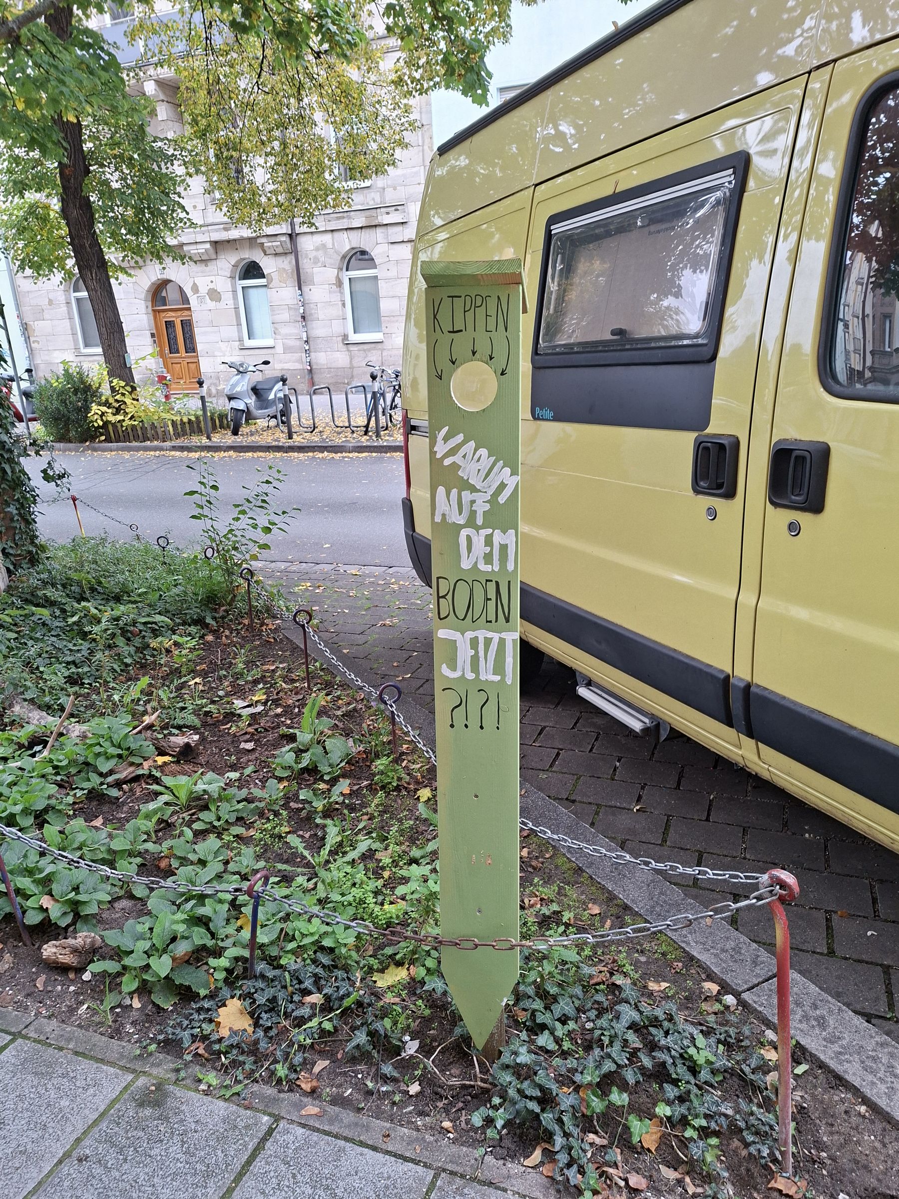 Am Folgetag ging es weiter. BUND Naturschutz, Zentrum Aktiver Bürger und die KomVorzone zogen los, um die Südstadt um bunte Kippenfresser zu bereichern und vor der Kippenflut zu retten. Selbst die Umweltreferentin Britta Walthelm griff zwischen zwei Terminen zum schweren Hammer und klopfte in der Endterstraße Pfosten als Halterung in den harten Boden.