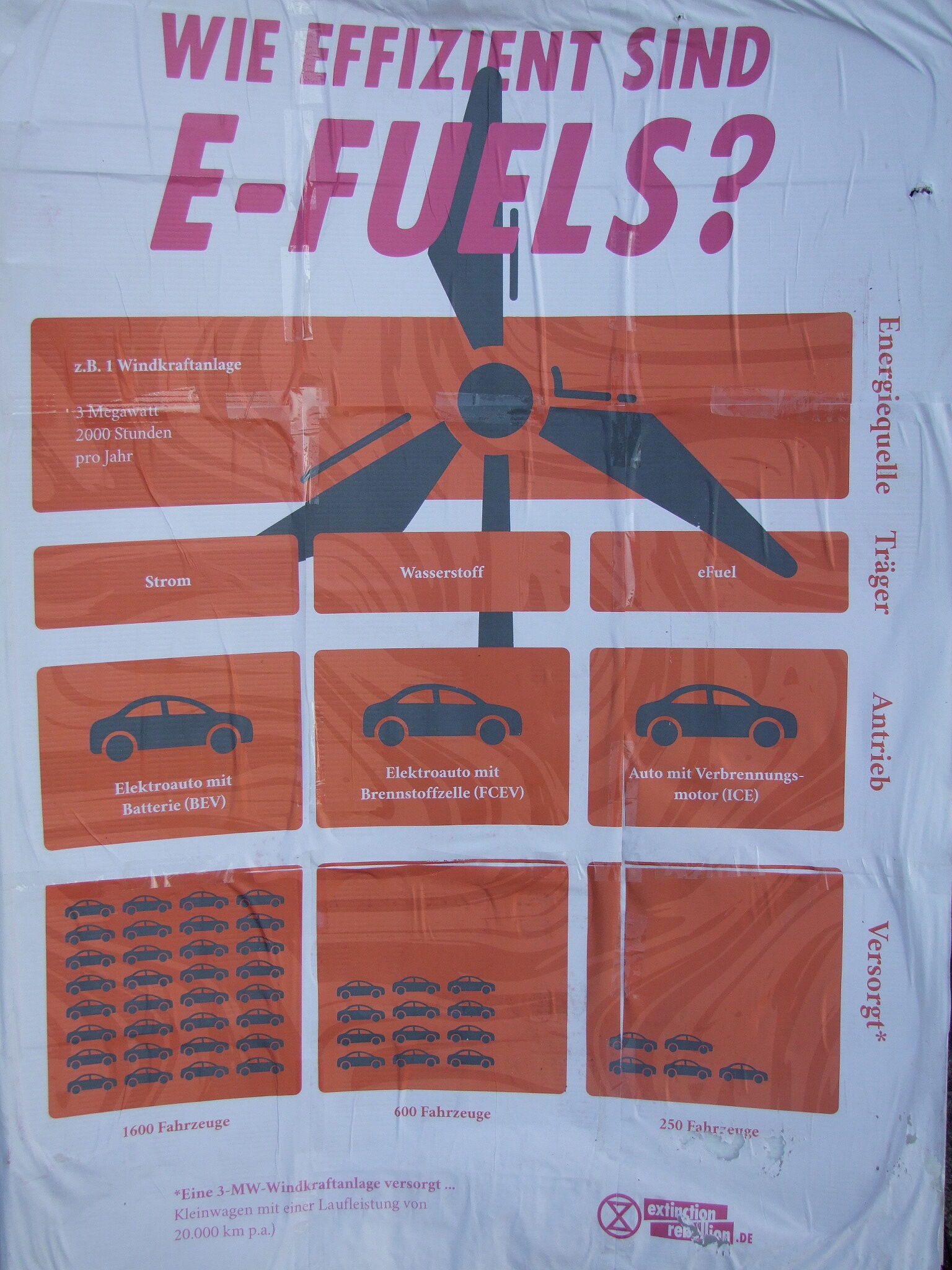 Die Politik lässt sich davon bislang größtenteils wunschgemäß beeindrucken und von blumigen Worten hinters Licht führen. Zwar können E-Fuels als CO2-frei gelten, wenn sie mit regenerativer Energie hergestellt werden. Aber da der Wirkungsgrad bei mit E-Fuels betriebenen Autos extrem schlecht ist, ist das eine unverantwortliche Energieverschwendung. Eine Vergleichsdarstellung zeigte den Irrsinn auch grafisch: Die Energie, mit der mehr als sechs Elektro-Kfz betrieben werden können, reicht gerade einmal für ein einziges E-Fuel-Kfz! Die Idee von mit E-Fuels angetriebenen Kraftfahrzeugen ist daher pervers, solange wir keinen Überschuss an erneuerbarer Energie haben, sondern fossile Kraftwerke betreiben und sogar zur Abwendung von Energiemangel neue Gaskraftwerke bauen wollen.