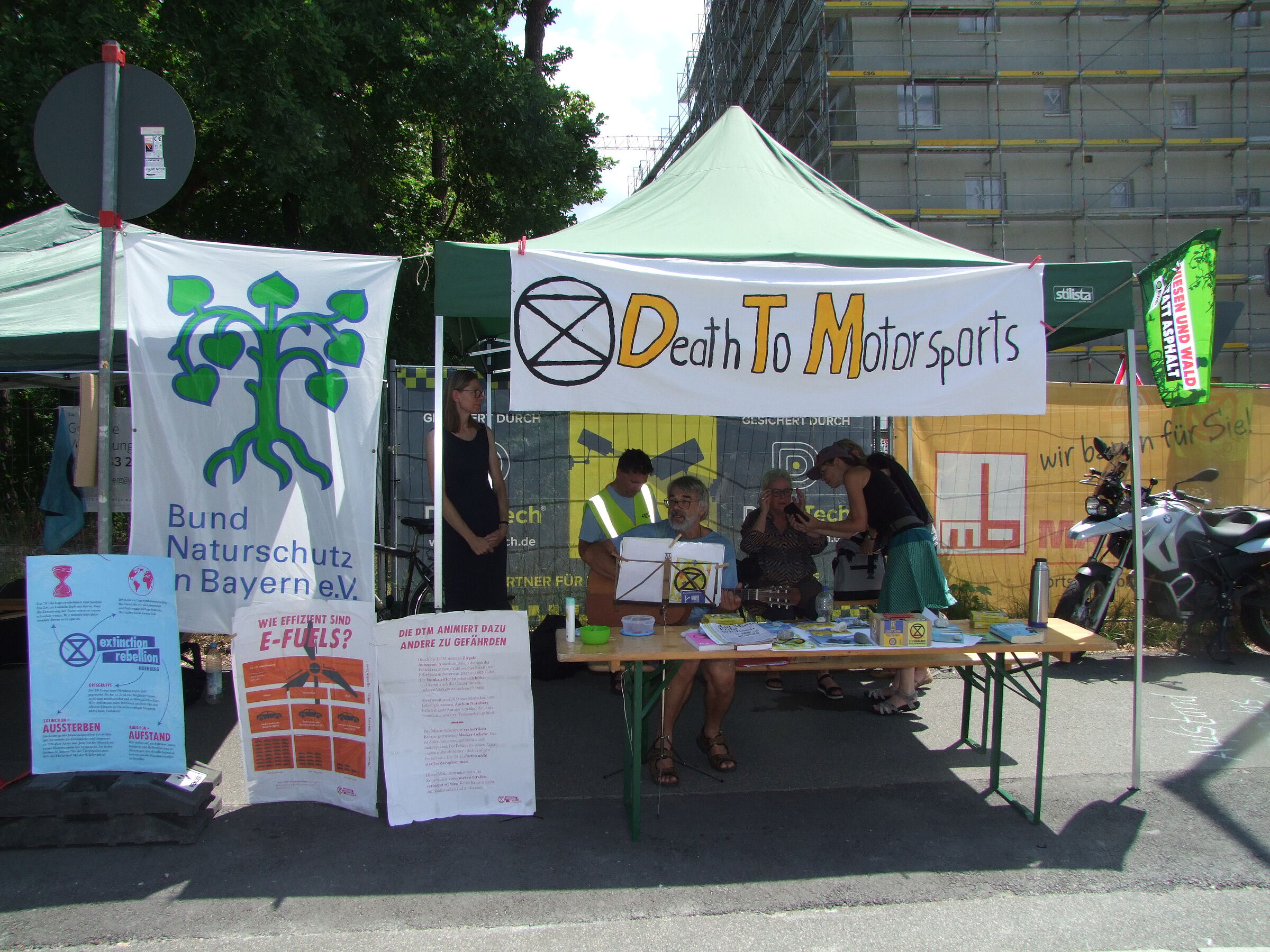 Die Rennveranstalter propagieren synthetische Kraftstoffe (E-Fuels) als zukunftsfähige und angeblich klimafreundliche Lösung. Dass die DTM hier nicht nur Greenwashing betreibt, sondern auch ein Märchen als „grüne Technik" bewirbt, machten unsere Plakate an der Mahnwache schon am Morgen des Rennsonntags deutlich. Dieser dekadenten Technik zum Durchbruch bzw. zu Marktfähigkeit zu verhelfen, ist eine der wichtigen Aufgaben der DTM – wie auf der Veranstalter-Webseite ersichtlich: