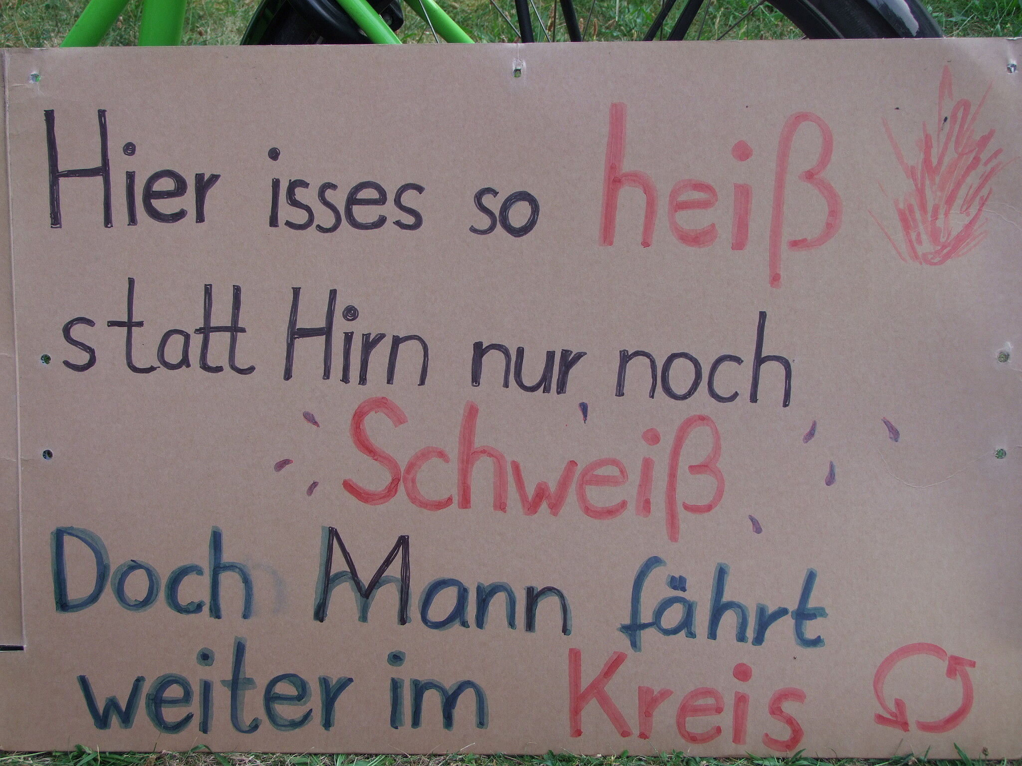 Dann startete unsere bunte Fahrraddemo, die uns mit Geklingel und passenden Songs in einer großen und einer kleinen Runde zwei Mal um die Rennstrecke führte. Als wir bei der Rennstrecken-Unterquerung in der Hans-Kalb-Straße das über uns einsetzende Motorengeheul imitierten, schienen wir uns sogar mit manchen Motosport-Fans einig: Einige riefen: „Ist das nicht peinlich?“ Sie ernteten volle Zustimmung etlicher Demo-Teilnehmerinnen, denen in heutiger Zeit diese spezielle Form maskuliner Übertrumpfung extrem unangemessen erscheint.