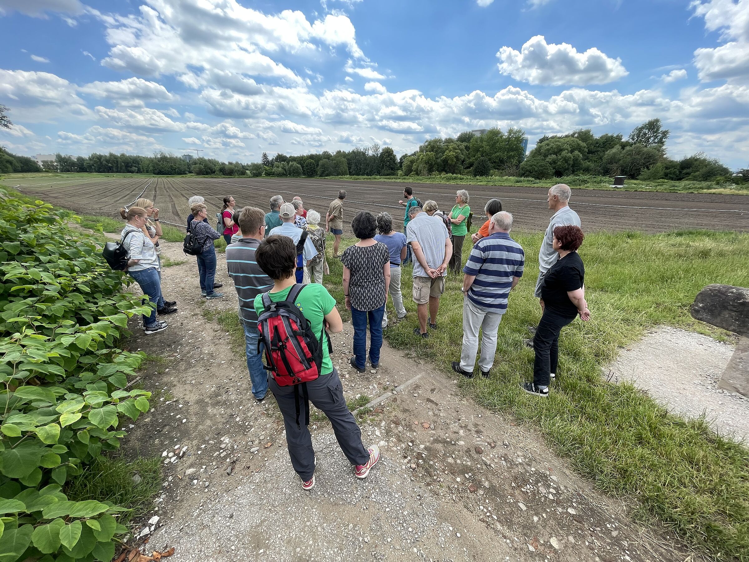 Im Talraum des Wetzendorfer Landgrabens konnte die Gruppe ein Kiebitzpaar beobachten, das lautstark versuchte, einen Mäusebussard zu vertreiben. Auch sonst ist das Gebiet östlich und südlich des BFW an Pflanzen und Tieren sehr artenreich und dient als Rückzugsort für zahlreiche stark gefährdete und/oder streng geschützte Arten. Dass dieses an Biodiversität sehr reiche und besondere Gebiet im Knoblauchsland nach dem Willen der Stadt Nürnberg der Bebauung zum Opfer fallen soll, stieß auf sehr großes Unverständnis bei den Teilnehmerinnen und Teilnehmern. In Zeiten des Klimawandels und des Artensterbens ist es nicht mehr nachvollziehbar, warum ein aus Sicht des Naturschutzes so bedeutsamer Teil des Knoblauchslands stattdessen nicht geschützt wird. Für Mensch, Tier, Natur und Umwelt wäre dies ein sehr großer Gewinn.