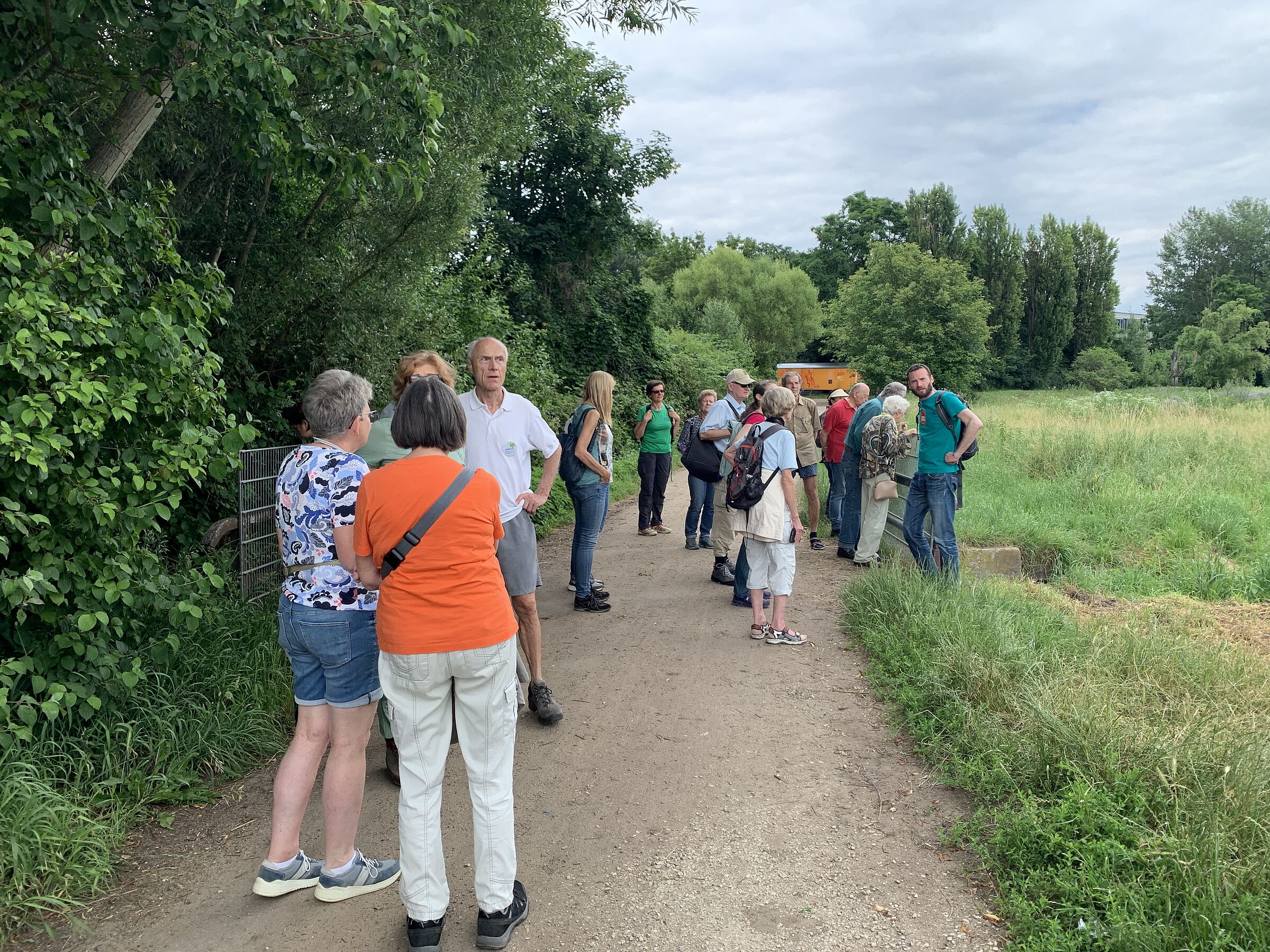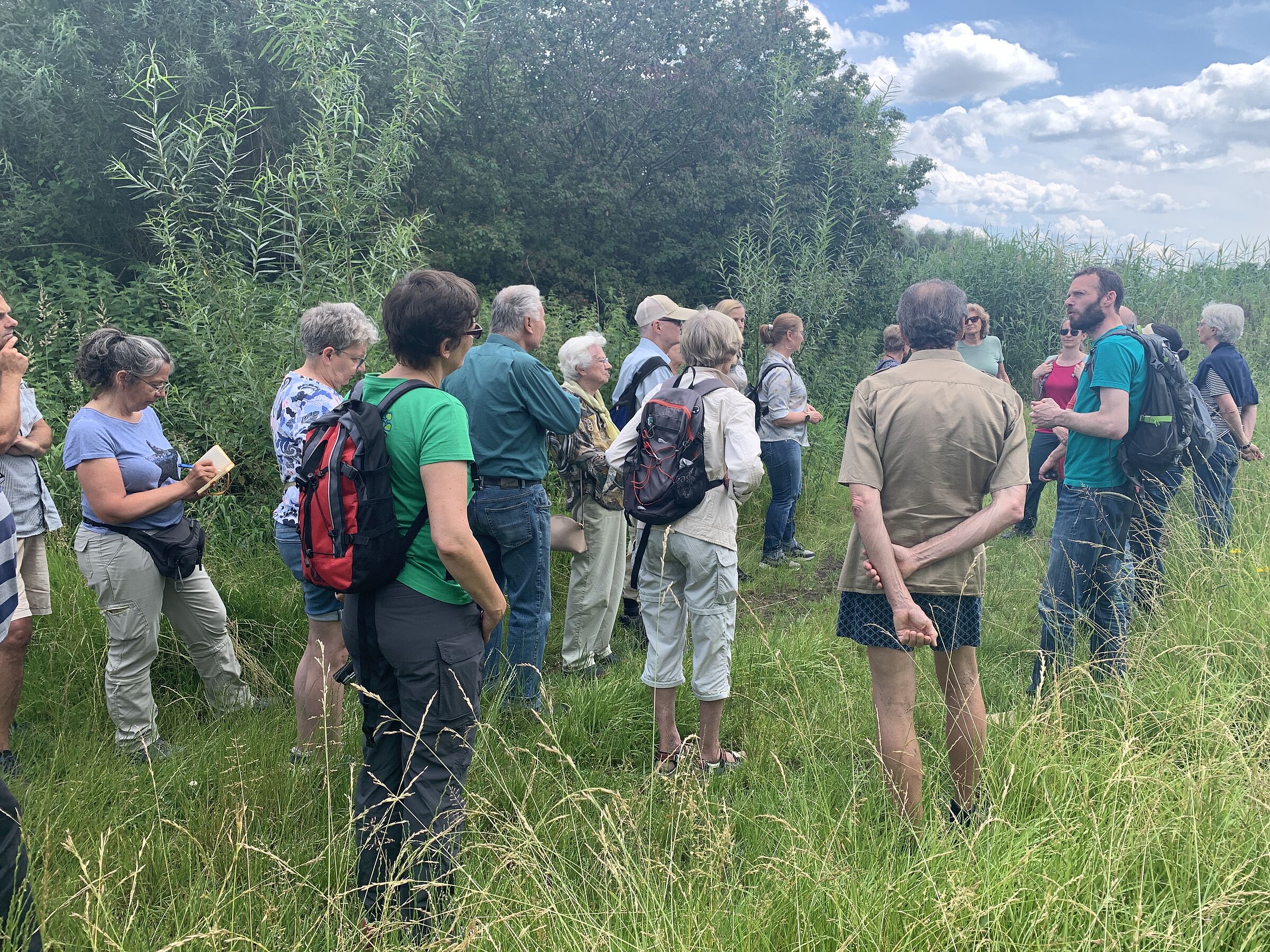 Bei angenehmen Temperaturen startete die Gruppe vor dem Haupteingang des Berufsförderungswerks (BFW), wo der Seegraben in den letzten verbliebenen Teich auf dem Gelände des BFW fließt, bevor er dort am östlichen Rand wieder austritt und Richtung Süden fließt. Die Tour führte durch das sehr feuchte Gelände östlich des BFW mit Ackerflächen, die durch verschiedene Gehölzstrukturen u. a. mit Sal-Weiden und Silber-Weiden gegliedert sind und einen Biotopverbund bilden. Der geschützte Landröhricht mit an die zwei Meter Höhe ist hier ebenfalls in einem sehr feuchten Bereich vertreten.