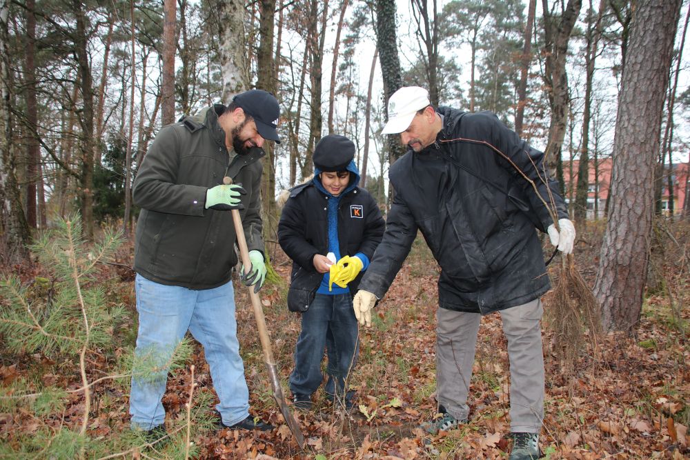 Der BUND Naturschutz legt bei Kornburg nicht nur bunte Blühflächen an. Zu einem der Sandmagerrasen gehört auch ein größeres Waldstück. Ein Orkan und das rasche Waldsterben hatten den Kiefernforst in den letzten Jahren sehr ausgedünnt. Gemeinsam mit etlichen Firmenteams hat der BUND Naturschutz den Wald daraufhin eingezäunt und erste Bäume gesetzt. Nun wurde in Zusammenarbeit mit der Nürnberger Ahmadiyya-Gemeinde weiter aufgeforstet. Der BUND Naturschutz setzt dabei auf robuste heimische Laubgehölze wie Feld-Ulme, Winter-Linde und Hainbuche. Auch etliche Esskastanien wurden gepflanzt. Die Ahmadiyya Muslim Jamaat unterstützte den BN nicht nur mit zahlreichen Helfern, sondern spendete auch 500 € für die Jungpflanzen.