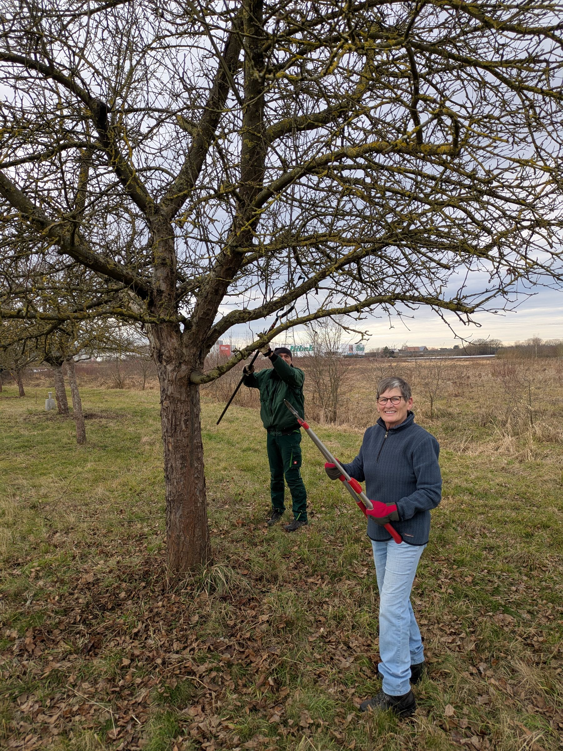 Bei zehn Grad und trockenem Wetter ließ es sich gut arbeiten. Wir entfernten vor allem die Schösslinge, die reichlich aus dem Boden ausgetrieben hatten. Bei einigen der verwilderten Bäume wurde der Schnitt begonnen. Es wartet aber noch reichlich Arbeit auf uns, um die Bäume wieder in Form zu bringen. Unterstützt werden wir seit Neuestem von einer gelernten Obstbaumwartin.