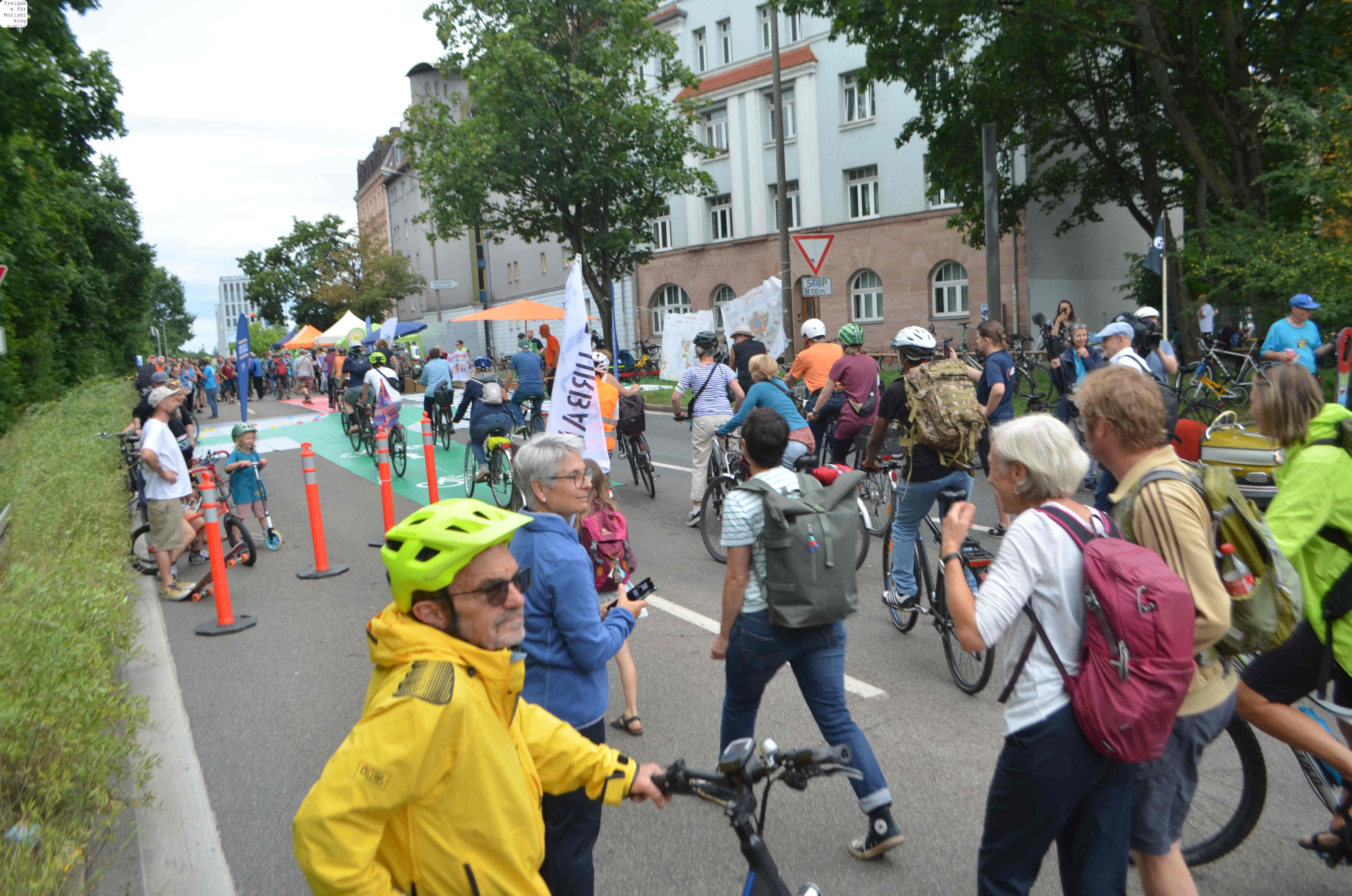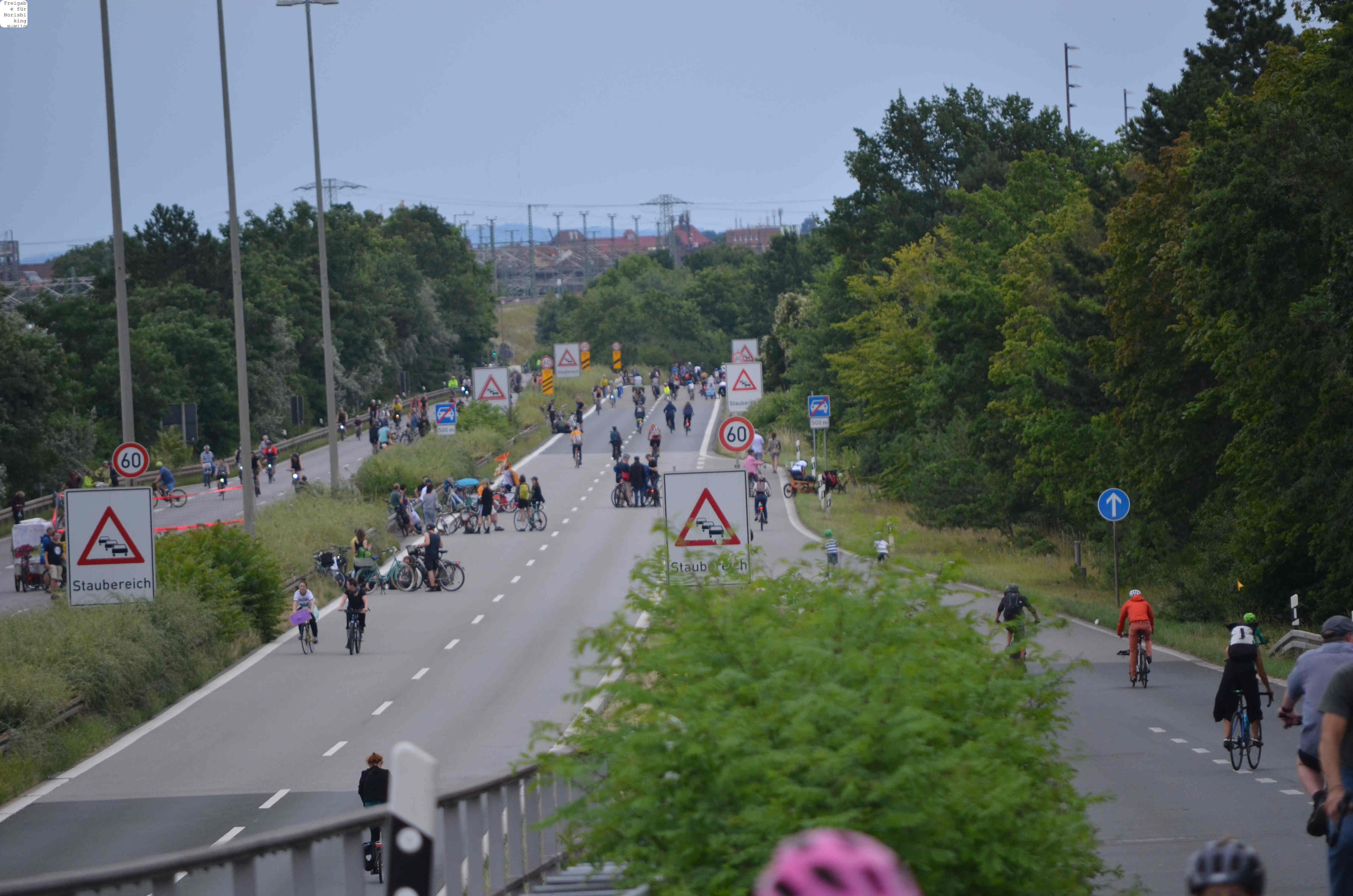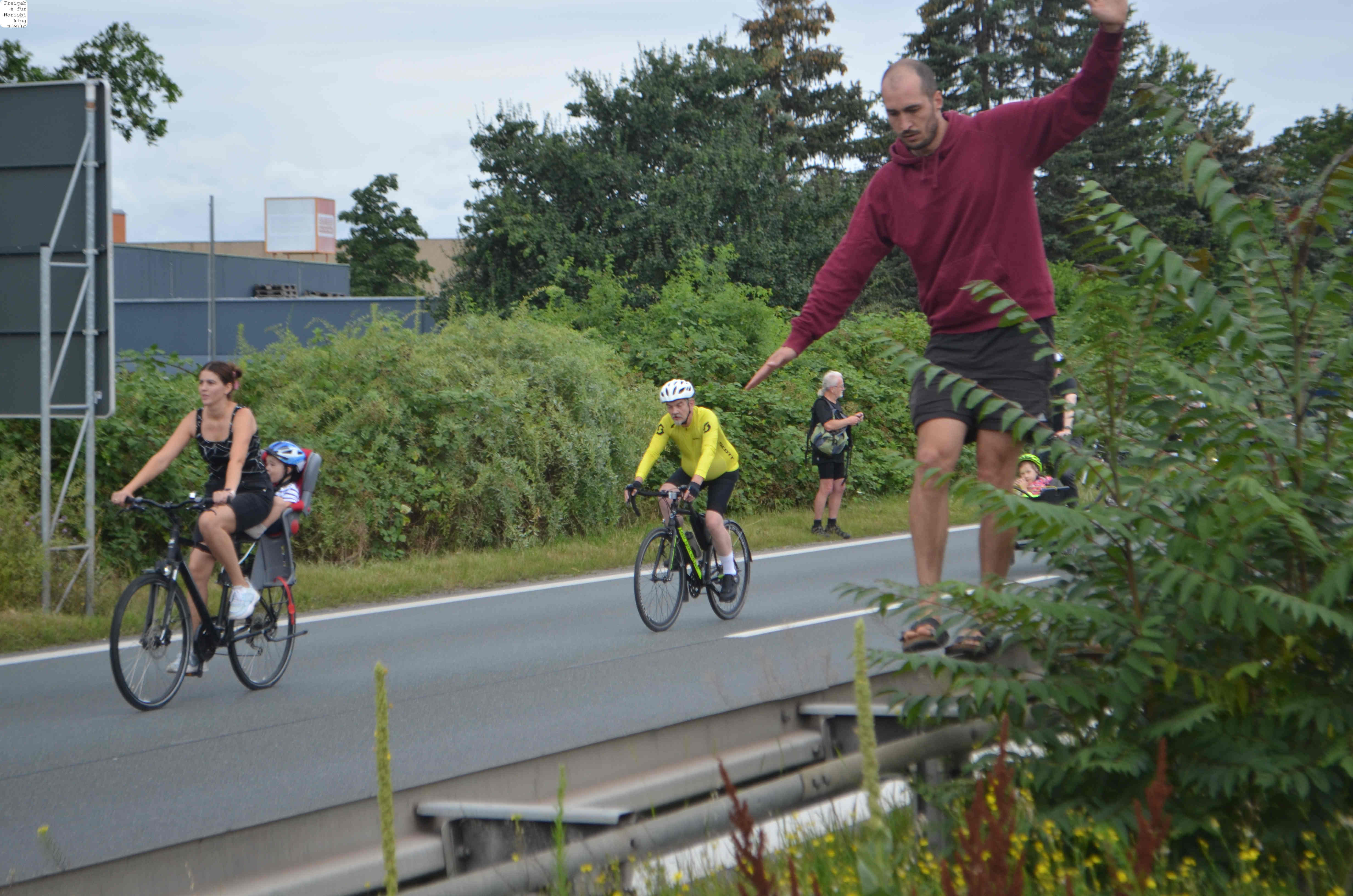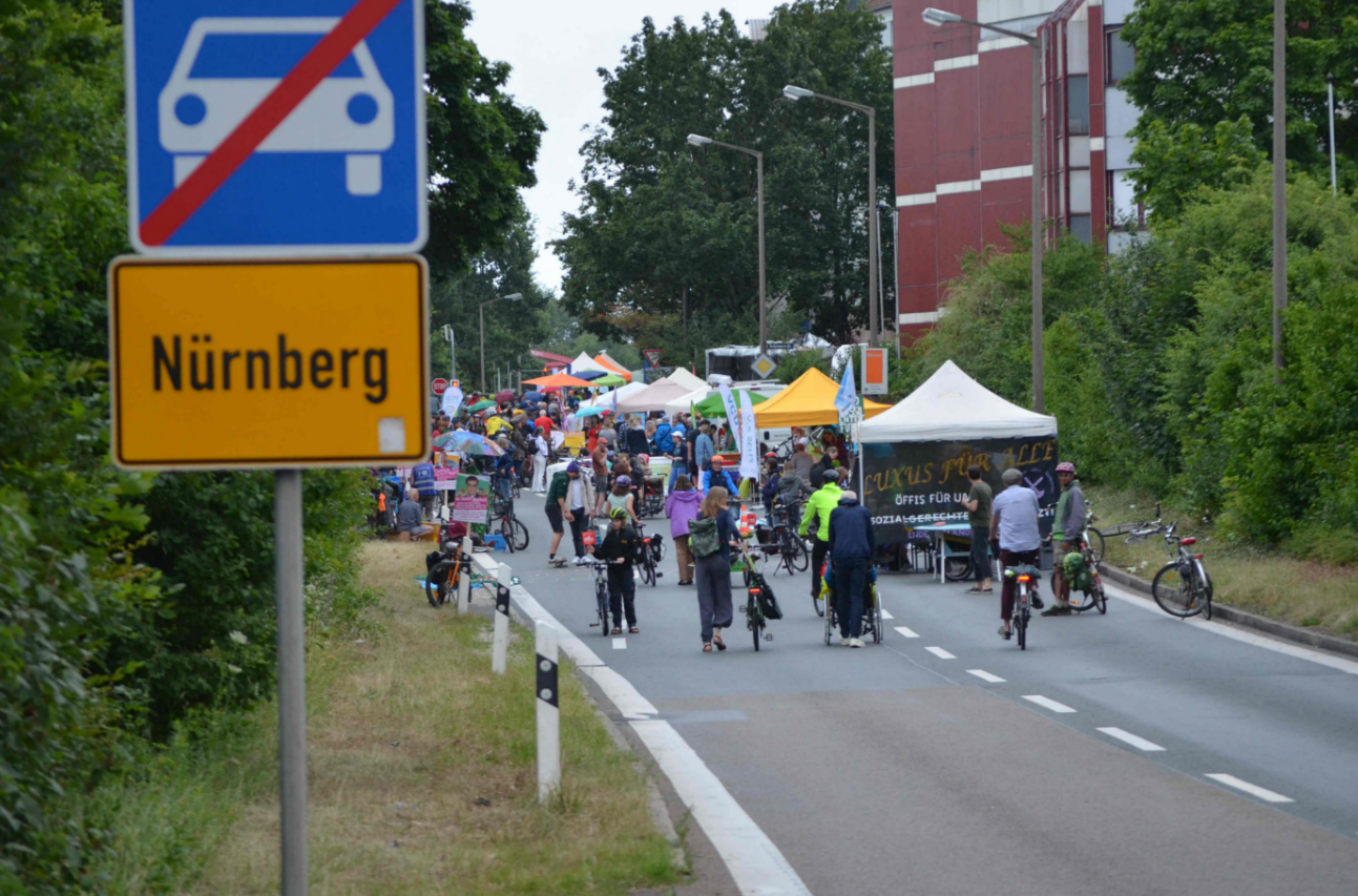 Jegliche Diskussion bereits im Keim zu ersticken, den Stadtrat ungeniert als kostenlose Werbebühne missbrauchen, beschränkt die öffentliche und politische Willensbildung. Der Bedarf größerer Aktionen, um einen offenen und demokratischen Diskurs voranzubringen, war daher offensichtlich. So entstand die Idee eines ausgiebigen Runden-Radelns für das Aus der Norisring-Rennen. Da der Norisring trotz der frühzeitigen Versammlungsanmeldung schon im August 2023 nicht zur Verfügung gestellt wurde, musste das sich bildende große Aktionsbündnis auf den Frankenschnellweg ausweichen, wodurch die Ausbau-KritikerInnen auch gleich mit im Boot waren. Dort fand nun am ersten Juli-Wochenende gesundes, klimafreundliches und inklusives Runden-Drehen statt – für ein lebenswertes Nürnberg. Und für eine nachhaltige Stadtentwicklung, bei der die Klimaanpassung und die Mobilitätswende, also wesentliche Grundlagen für die Zukunft Nürnbergs, zentral sind.