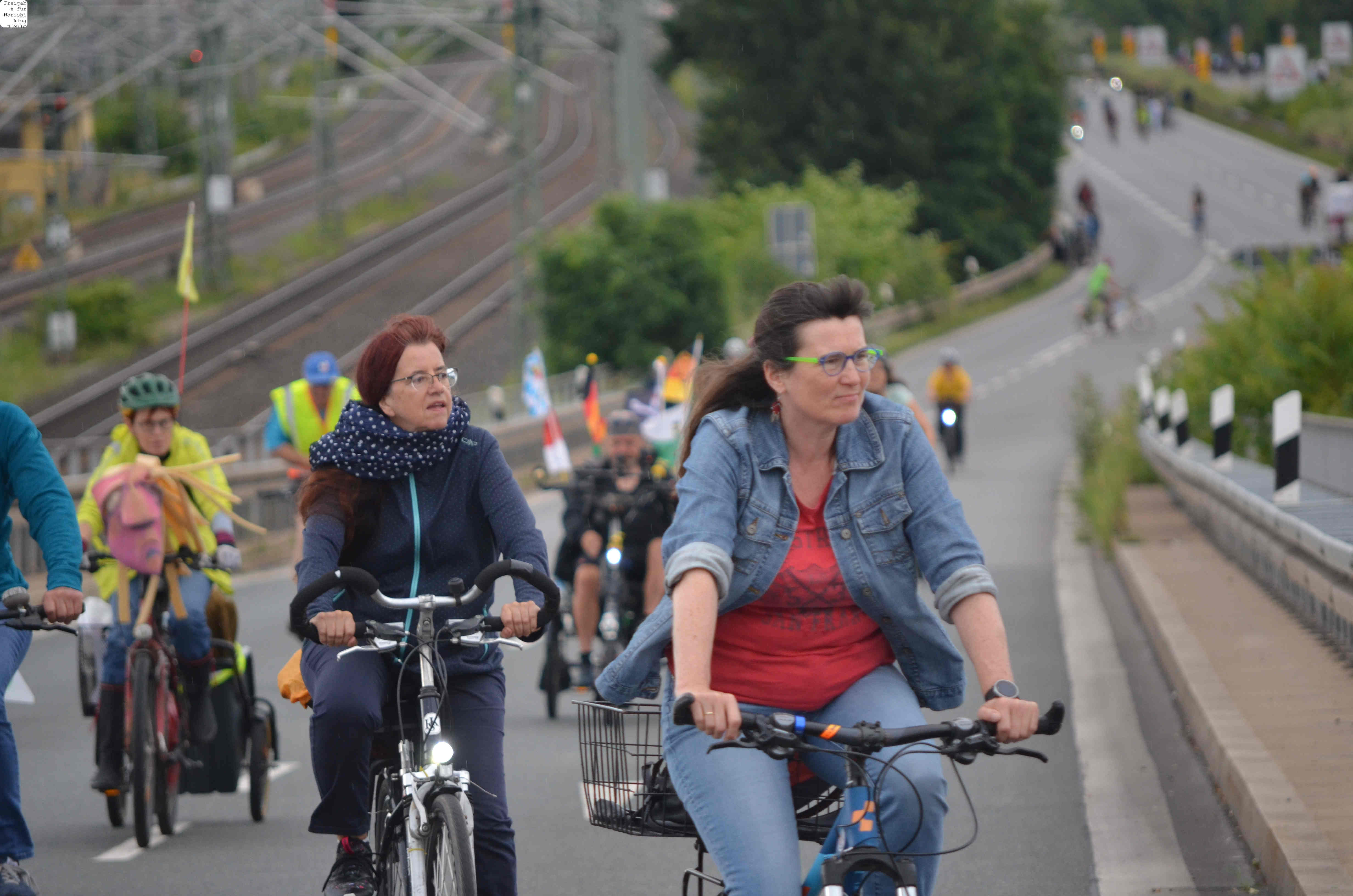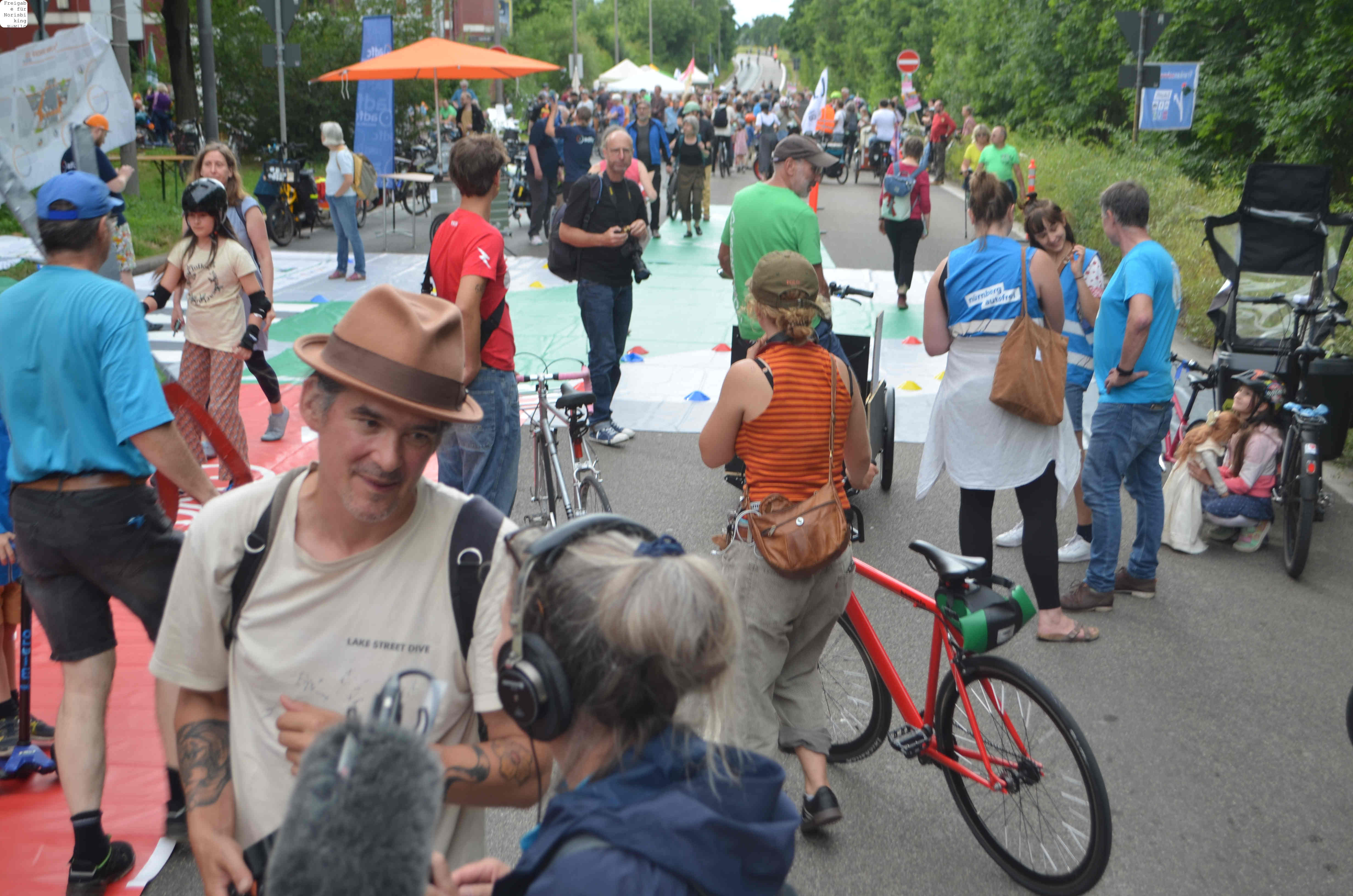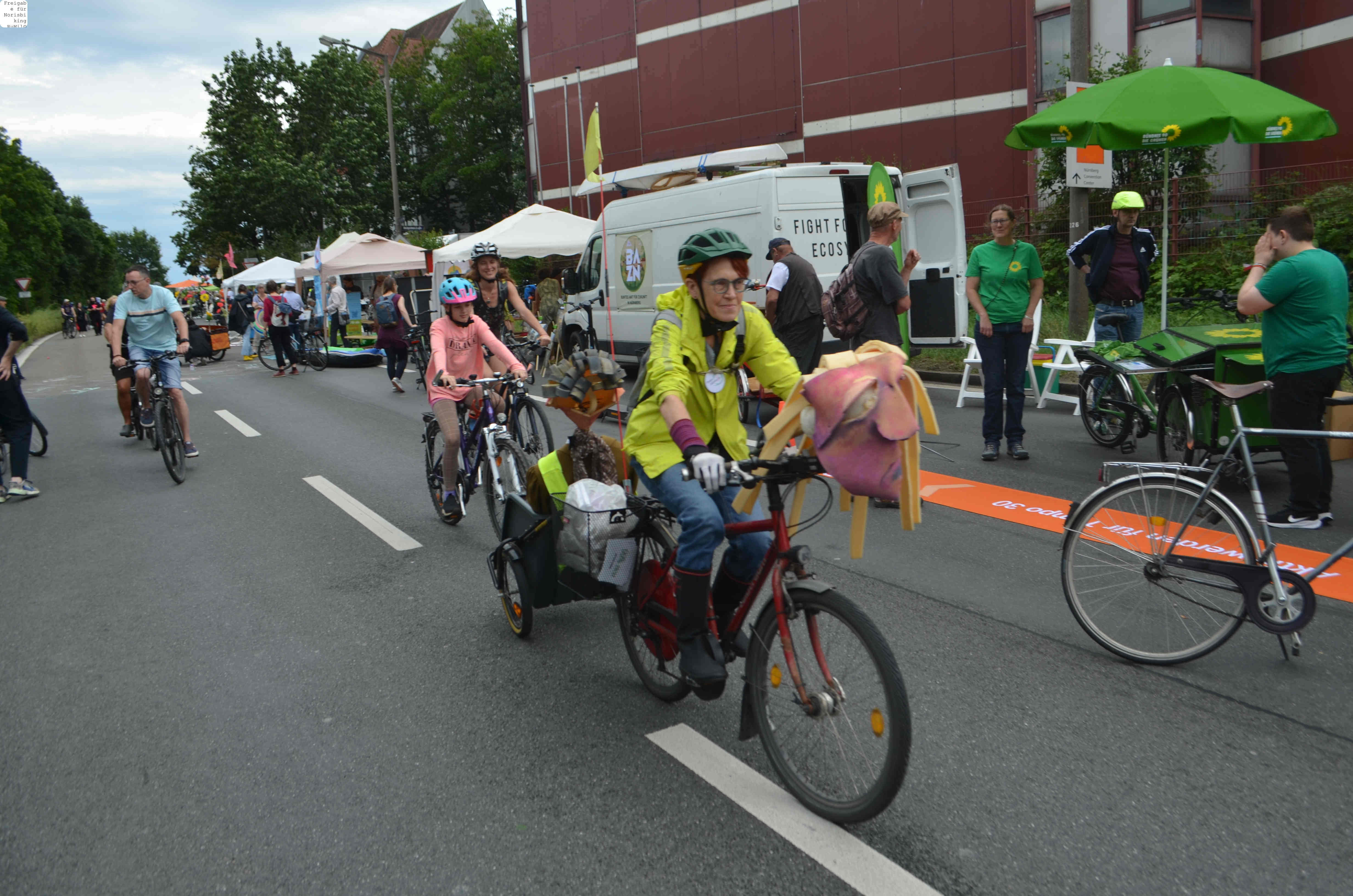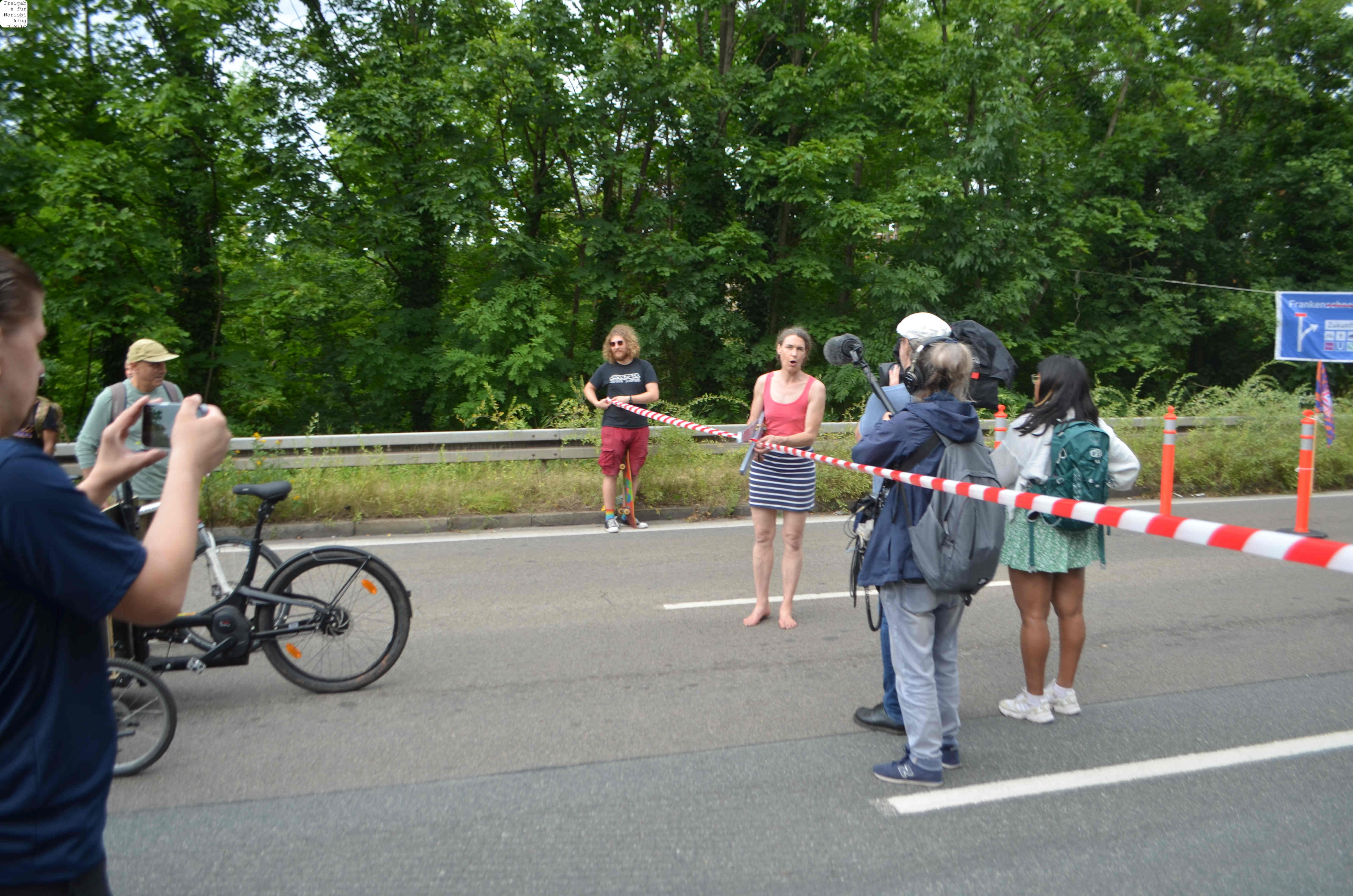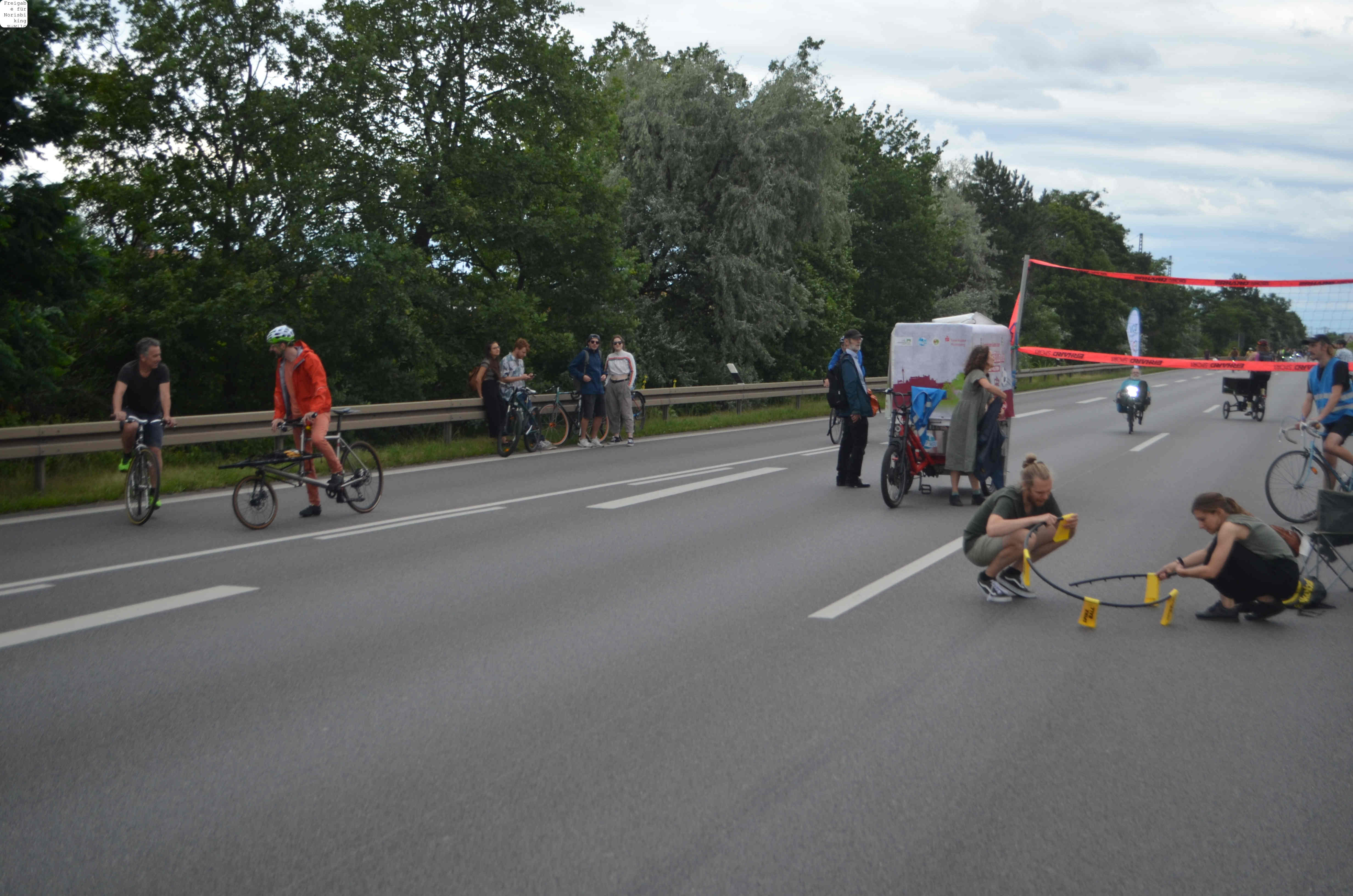 Jegliche Diskussion bereits im Keim zu ersticken, den Stadtrat ungeniert als kostenlose Werbebühne missbrauchen, beschränkt die öffentliche und politische Willensbildung. Der Bedarf größerer Aktionen, um einen offenen und demokratischen Diskurs voranzubringen, war daher offensichtlich. So entstand die Idee eines ausgiebigen Runden-Radelns für das Aus der Norisring-Rennen. Da der Norisring trotz der frühzeitigen Versammlungsanmeldung schon im August 2023 nicht zur Verfügung gestellt wurde, musste das sich bildende große Aktionsbündnis auf den Frankenschnellweg ausweichen, wodurch die Ausbau-KritikerInnen auch gleich mit im Boot waren. Dort fand nun am ersten Juli-Wochenende gesundes, klimafreundliches und inklusives Runden-Drehen statt – für ein lebenswertes Nürnberg. Und für eine nachhaltige Stadtentwicklung, bei der die Klimaanpassung und die Mobilitätswende, also wesentliche Grundlagen für die Zukunft Nürnbergs, zentral sind.