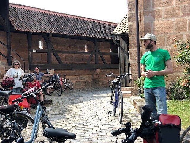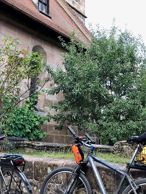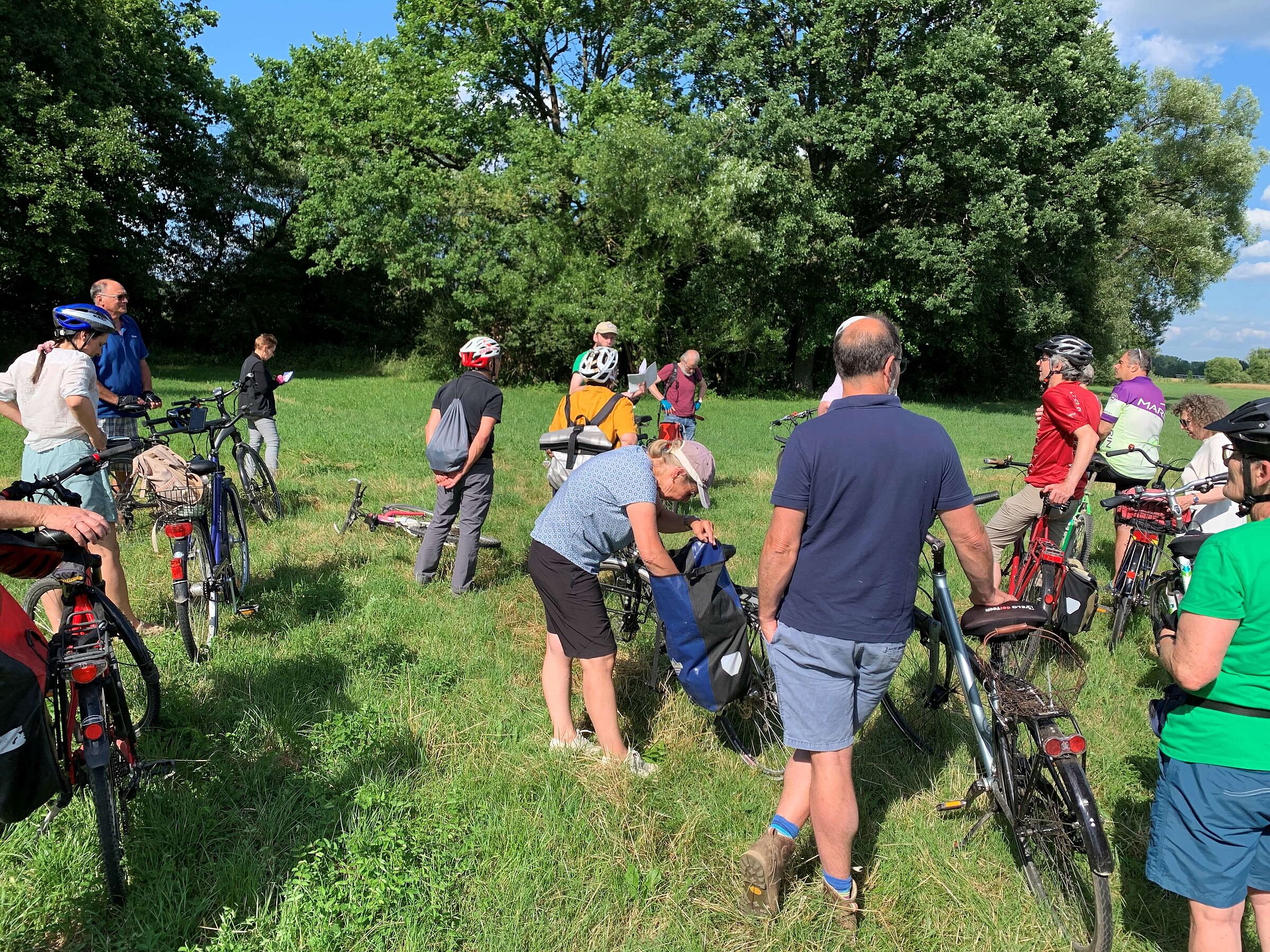 Am Treffpunkt Wehrkirche St. Georg in Nürnberg-Kraftshof traf sich eine respektable Radfahrergemeinde. Unter dem Schutz des Drachenbezwingers und Nothelfers (heiliger Georg), dem auch Beihilfe für gutes Wetter zugeschrieben wird, leitete Dirk Richter uns durch das Gründlachtal mit Irrhain und Kraftshofer Forst zu den Nasswiesen im östlichen Teil des Landschaftsschutzgebiets.
