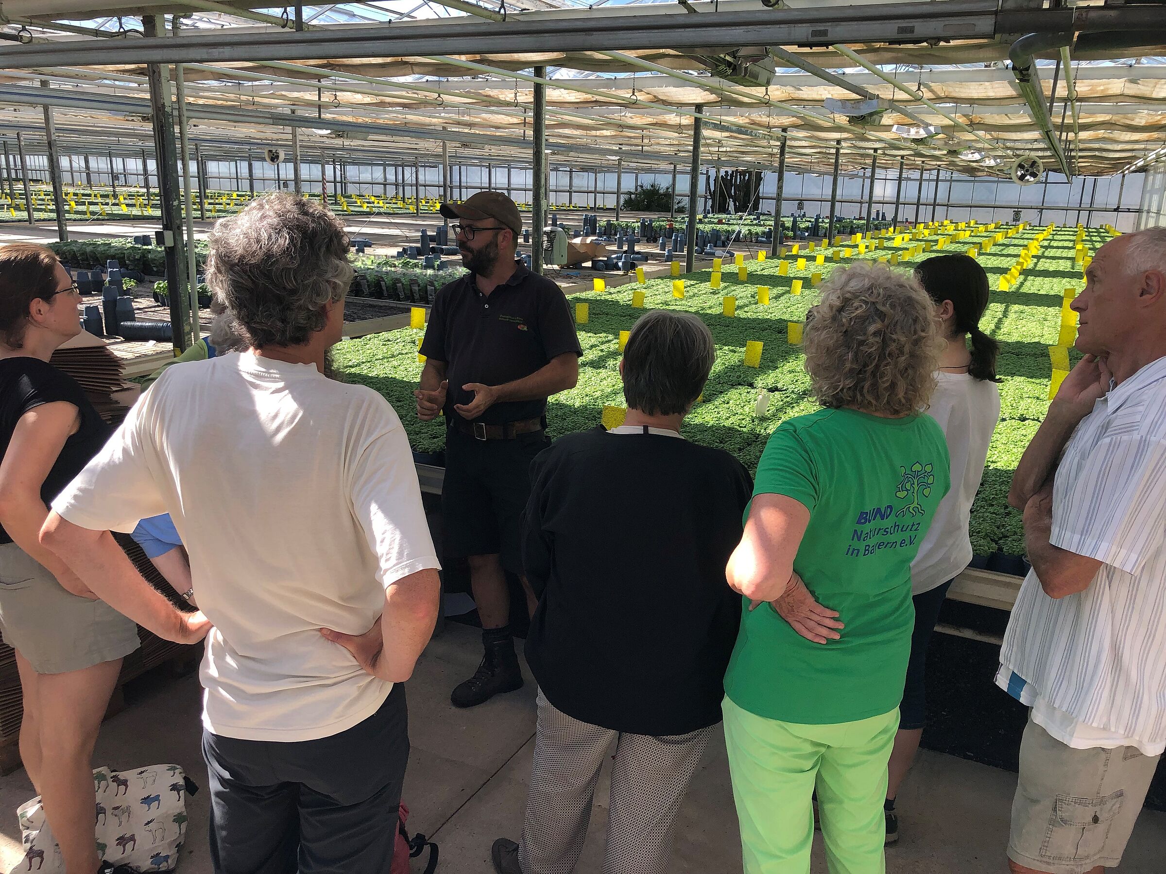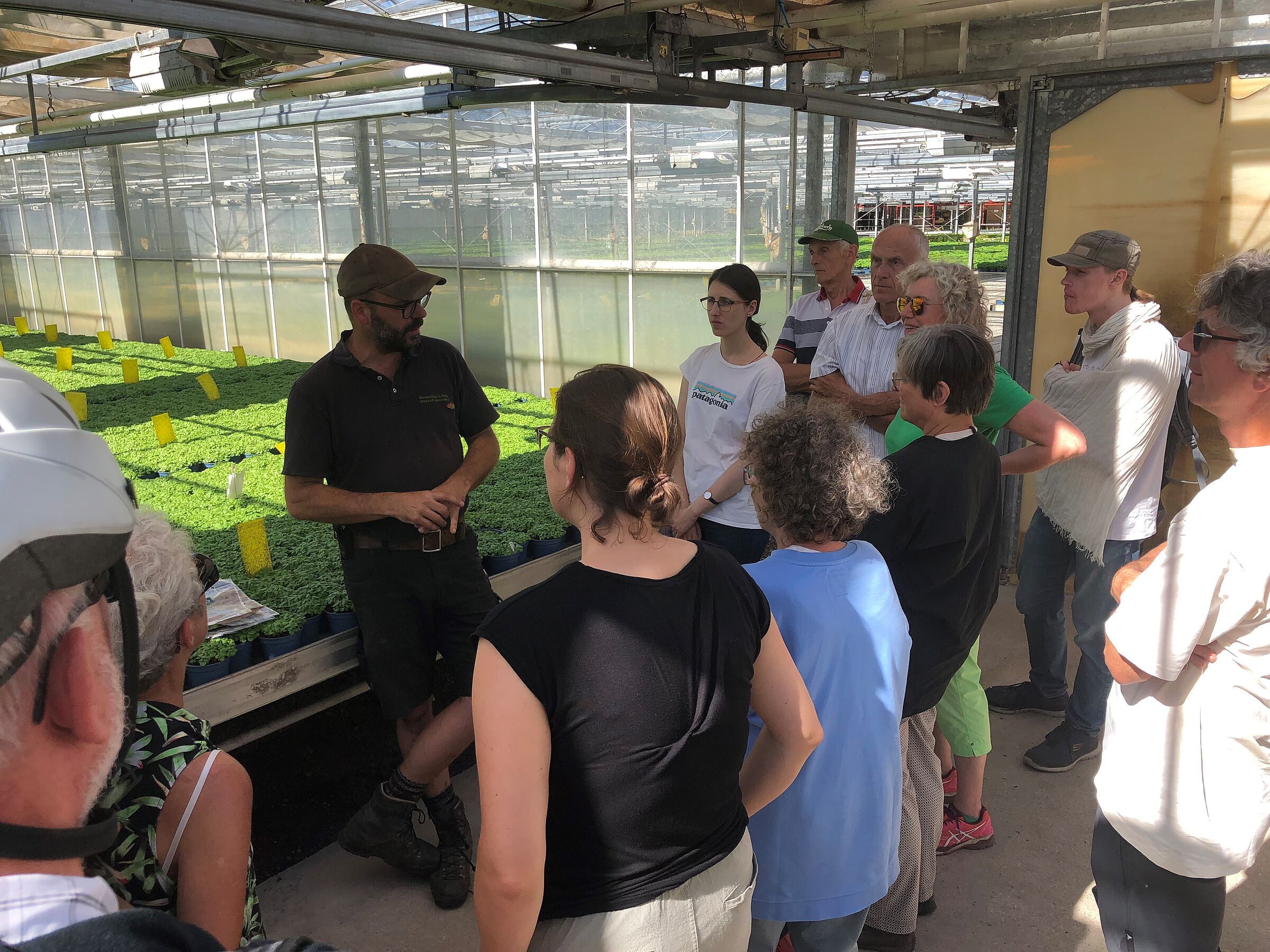 Zum Schluss statteten wir dem Kräuterhof Dworschak in Kraftshof einen Besuch ab. Der Chef selbst führte uns durch die Gewächshäuser und erklärte uns, was es mit den Kräutertöpfen so auf sich hat. Leider lässt sich auch in einem Biobetrieb Torf noch nicht vollständig ersetzen. Herr Dworschak erzählte launig über die Schikanen des Zolls und großer Marktabnehmer. Hier in Deutschland würden die Vorgaben genauestens kontrolliert, was im europäischen Ausland seltener der Fall sei. Leider griffen die Verbraucher oft nicht zur regionalen Ware, sondern zur preiswerten.