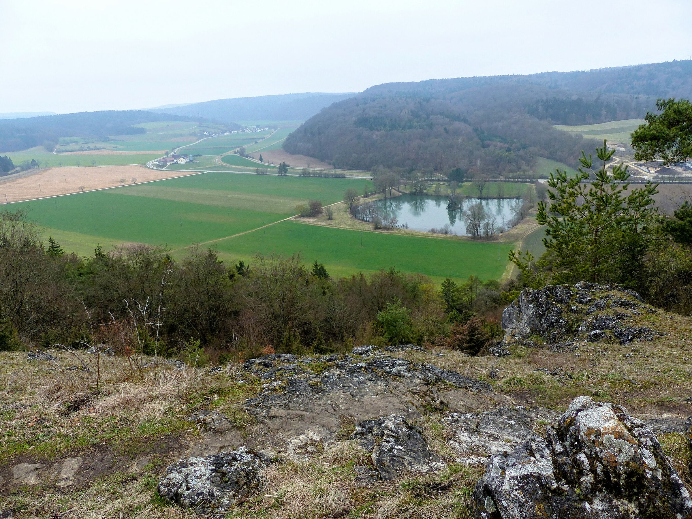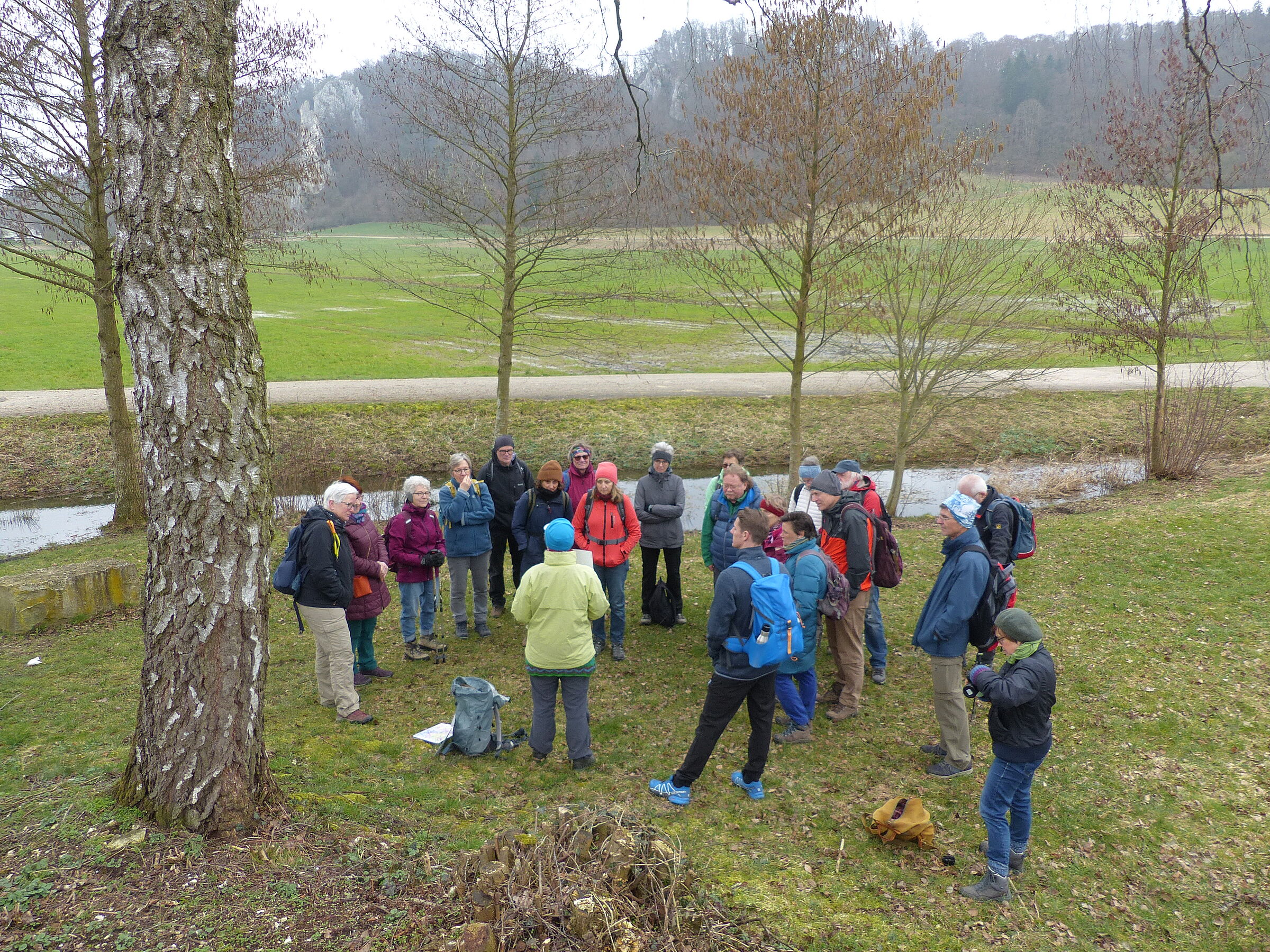 Wir fuhren mit Zug und Bus nach Wellheim. Dort, an der Schutterquelle, zu Füßen des Naturfreundehauses Konstein, erklärte Barbara Philipp die Entstehung dieser Landschaft vor 150 Millionen Jahren. Plastisch erläuterte sie die „Wannen“ (= Lagunen), an deren Rändern Schwämme und andere kalkbildende Tiere lebten, bis die mächtigen Kalkschichten irgendwann (vor 135 Millionen Jahren) herausgehoben wurden und erodierten. Sehr viel später, nach Auffaltung der Alpen, entstand nördlich davon ein Fluss, den wir Urdonau nennen. Sie floss durch das heutige mächtige Tal, wo sie sich mit dem Urmain vereinigte, denn der floss damals von Nord nach Süd. Woher wissen wir das? Die Flüsse haben allerlei Gestein mitgebracht, dessen Herkunft sich eindeutig zuordnen lässt.