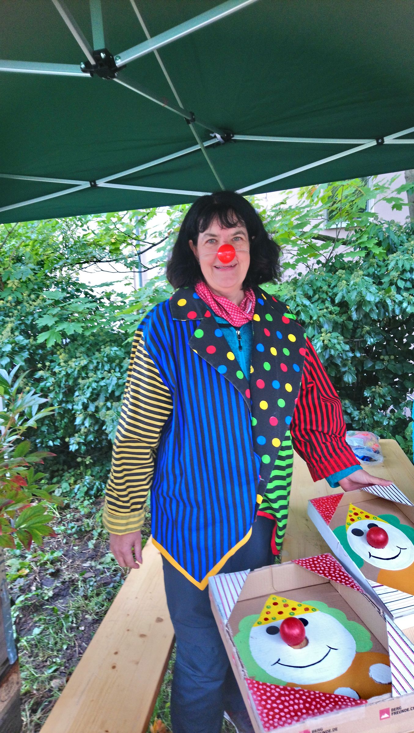 Frau Walthelm bastelte auch gleich einen Meisenknödel aus Kiefernzapfen für ihren Balkon. An einem anderen Stand wurden eifrig Poi hergestellt, das sind so etwas Ähnliches wie Jonglierbälle mit Stoffschweif an Schnüren, die selbstverständlich sofort ausprobiert wurden. Das Clownspiel für Geduldige wurde von einem richtigen Clown angeleitet. Einfach war das nicht, die Nase dorthin zu bringen, wo eine Nase eben hingehört. Die Nase war ein roter Ball, der in einer Kiste so balanciert werden musste, dass er in der Aussparung dafür liegenblieb. Aber wenn einen ein Clown anfeuert, dann klappt das schon.