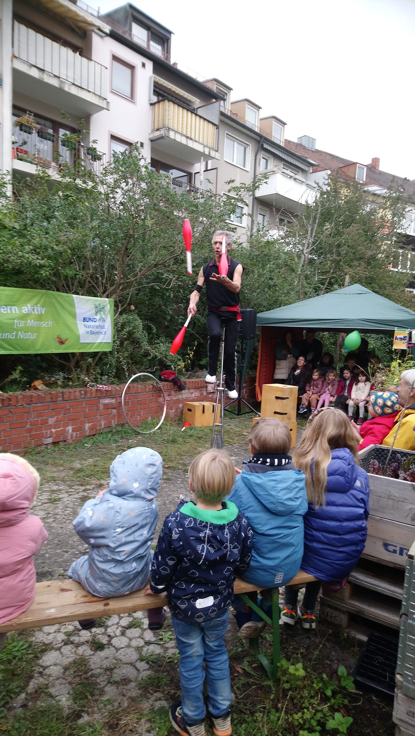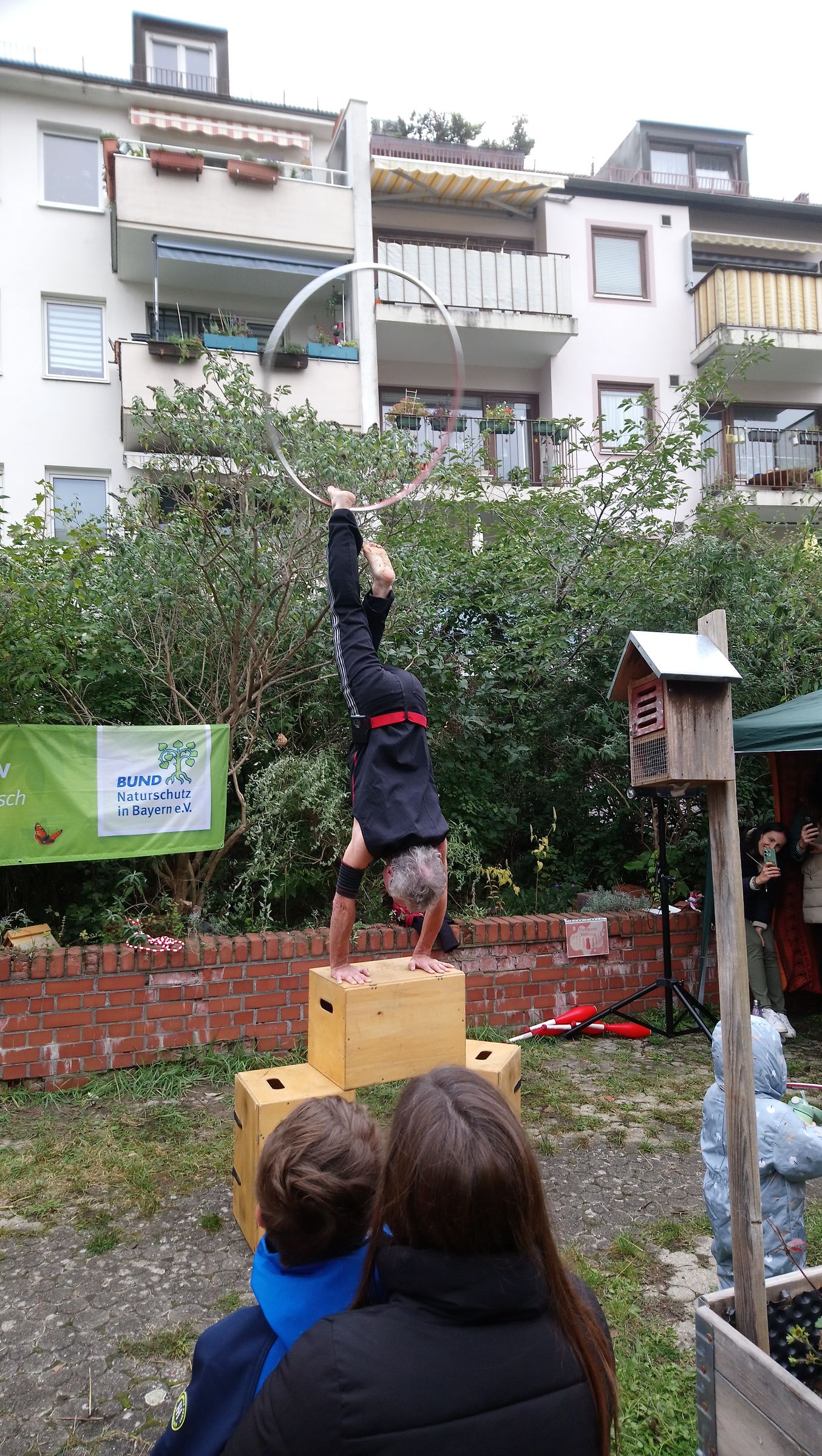 Und dann kam der Höhepunkt des Nachmittags: Felix Mack, ein echter Artist. Auf unserem unebenen Plattenboden und den nassen Grasbüscheln dazwischen arbeitete er unter erschwerten Bedingungen, was ihn nicht hinderte, aufs Einrad zu steigen und zu jonglieren und auf einem Kistenstapel im Handstand die Reifen um seinen Körper kreisen zu lassen.