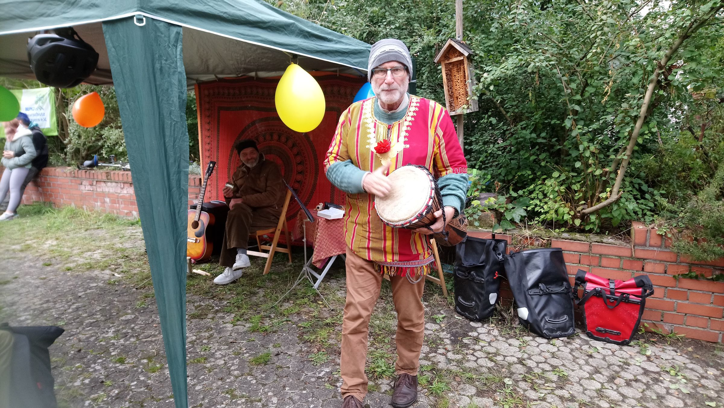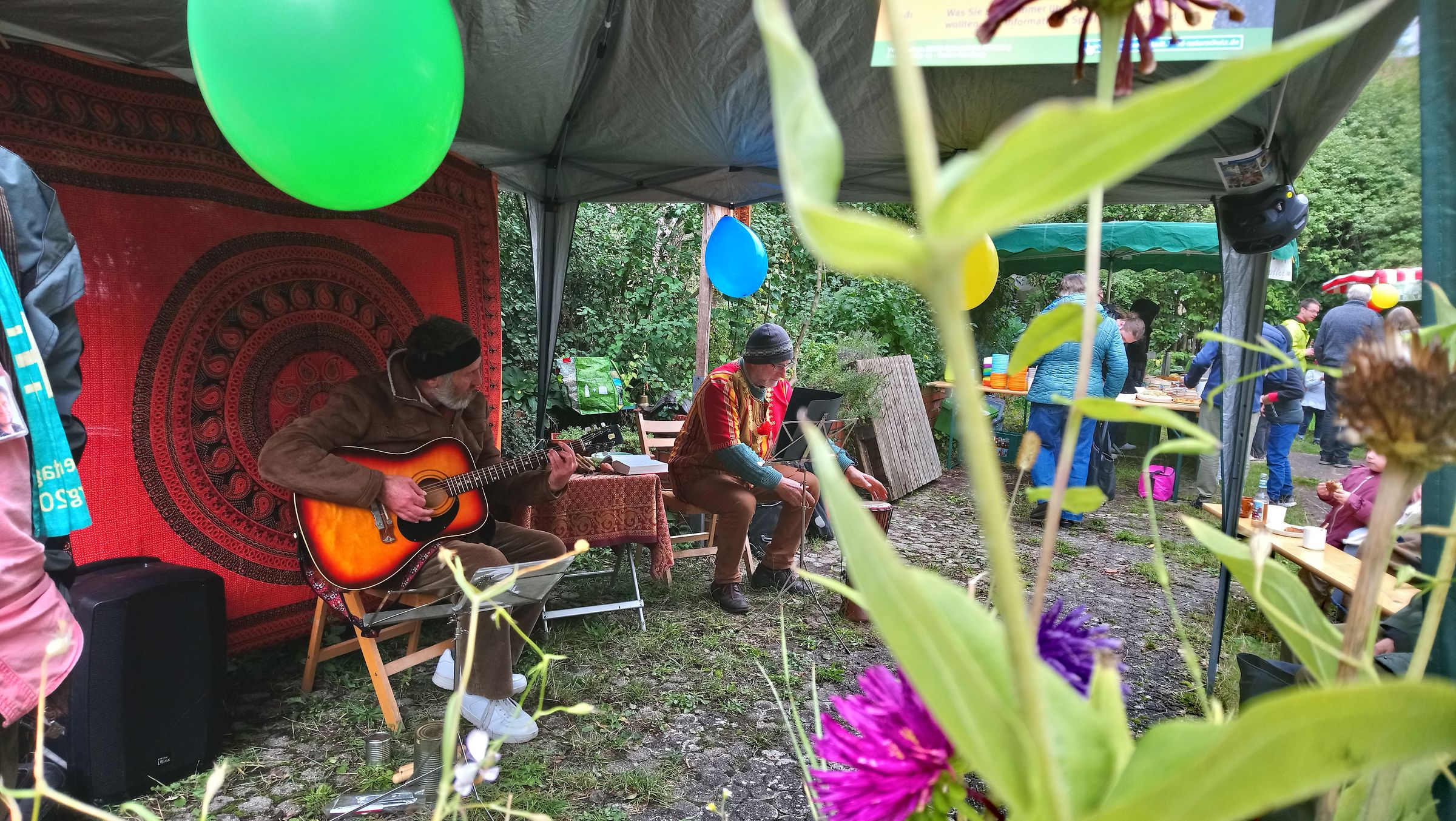 Ein Kulturprogramm gab es natürlich auch. Rainer Edelmann und Eddy Urich (Ede und Eddy) starteten mit ihrer eigenwilligen und kreativen Spontanmusik, die das Publikum ins Hofgärtchen zog. Sie wurden abgelöst von Barbara Philipp mit einer Märchen-Halbenstunde. Die Kinder – nicht nur die – lauschten gebannt und hatten auch sehr schnell den Maulwurf ins Herz geschlossen. Rainer Edelmann, nicht nur unser Musikus, sondern auch unser Pflanzenexperte, führte danach durch den Garten und erklärte vor allem die Wildpflanzen, die sich ohne unser Zutun unter das Gemüse mischen.