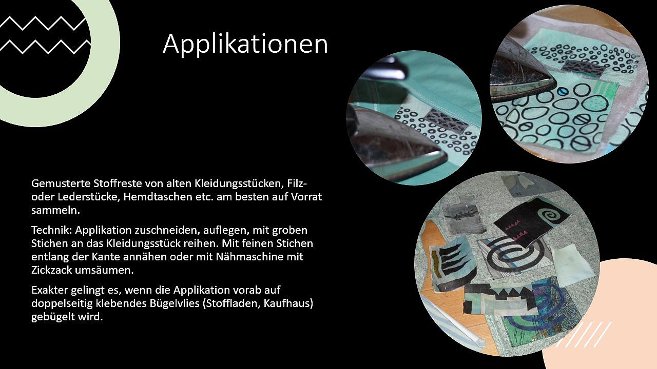 Kreativ reparieren (z.B. bunte Applikationen auf Flecken), traditionelles Recycling (Flickerlteppiche, Quilt aus Stoffresten), echtes Up-Cycling (Verschönern und Umarbeiten älterer Stücke), Zweckentfremdung (Gürtel wird Haarband, Stoffreste als Geschenkverpackung etc.). Komplett unbrauchbare Teile entsorgen (Kleidersammlung, Putzlappen; Wolle und Baumwolle kann auch kompostiert werden).