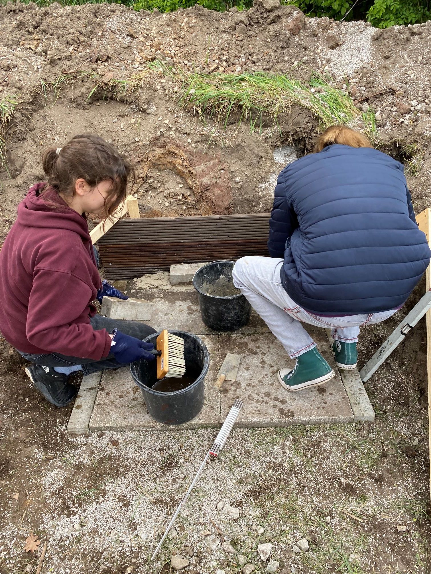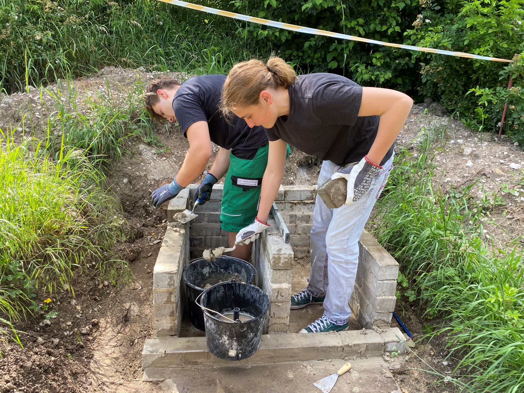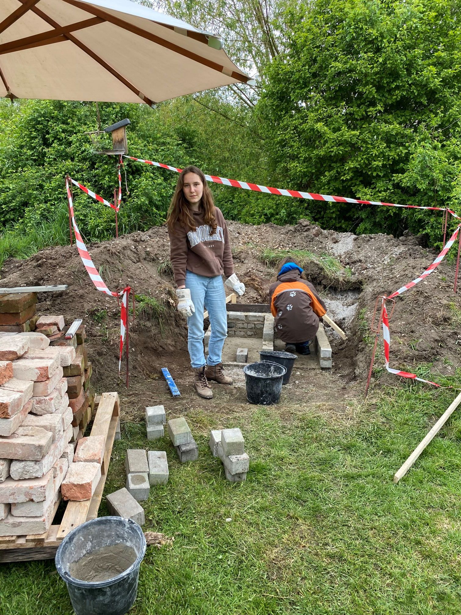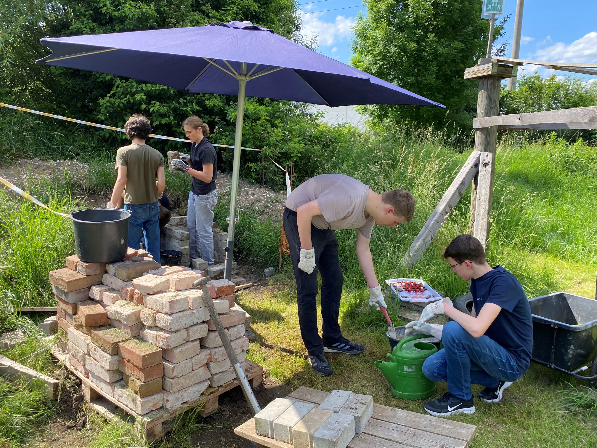Aktuell treffen wir uns auf dem Abenteuerspielplatz Megilo, der zwischen Mögeldorf und Laufamholz liegt. Dort haben wir immer die Möglichkeit, ein Lagerfeuer zu schüren und entweder Stockbrot oder Würste zu grillen. Anfang dieses Jahres (2024) entstand die Idee, einen Pizzaofen zu bauen. Zuerst einmal musste ein passender Ort gefunden werden, den viele Menschen benutzen können. Danach ging es in die konkrete Planung. Was brauchen wir, wie viele Steine, welche Steine und woher bekommen wir all das, ohne etwas dafür zu bezahlen? Alle Gruppenteilnehmer haben nach feuerfesten Ziegeln aus alten Gebäuden Ausschau gehalten. Durch das aktive Mitwirken aller konnten wir zeitnah feuerfeste, alte Steine aus einem Gebäude retten. Die Steine wurden abgeholt und auf den Abenteuerspielplatz Megilo in Mögeldorf gefahren. Hans, der Sozialpädagoge vor Ort, war sofort bereit, uns den Platz zur Verfügung zu stellen. Durch seine tatkräftige Unterstützung konnte Ende Mai mit dem Fundament begonnen werden. Nach vielen Gruppenstunden konnte dann auch die Schamotteplatte gelegt werden. Darüber wurde das originalgroße Holzmodell der Kuppel gestellt und die feuerfesten Ziegel mit Schamottemörtel gesetzt. Während dieser akuten Bauphase haben wir uns zum Teil wöchentlich getroffen, um voranzukommen. Die Jugendlichen gehen mittlerweile gut mit Kelle, Wasserwaage und Senklot um. Die Zementmischungen werden im Handumdrehen perfekt angerührt und verarbeitet. Für das leibliche Wohl wird ebenfalls gesorgt. Ein Teil der Gruppe bereitet in der Regel Snacks für die Gruppe vor. Am Ende muss alles sorgfältig ausgewaschen, aufgeräumt und der Ofen am Ende des Arbeitsvorgangs abgedeckt werden.