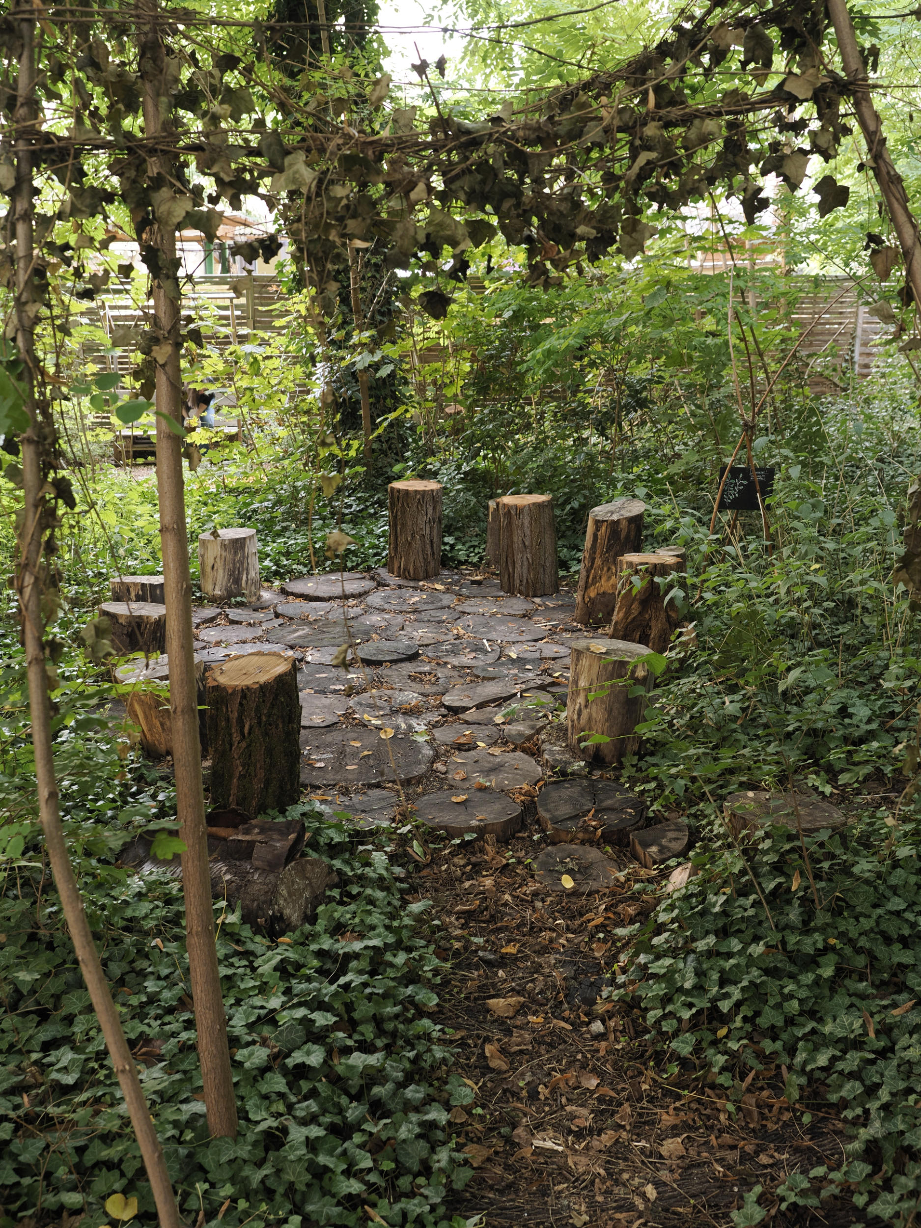 Jetzt ist es mit Pflanzen überwuchert und bietet vielen Insekten und verschiedenen Tieren (zum Beispiel Rotkehlchen, Eichhörnchen und Igeln) Lebensraum. Mehrere Sitzgelegenheiten laden zum Verweilen im Schatten der Bäume ein.