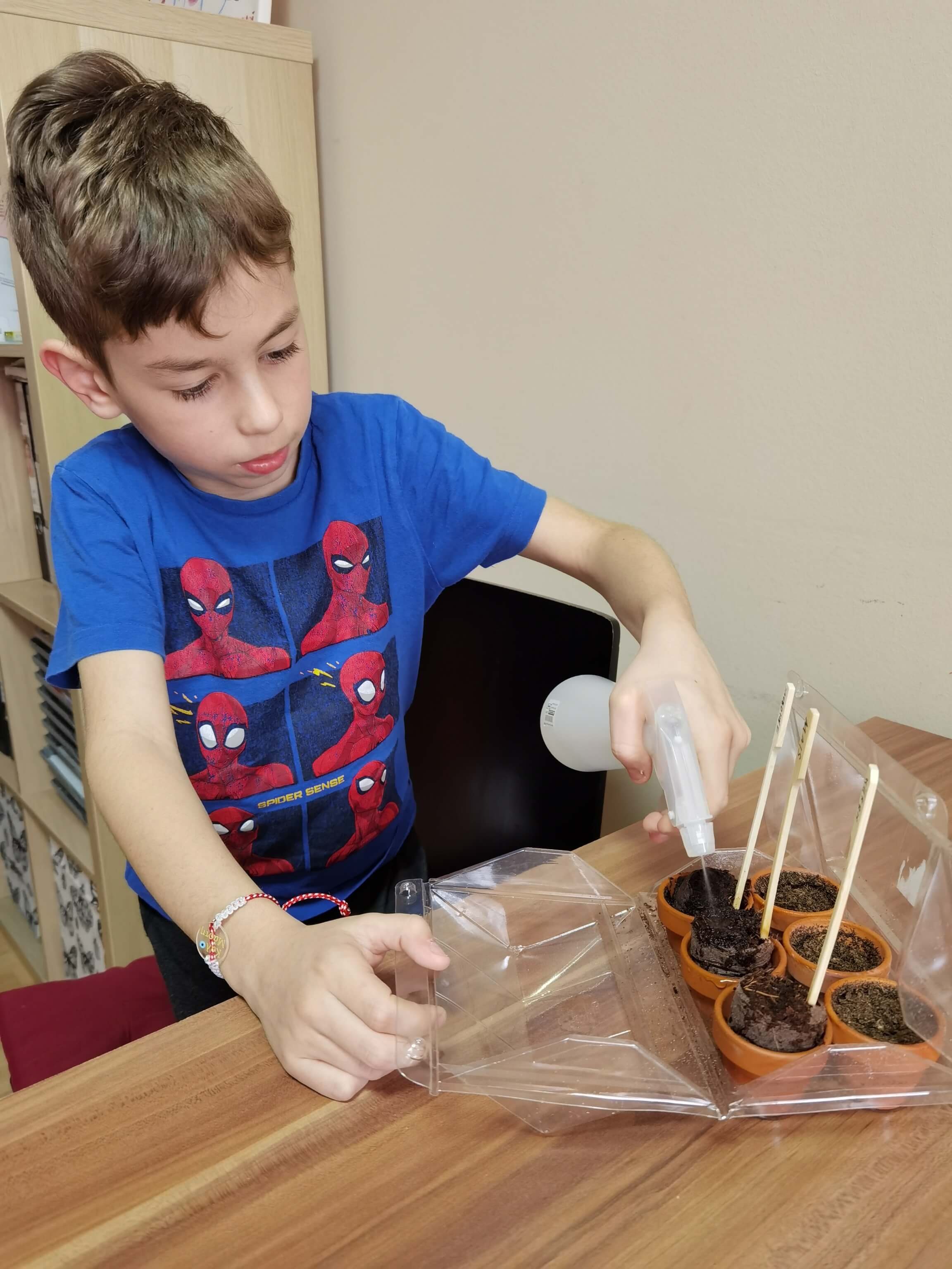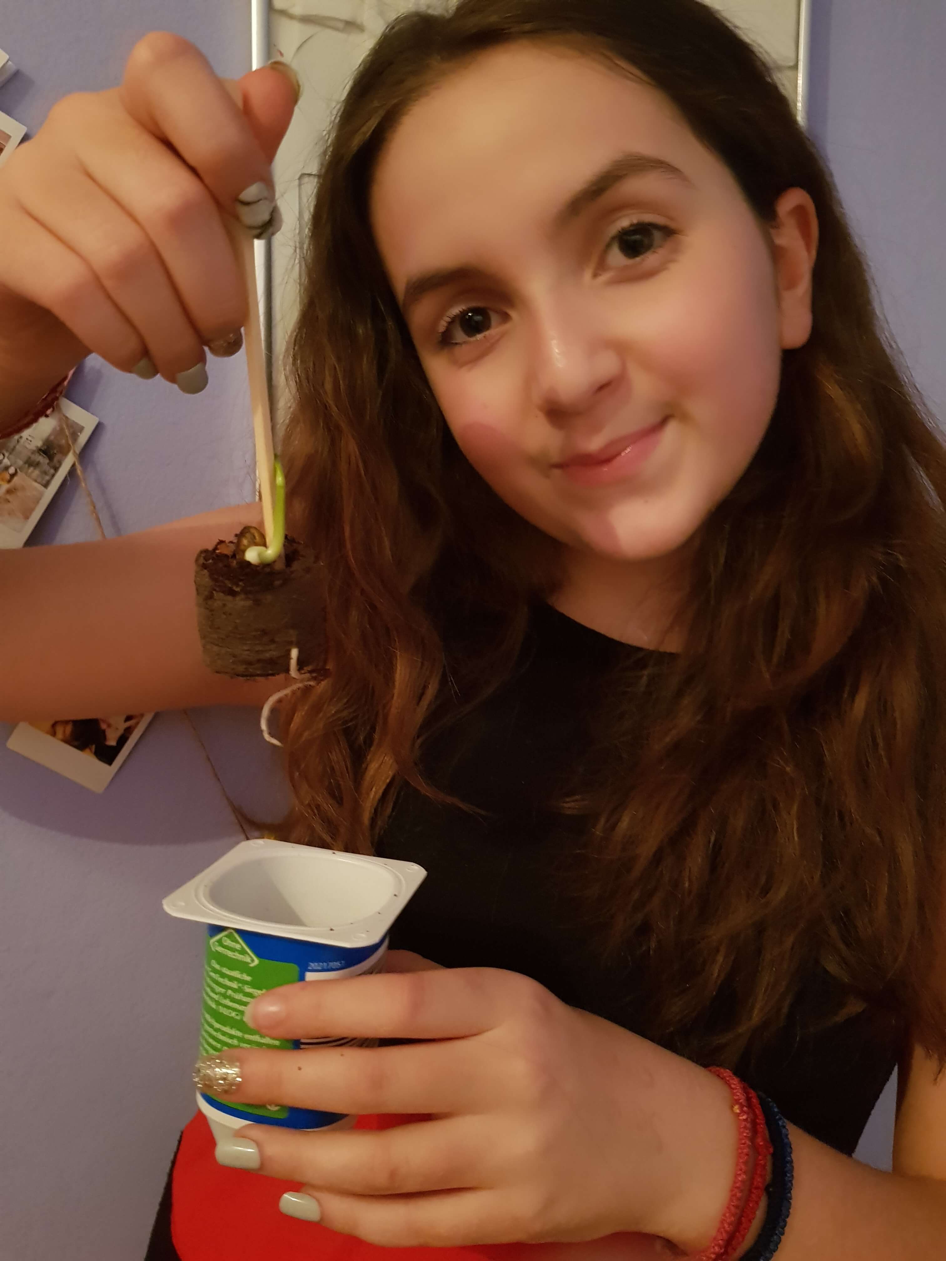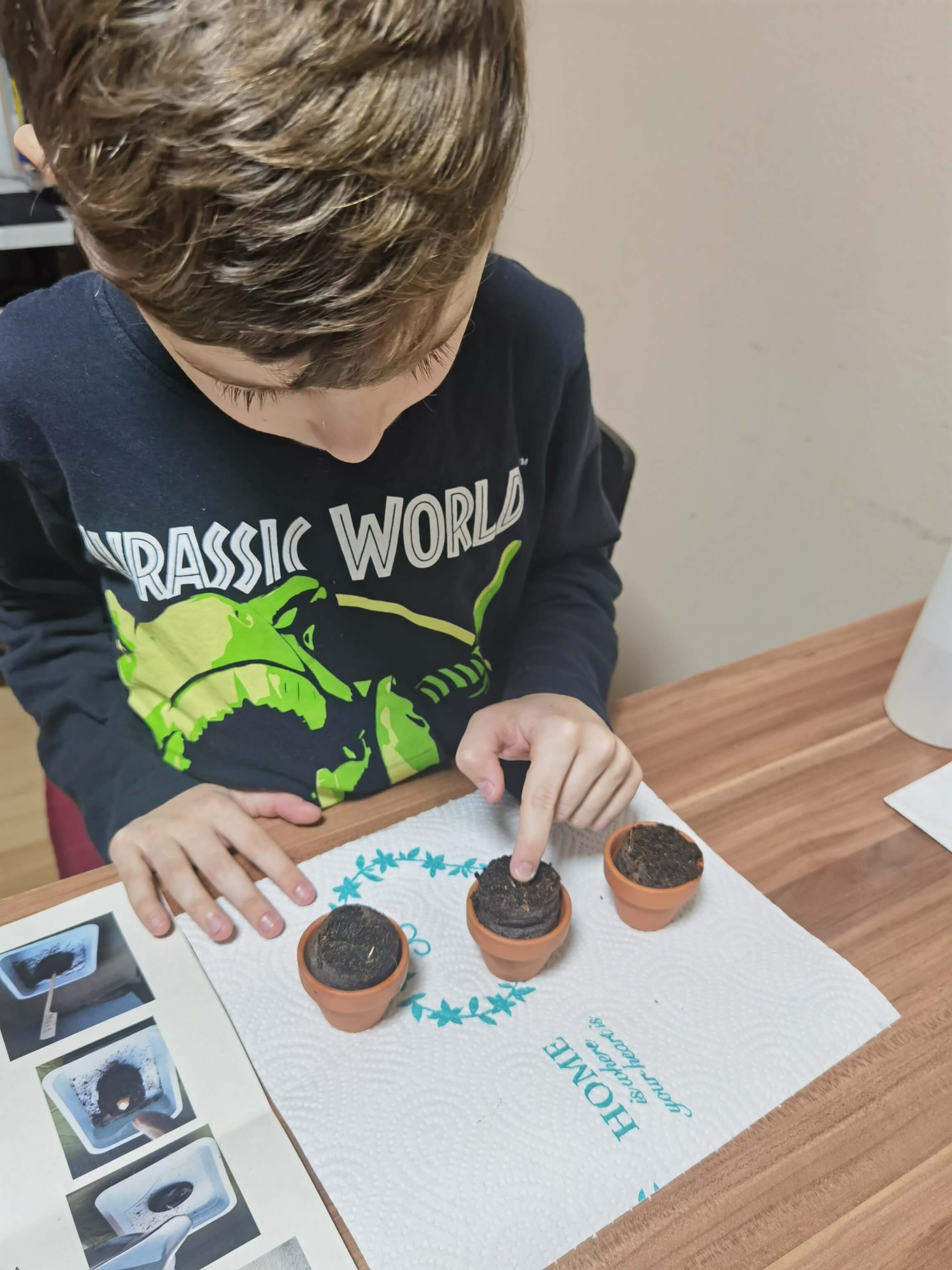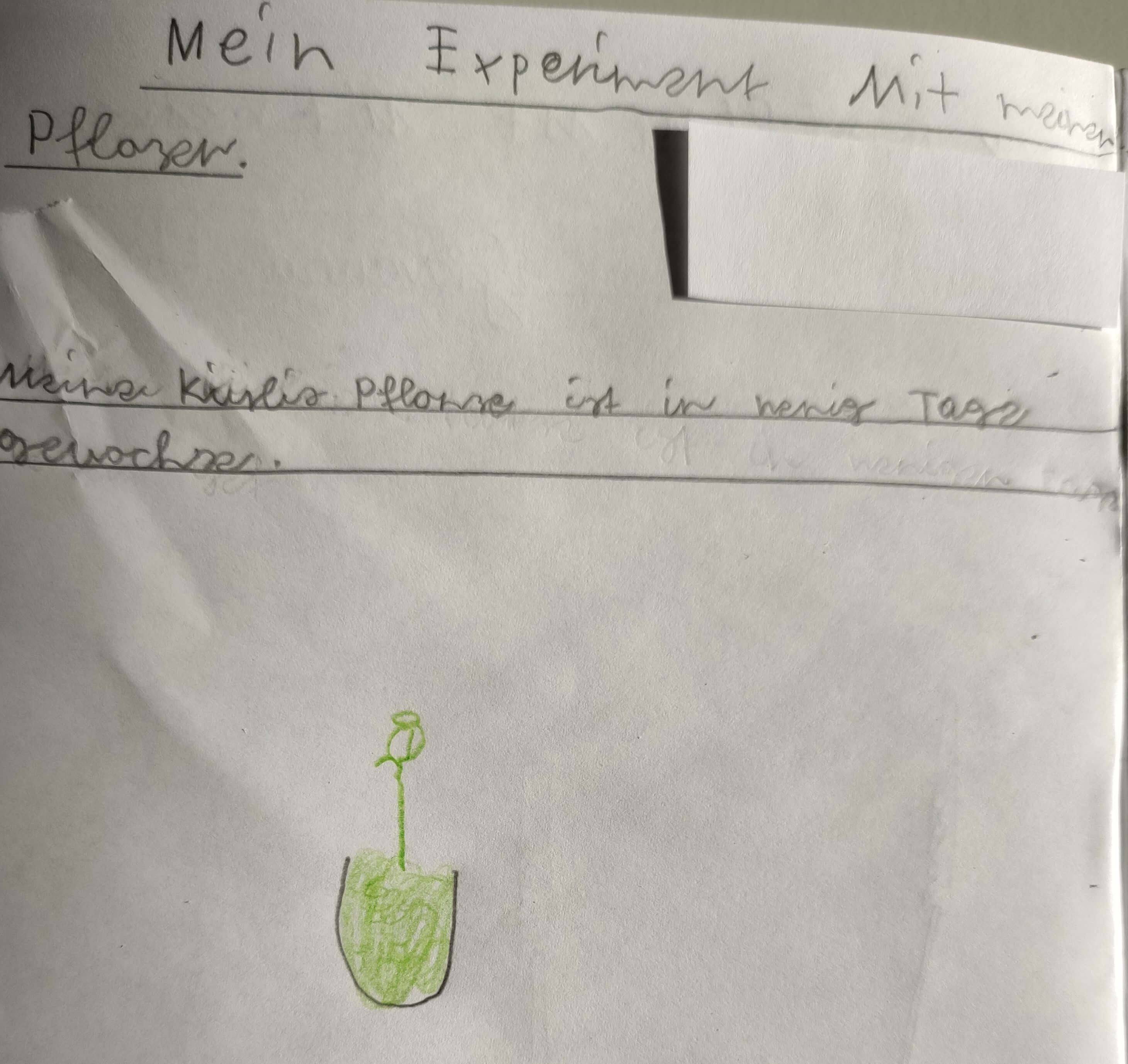 Und die Kinder machten sich sogleich an die Arbeit! Voller Eifer wurden die Quelltabletten in kleine Blumentöpfe gelegt, zum Aufquellen angegossen und Samen hineingelegt. Bei einigen Kindern spitzten innerhalb von nur wenigen Tagen die ersten kleinen Pflänzchen aus der Erde und die Fortschritte wurden genau beobachtet und aufgeschrieben. Mittlerweile sind die Pflanzen so groß, dass manche bereits umgetopft werden mussten.
