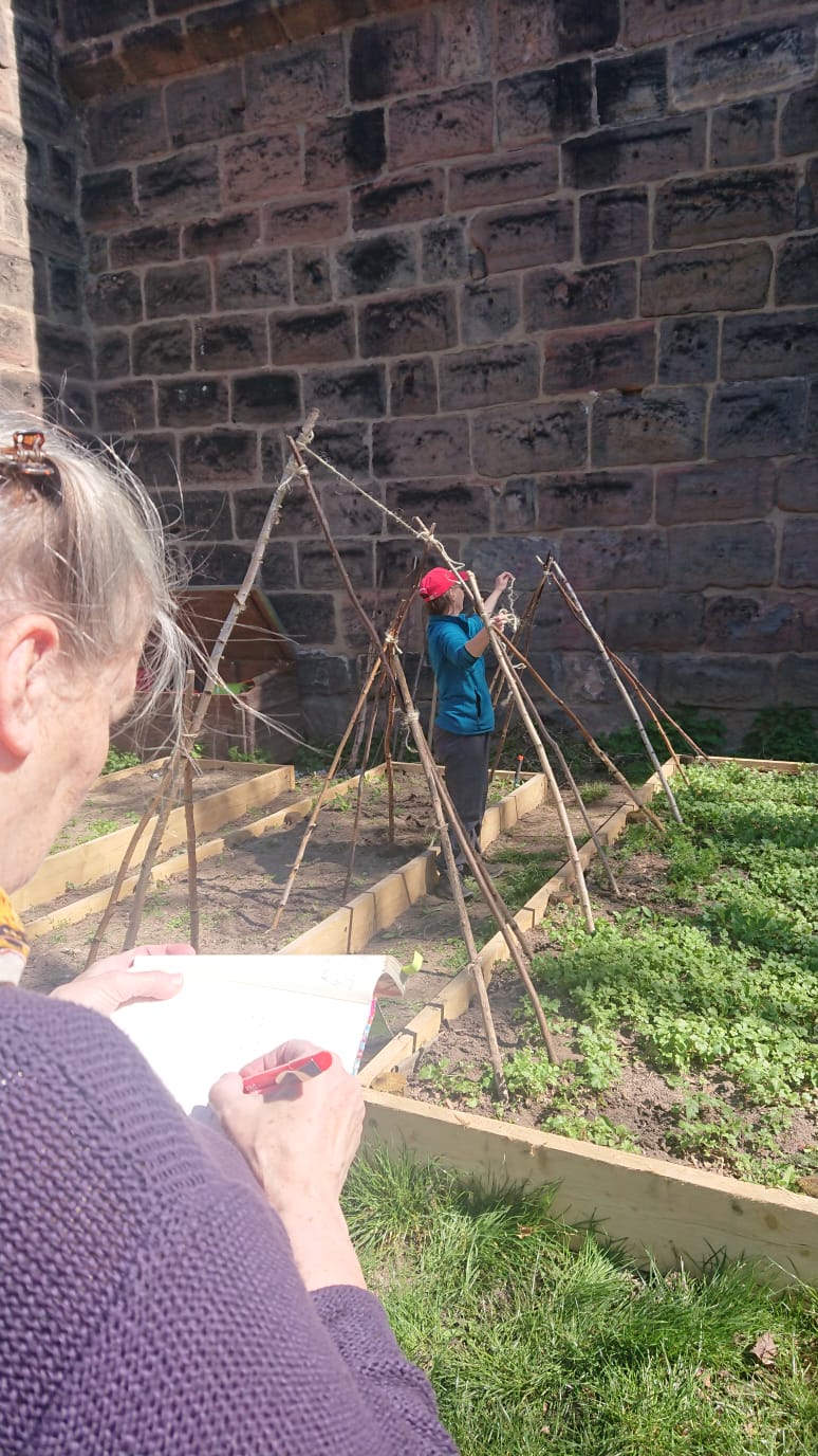 Die BN-Umweltpädagoginnen Heide Werner, Sarah Dörlitz und Barbara Philipp haben die Beete für die in der KW 18 geplanten Pflanzaktionen vorbereitet und ein Bohnengerüst aufgestellt.