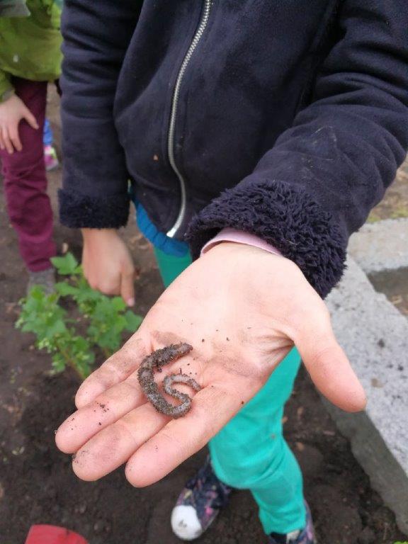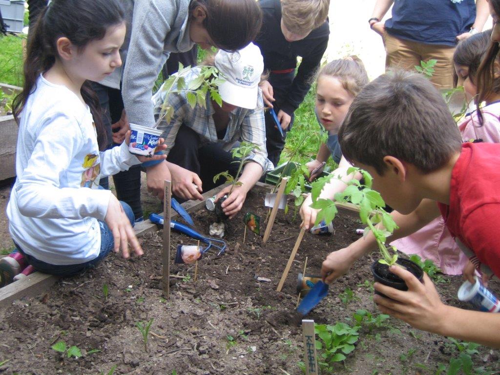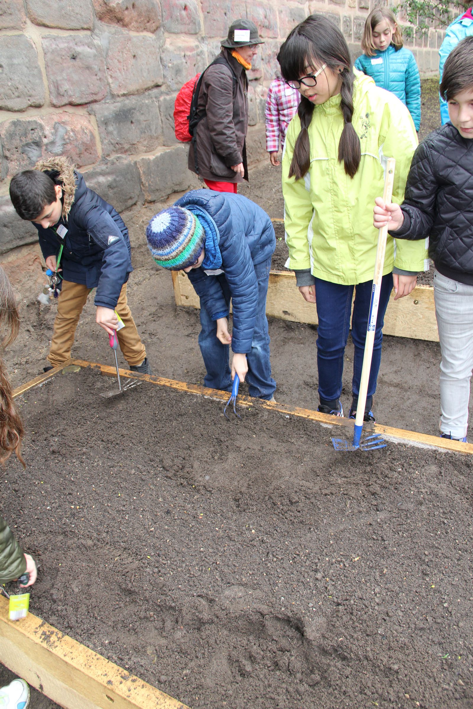Trotz des regnerischen Wetters waren die Kinder hoch motiviert und kaum zu bremsen. Die mitgebrachten Saatkartoffeln wurden daher in kürzester Zeit fachgerecht unter die Erde gebracht und angehäufelt. Zum weiteren Anbau hatten die Kinder sehr konkrete Wünsche, die in der Folgezeit auch umgesetzt werden sollen: Kürbisse, Gurken, Gelbe Rüben, Rote Bete, Mais, Salat, Zwiebeln, Bohnen, Radieschen und vieles mehr werden die Kinder in den kommenden Monaten auf den Beeten aussäen oder, in den Klassenzimmern vorgezogen, in die Beete auspflanzen. Und natürlich wollen wir die Früchte unserer Arbeit auch ernten und genießen!