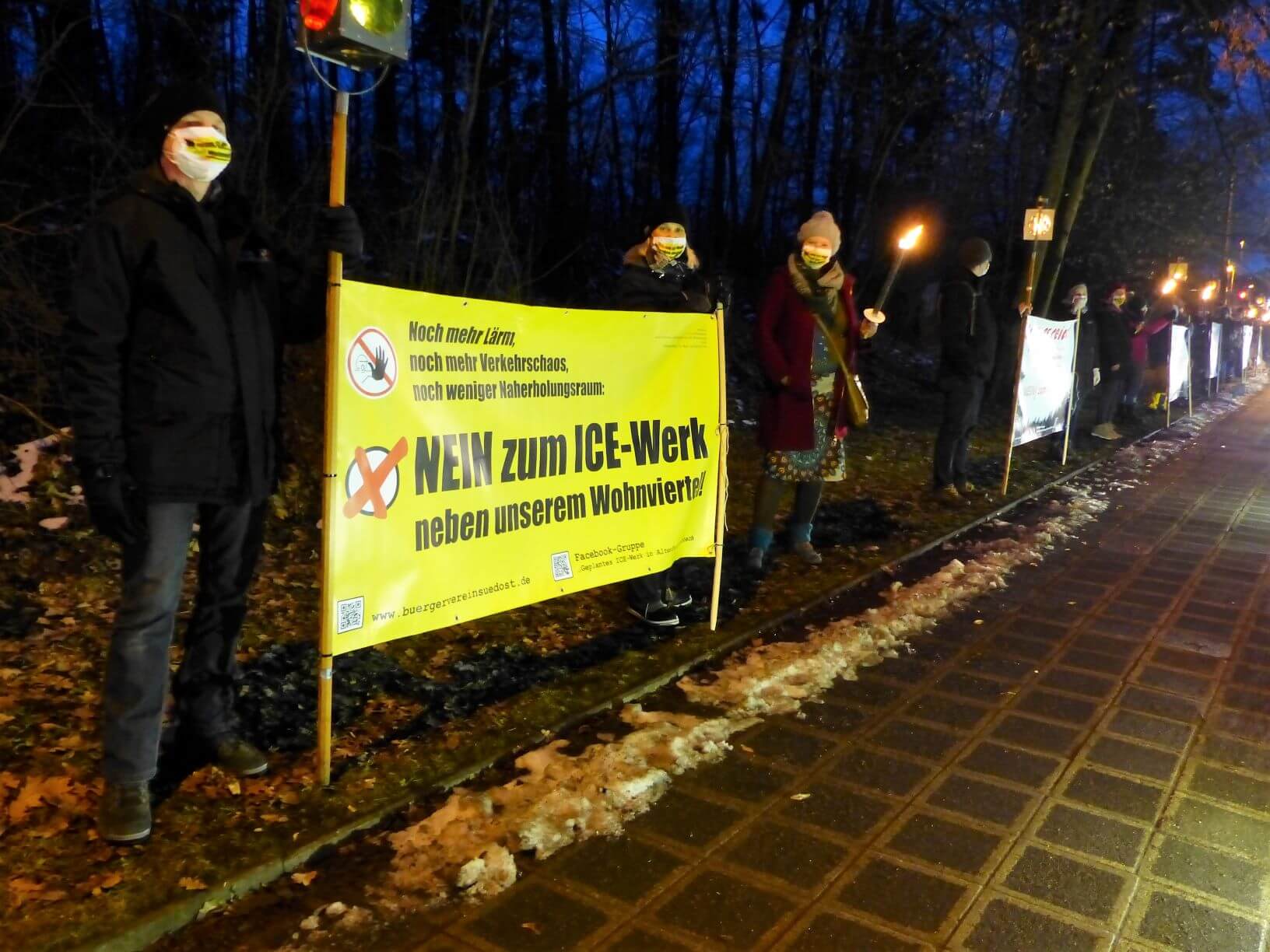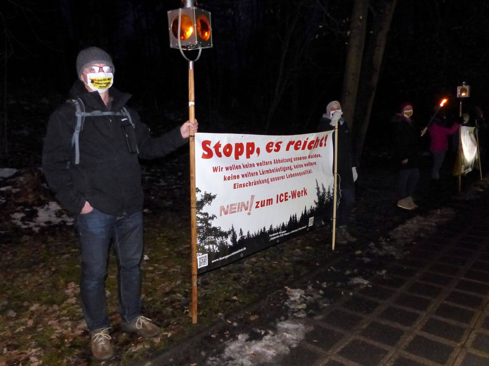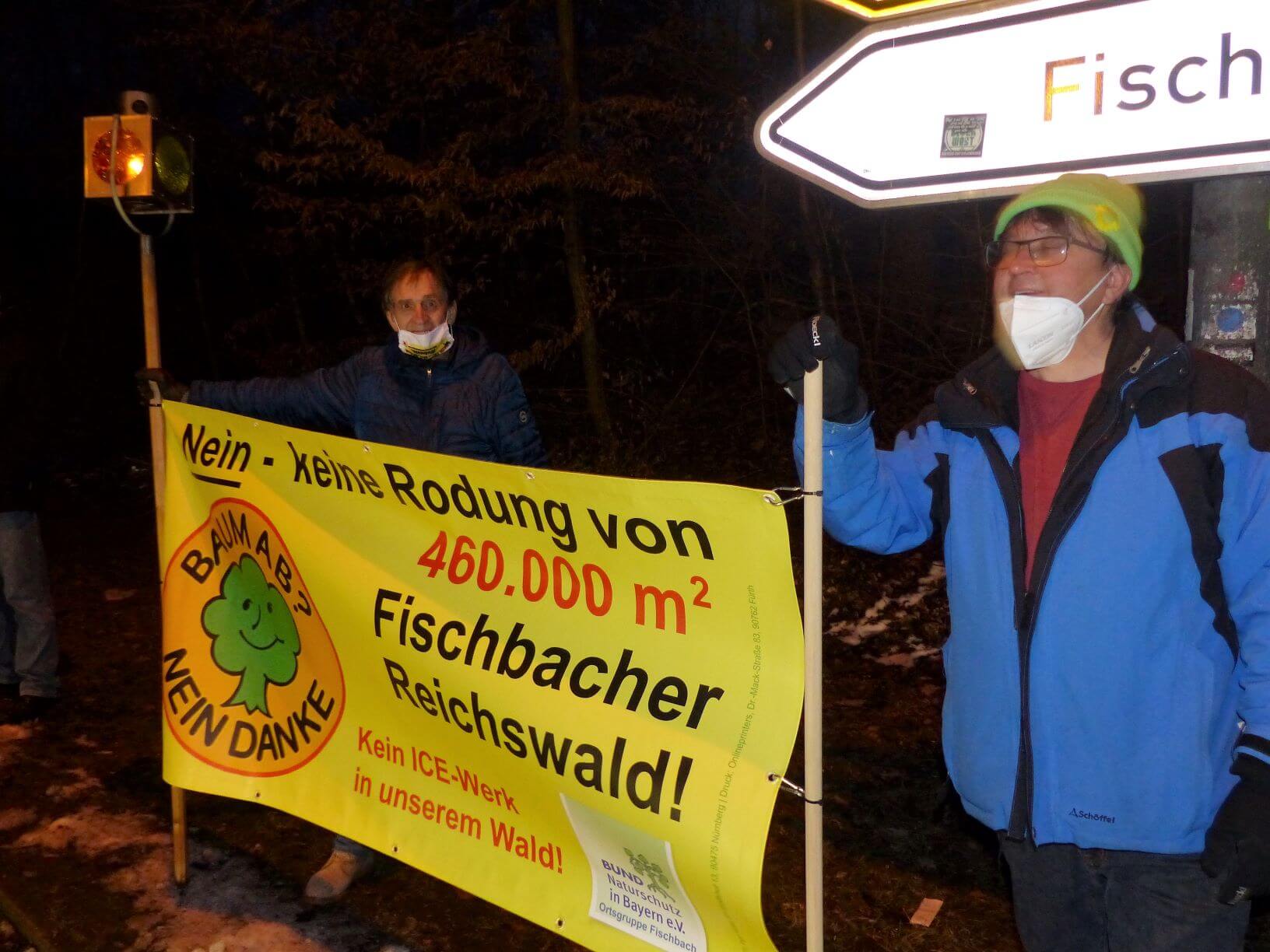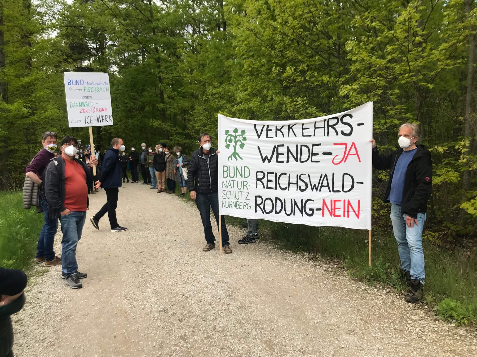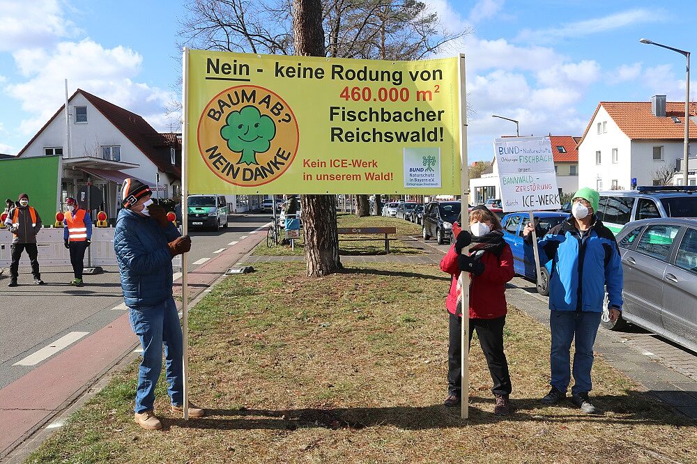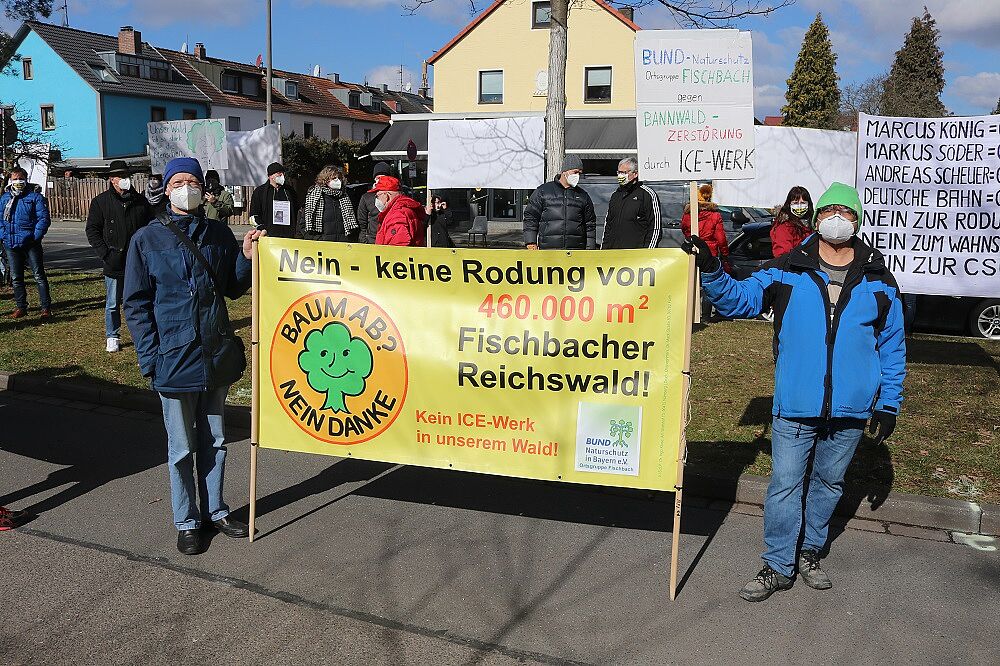 Viele BN-Mitglieder beteiligten sich am Samstag, den 20. März mit großformatigen Transparenten an der Demonstration gegen das ICE-Werk im Reichswald zwischen Fischbach und Altenfurt. Darunter waren nicht nur Vertreter der Kreisgruppe, sondern auch der benachbarten Ortsgruppen Langwasser und Fischbach. Insgesamt wurden – bei stark beschränktem Zugang – etwa 190 TeilnehmerInnen gezählt. VertreterInnen von Bürgerverein, Bürgerinitiative und BN wiesen in ihren Redebeiträgen auf den drohenden Verlust von weit über 400.000 Quadratmetern Waldfläche hin.