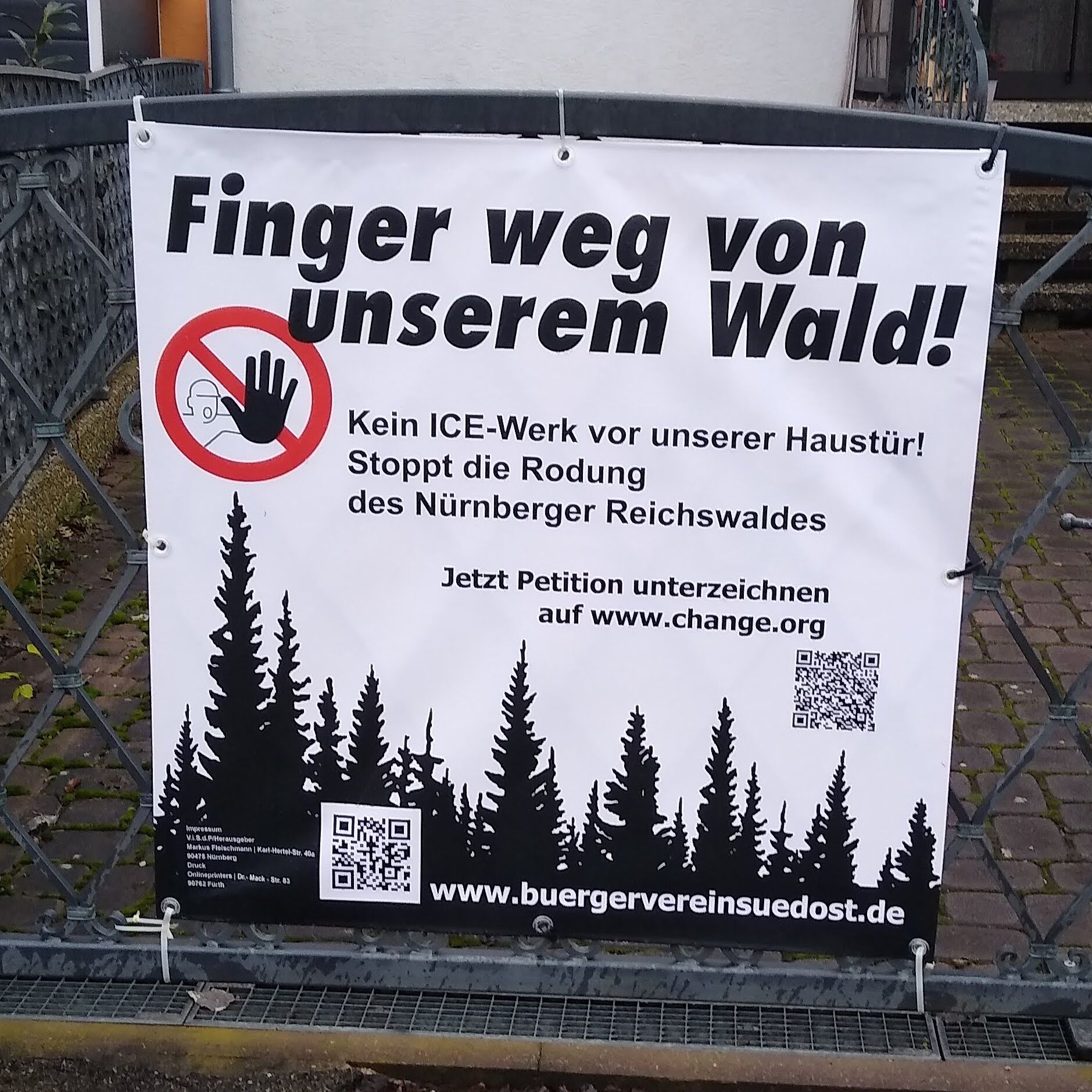 Für die Deutsche Bahn als klimafreundlichen Verkehrsträger muss der Klimaschutz auch bei ihren Bauvorhaben oberstes Ziel sein. Der BUND Naturschutz unterstützt daher die Petition gegen das ICE-Werk im Reichswald zwischen Fischbach und Altenfurt, europäisches Vogelschutzgebiet und Landschaftsschutzgebiet müssten dafür beseitigt werden. Bürger verlieren ein wichtiges Naherholungsgebiet und müssen mit starker Lärmbelästigung rechnen.