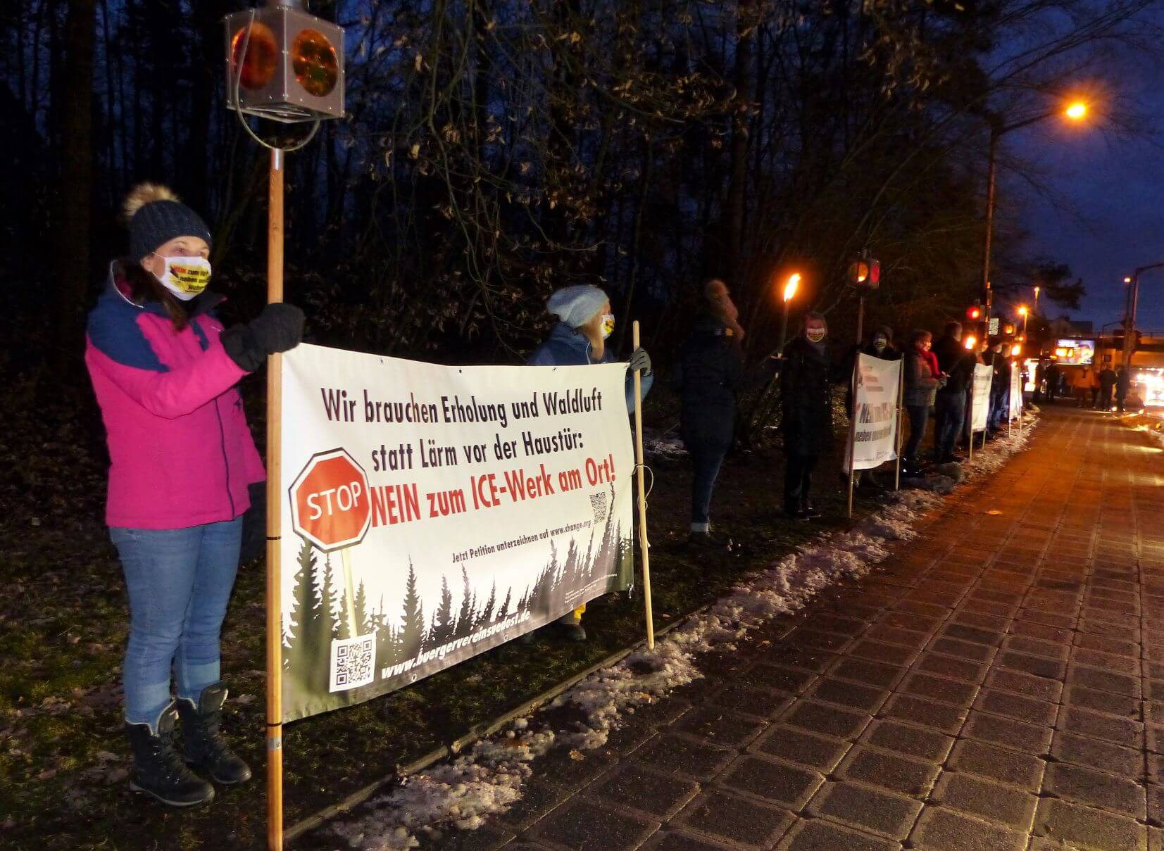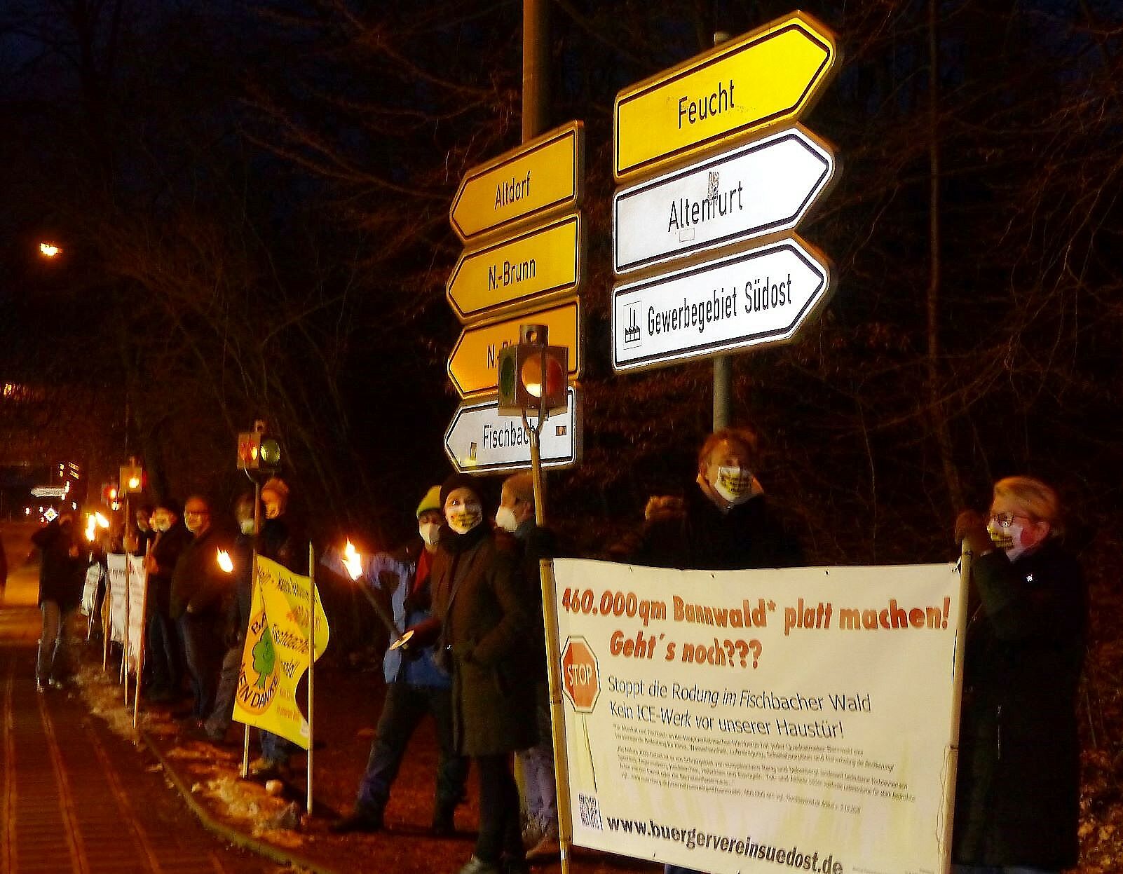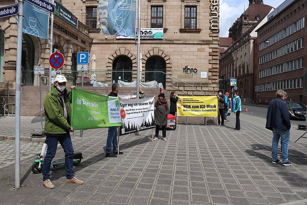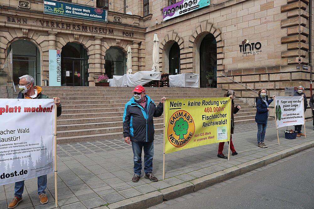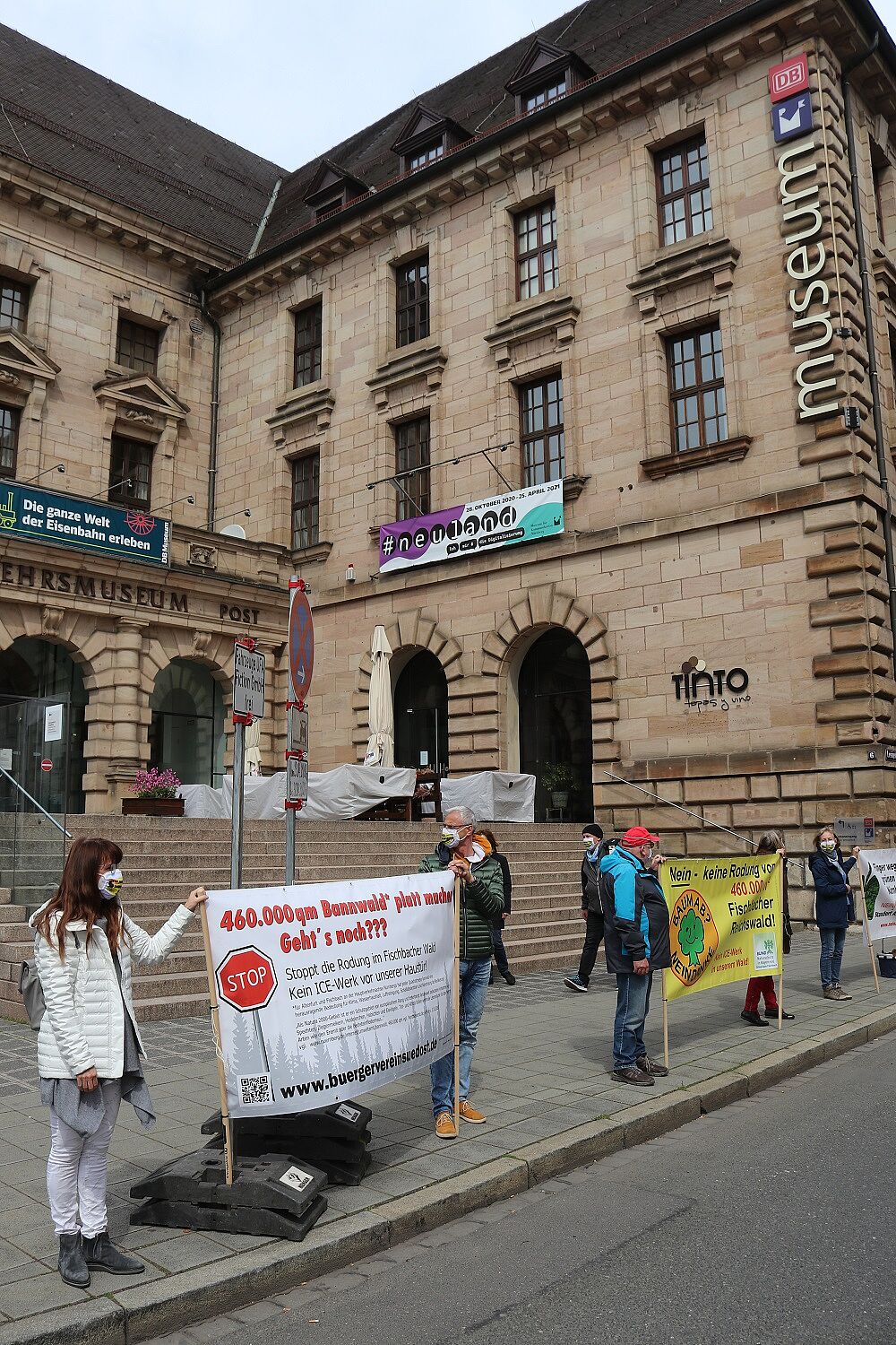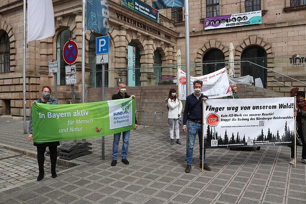 Der BUND Naturschutz demonstrierte vor dem DB-Museum mit Mitgliedern der örtlichen Bürgerinitiative gegen die Standorte im Nürnberger Reichswald. Neben dem geplanten Werksgelände Fischbach/Altenfurt sind es Flächen bei Allersberg und zwei Areale im Gebiet der ehemaligen MUNA Feucht bzw. südlich davon.