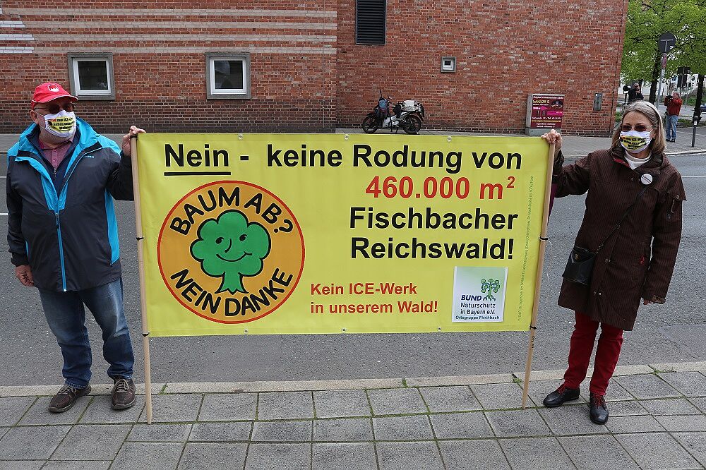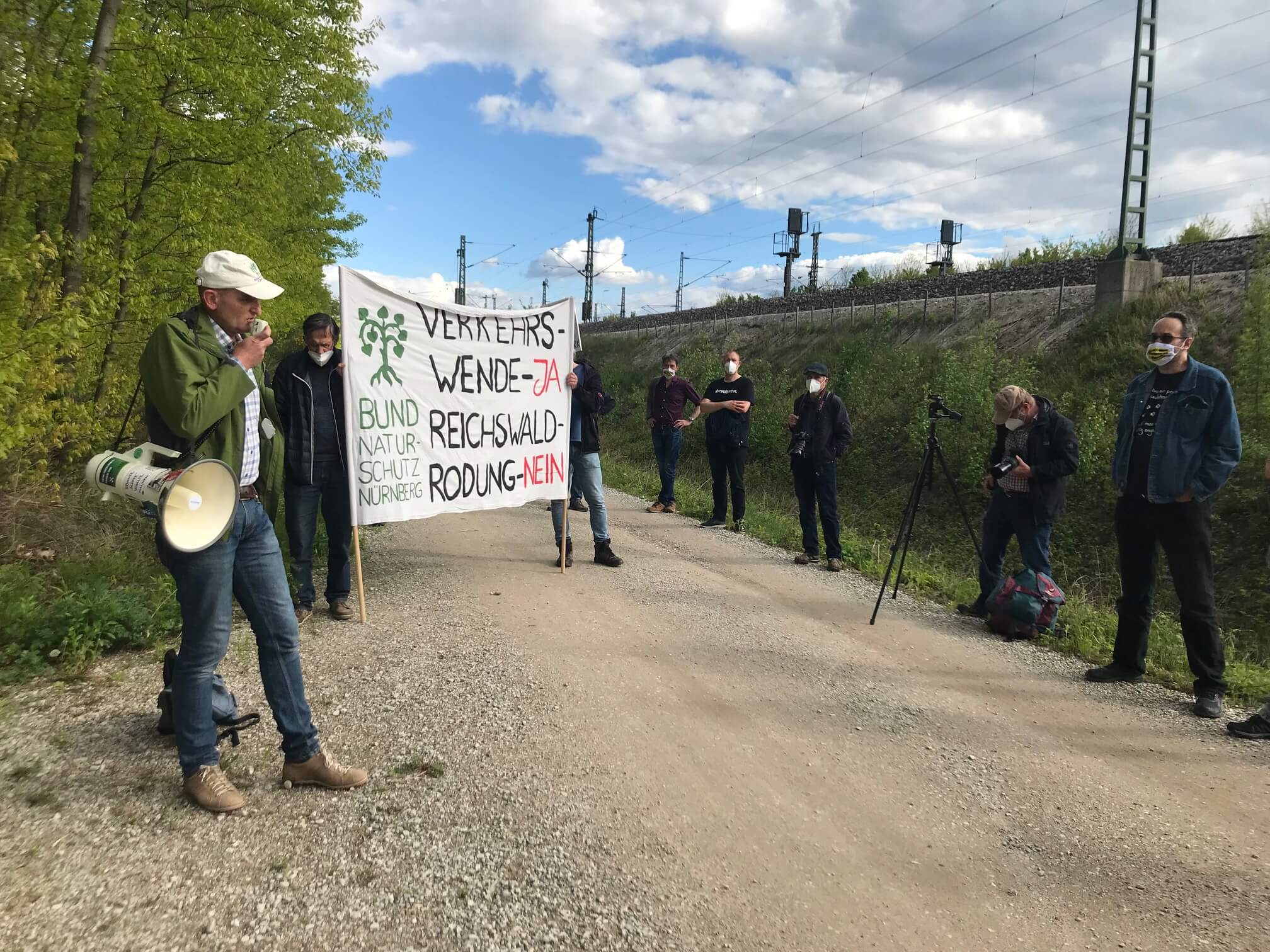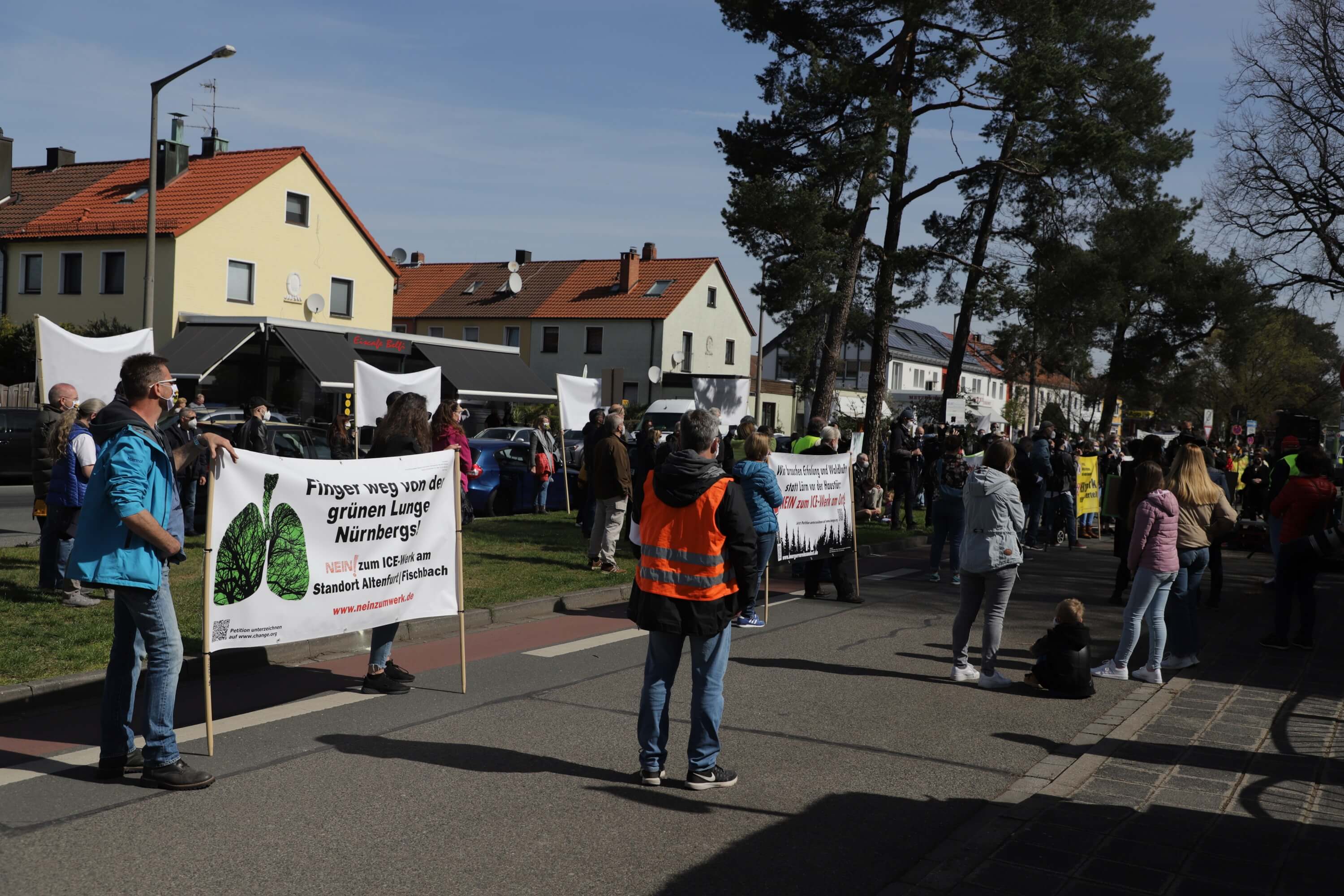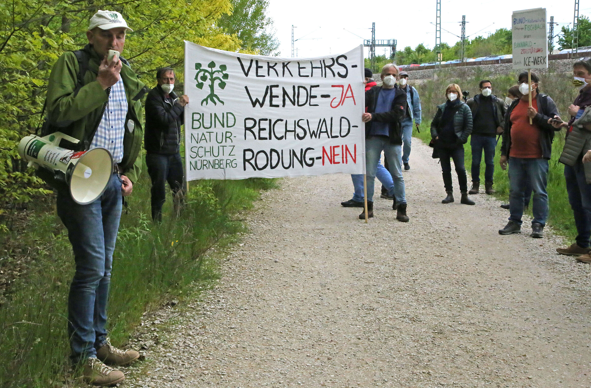 Auch am 2. Mai demonstrierten fast 250 Anwohner und Naturschützer vor der Straße der Menschenrechte gegen das geplante ICE-Werk im Reichswald zwischen Langwasser, Altenfurt, Fischbach und Zabo. Die Deutsche Bahn hält trotz der Proteste an dem Standort fest. Als Gastredner sprach sich auch Thomas Feuchtenberger von Parents for Future gegen das Werk und für mehr Klimaschutz im Wald aus.