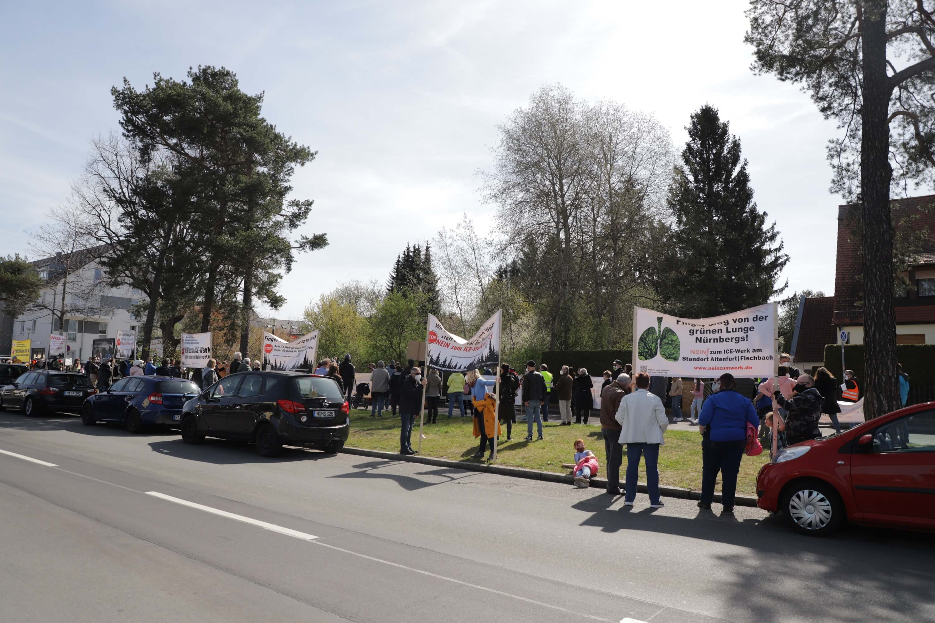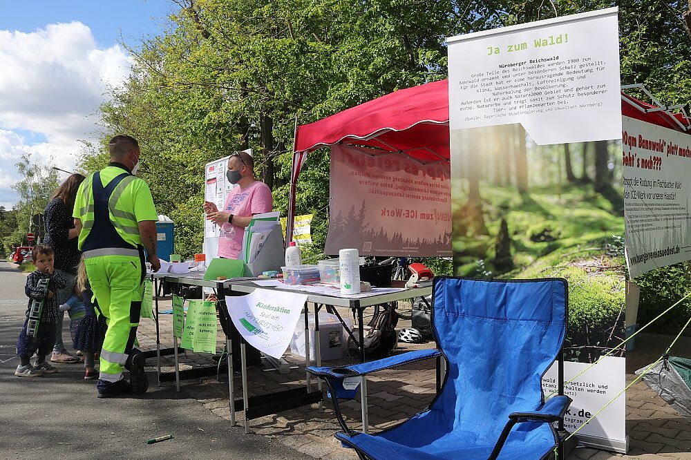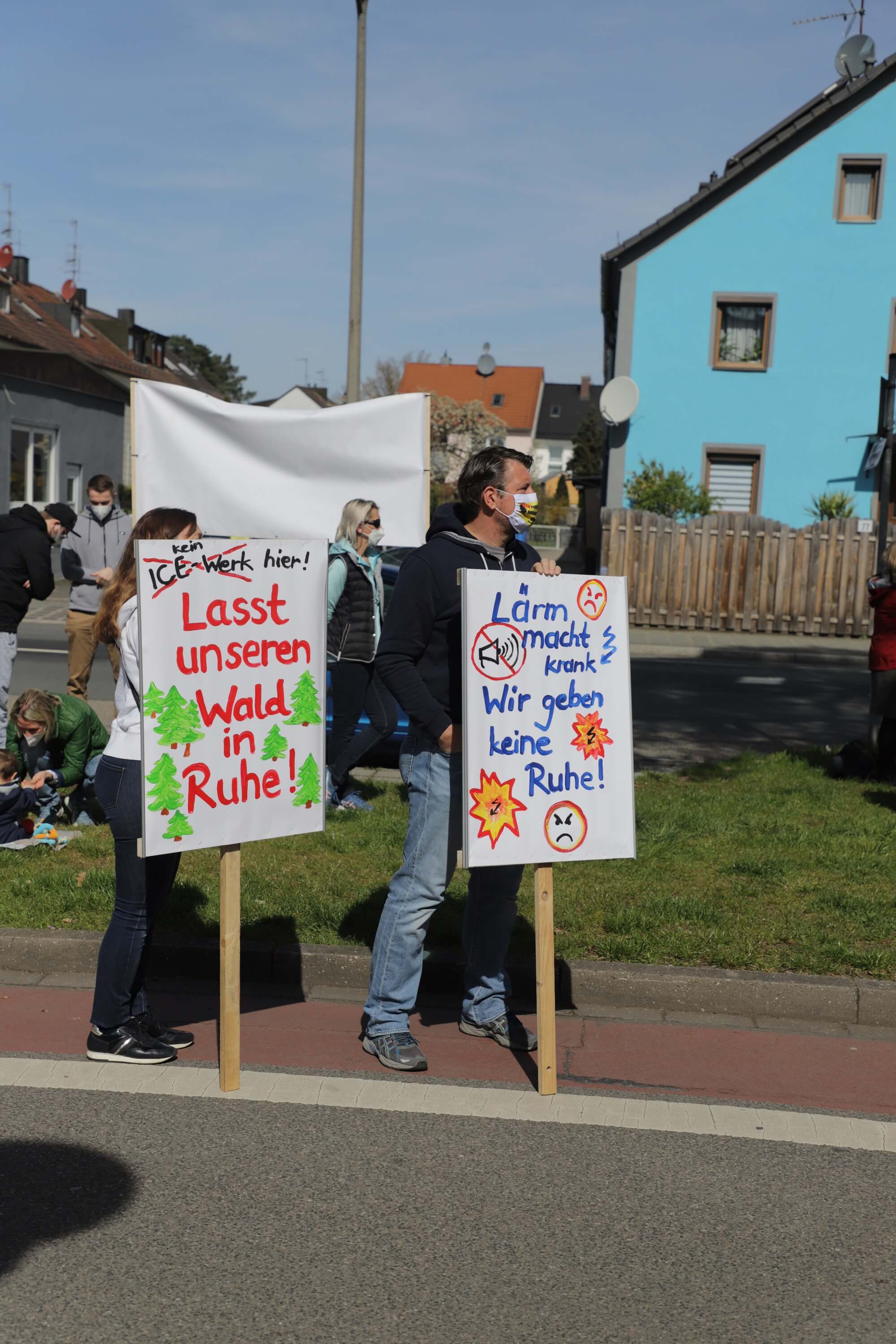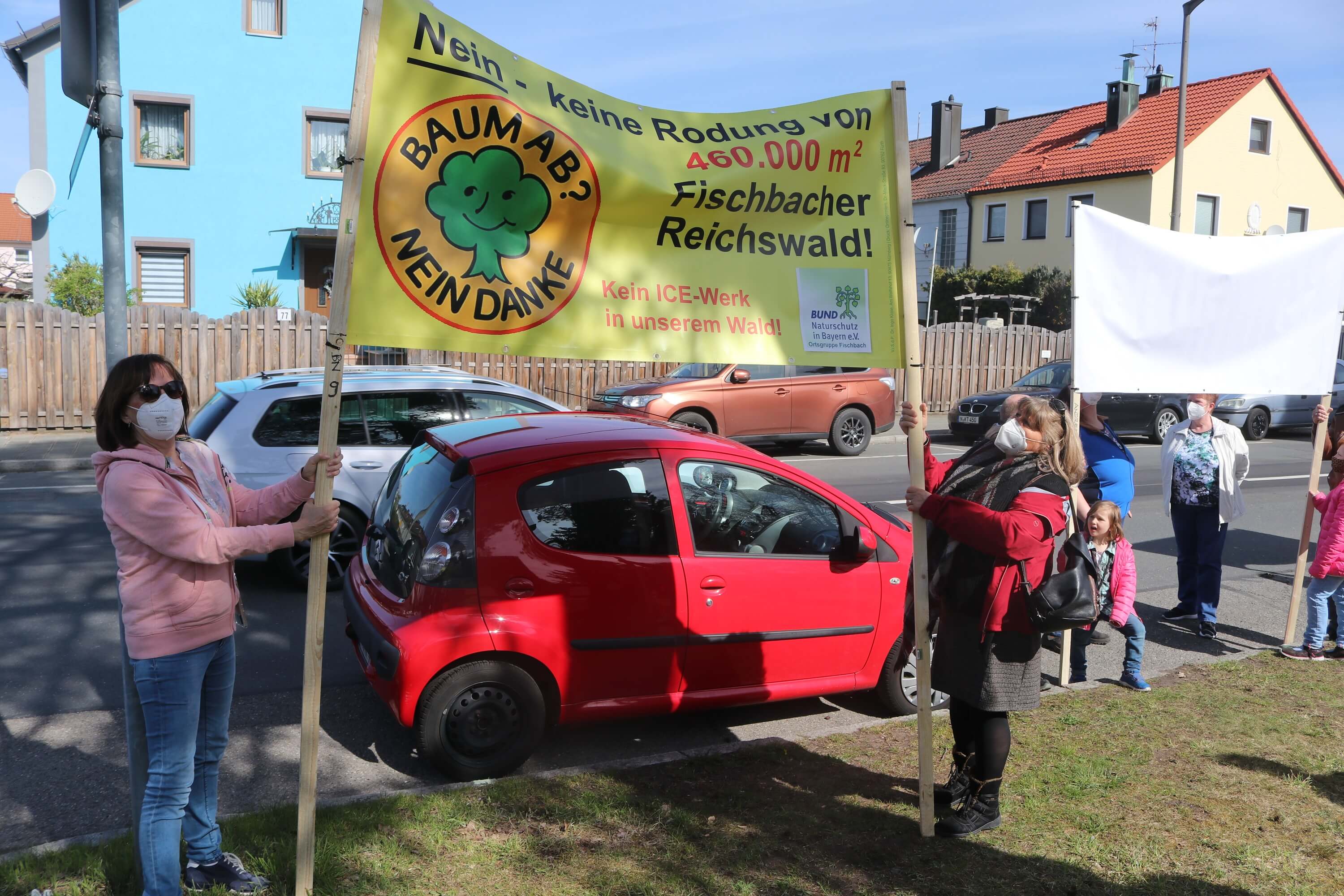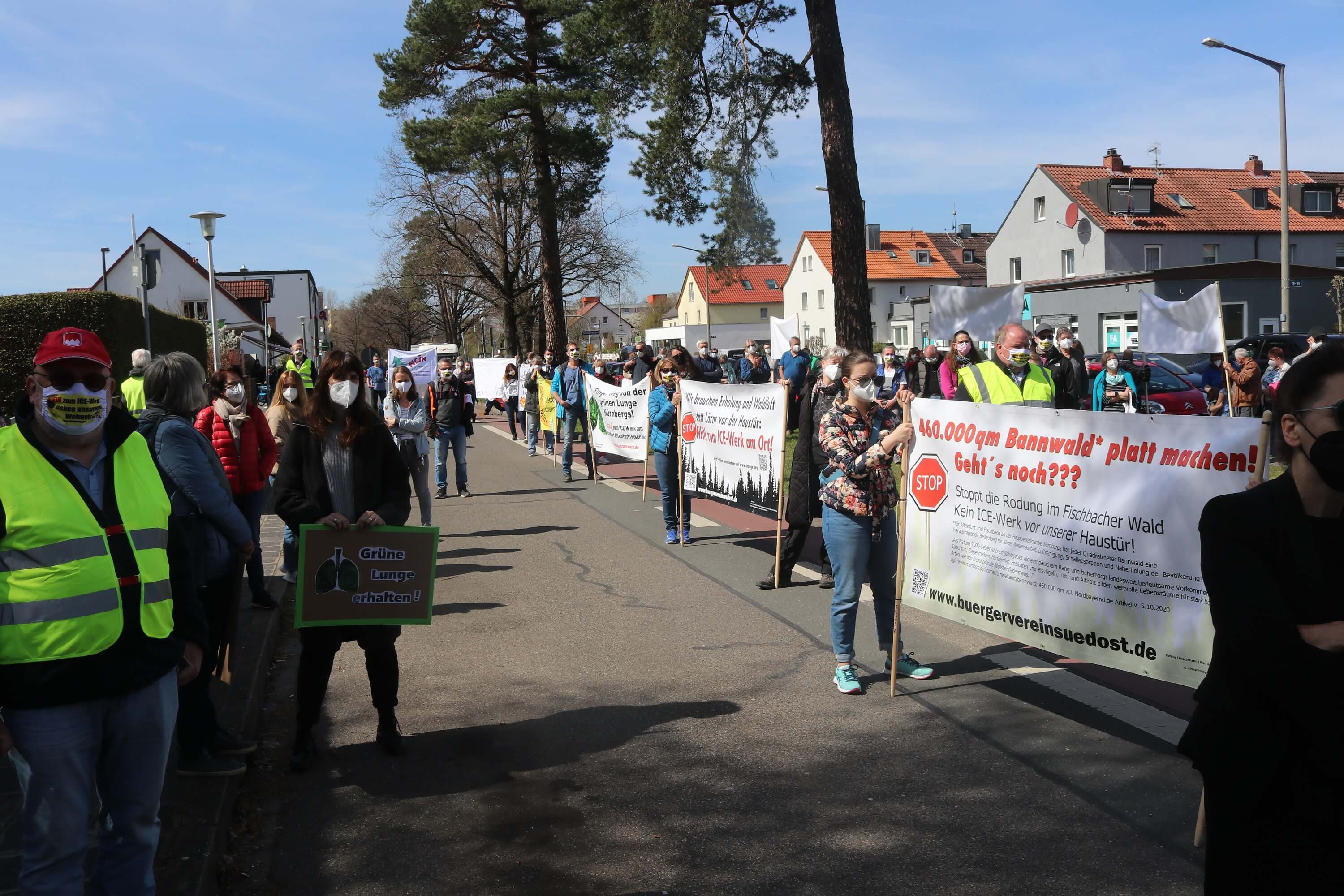 Auch am 2. Mai demonstrierten fast 250 Anwohner und Naturschützer vor der Straße der Menschenrechte gegen das geplante ICE-Werk im Reichswald zwischen Langwasser, Altenfurt, Fischbach und Zabo. Die Deutsche Bahn hält trotz der Proteste an dem Standort fest. Als Gastredner sprach sich auch Thomas Feuchtenberger von Parents for Future gegen das Werk und für mehr Klimaschutz im Wald aus.