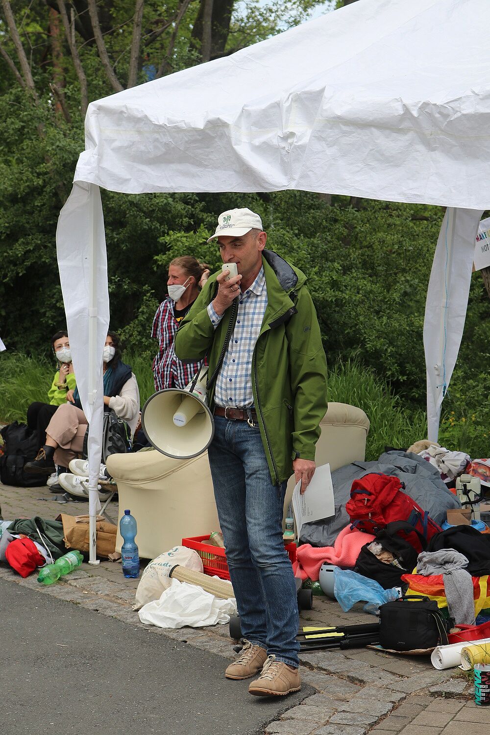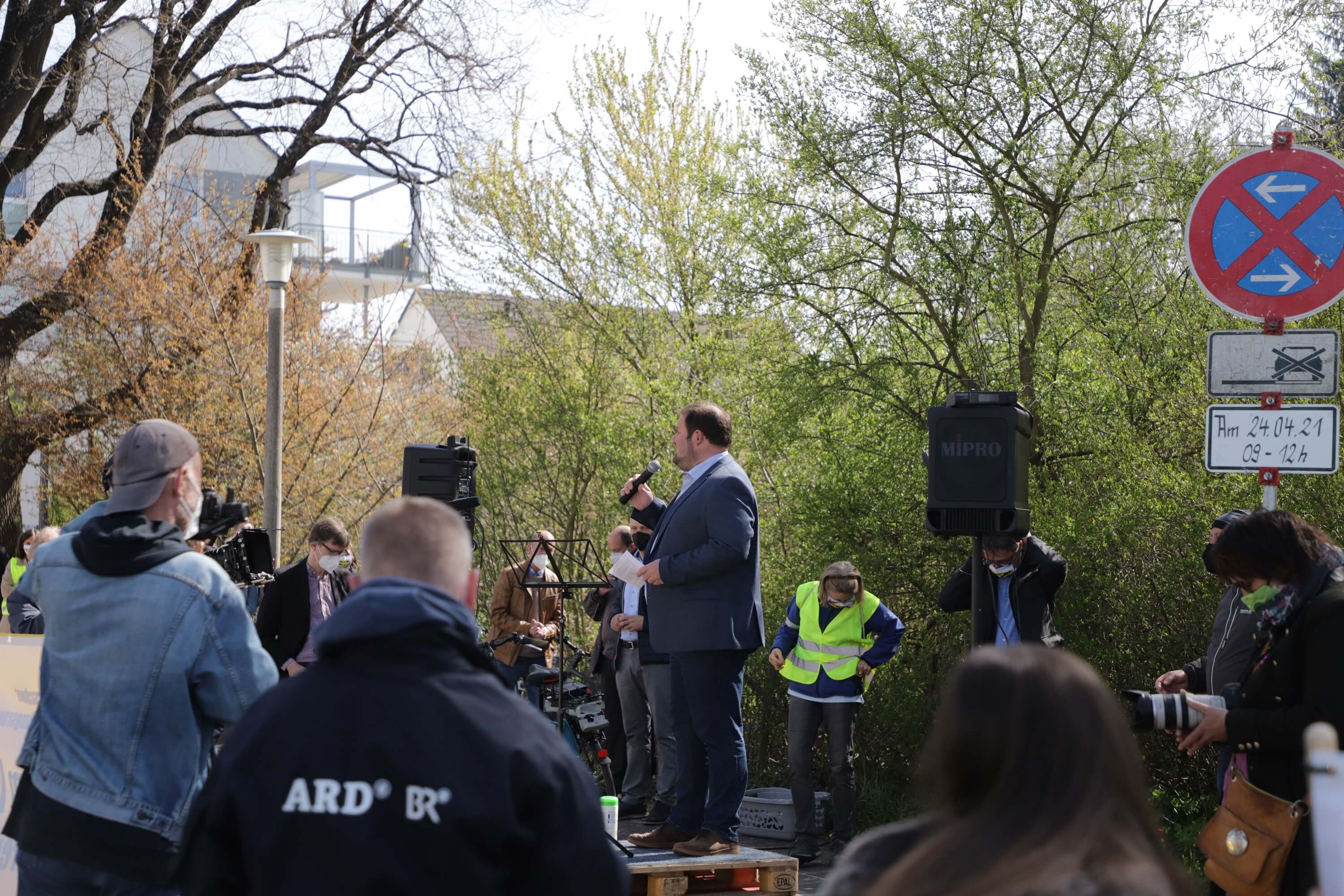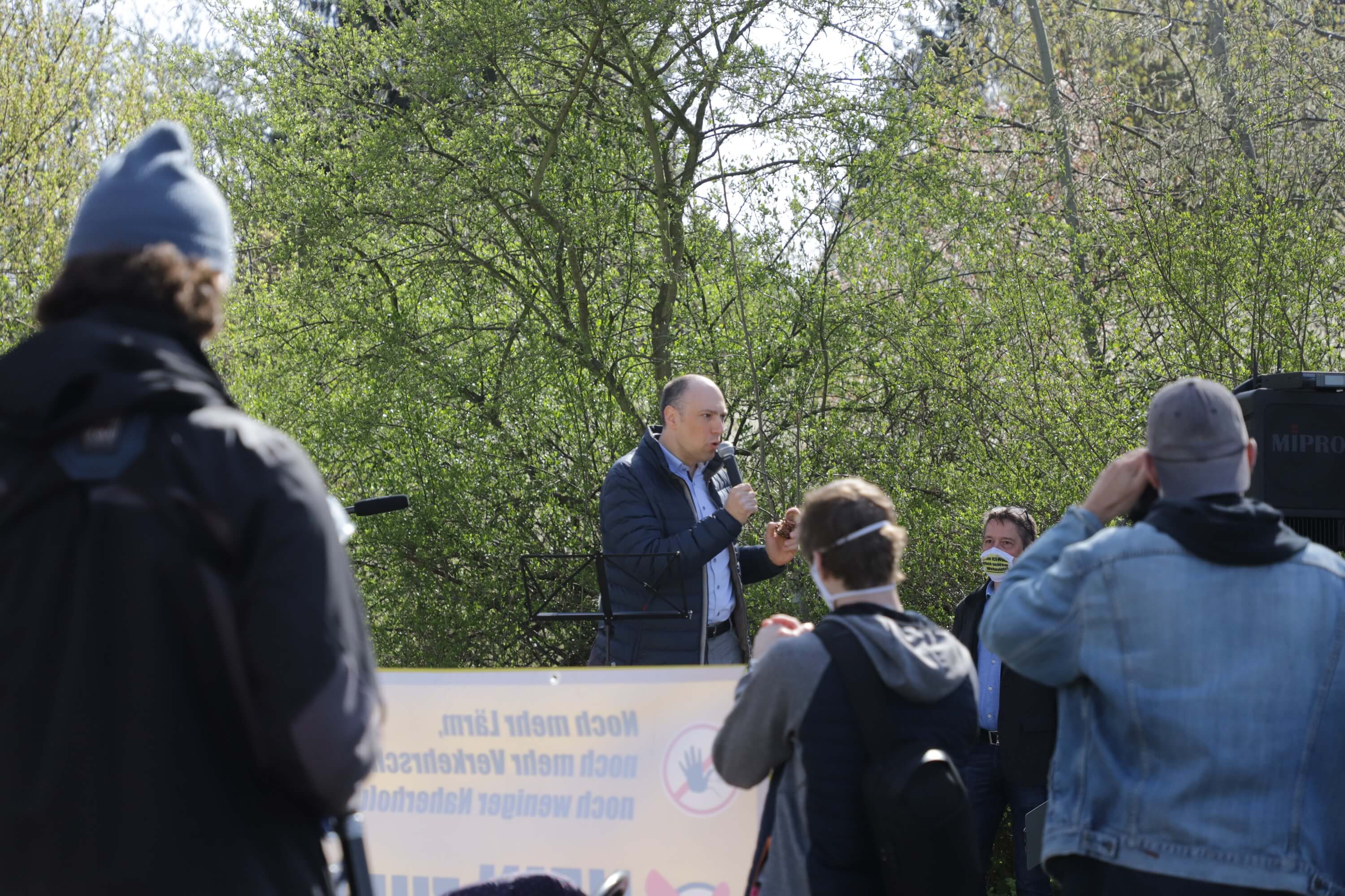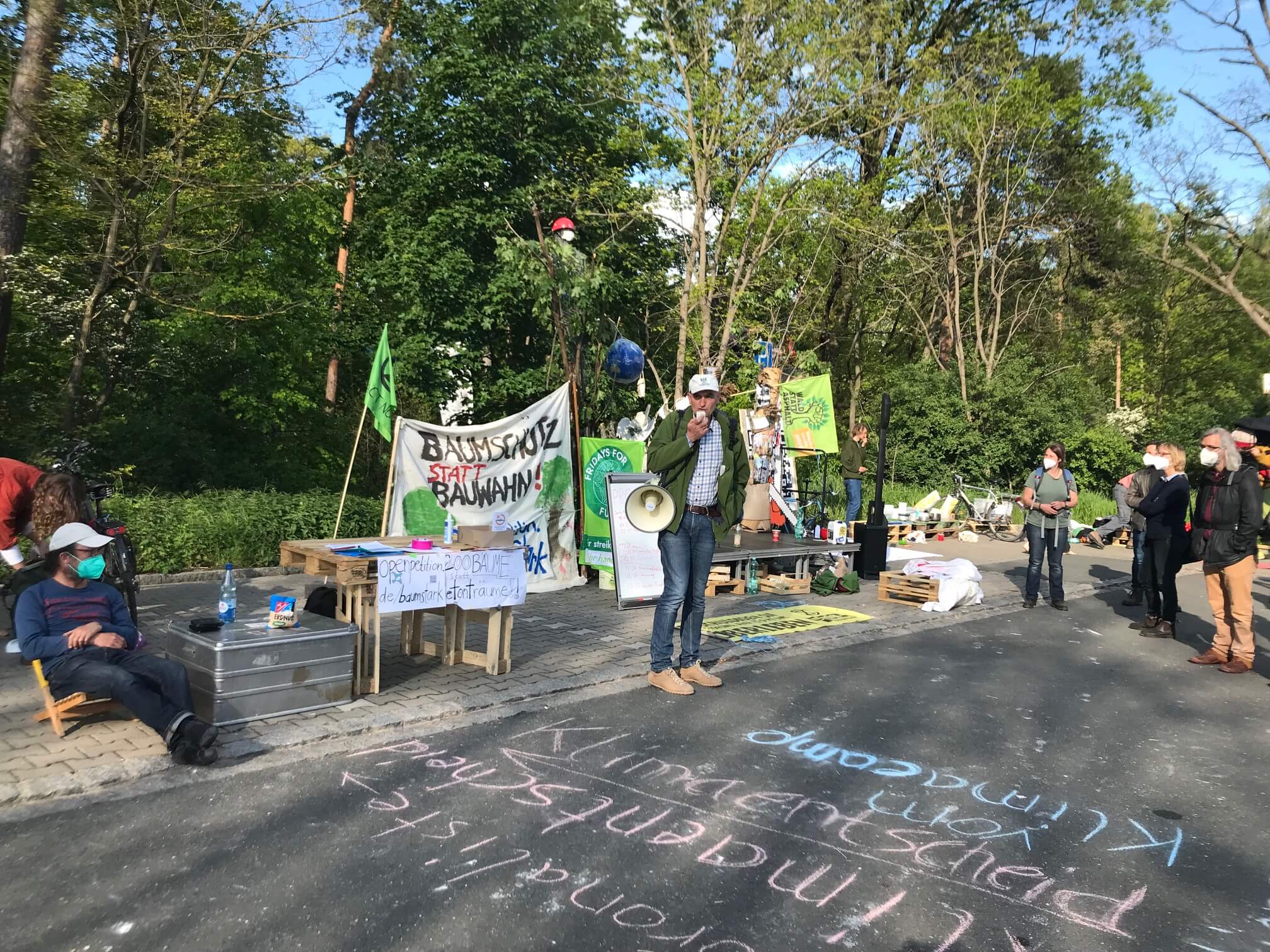 Auch am 2. Mai demonstrierten fast 250 Anwohner und Naturschützer vor der Straße der Menschenrechte gegen das geplante ICE-Werk im Reichswald zwischen Langwasser, Altenfurt, Fischbach und Zabo. Die Deutsche Bahn hält trotz der Proteste an dem Standort fest. Als Gastredner sprach sich auch Thomas Feuchtenberger von Parents for Future gegen das Werk und für mehr Klimaschutz im Wald aus.
