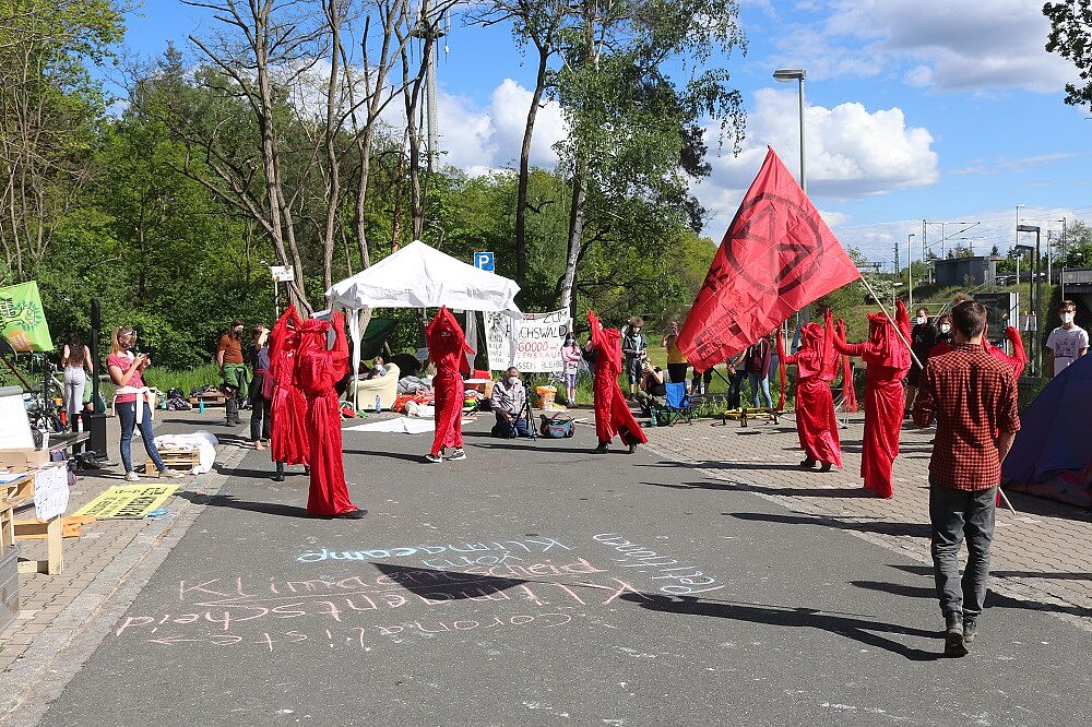 Die Kundgebung fand im Rahmen des Klimacamps am Fischbacher Bahnhof statt. Hier boten Klimaschützer und Bürger drei Tage lang Infostände und bunte Aktionen zum Waldschutz.