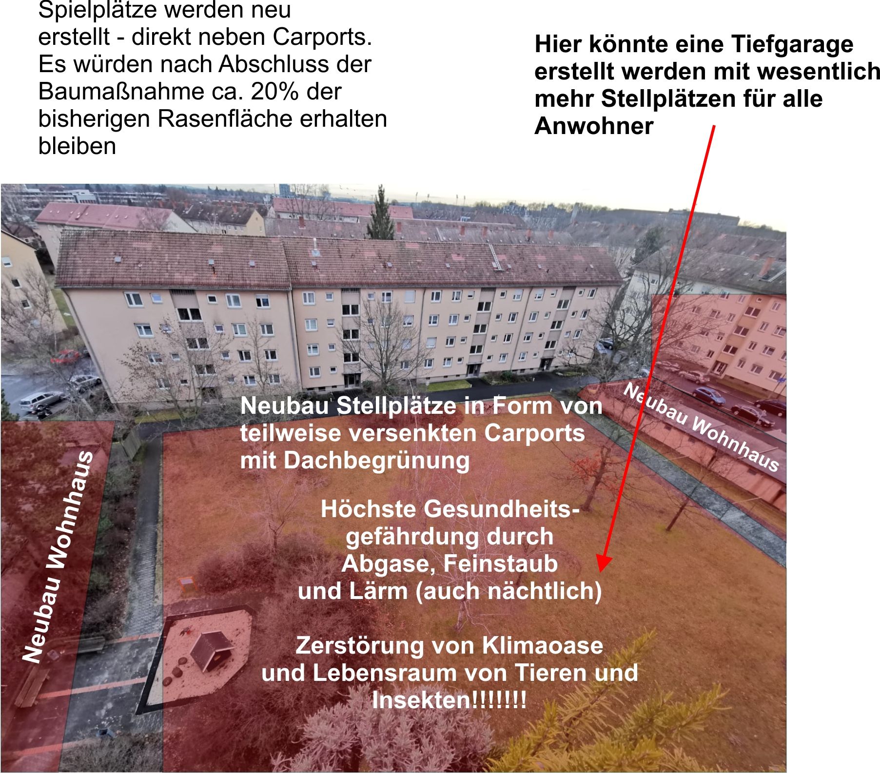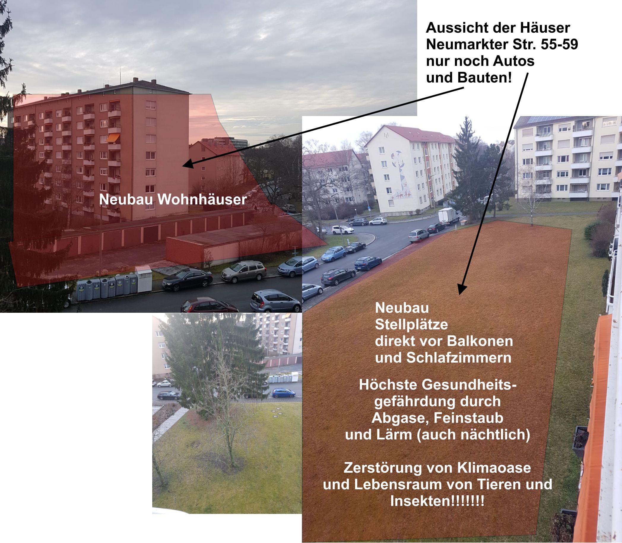 BUND Naturschutz kritisiert den Bau von großflächigen Parkplätzen in den Grünanlagen an der Neumarkter Straße als stadtklimatisch katastrophal. Verzicht oder Parkhäuser und Tiefgaragen auf bisherigen Parkflächen als Alternative.