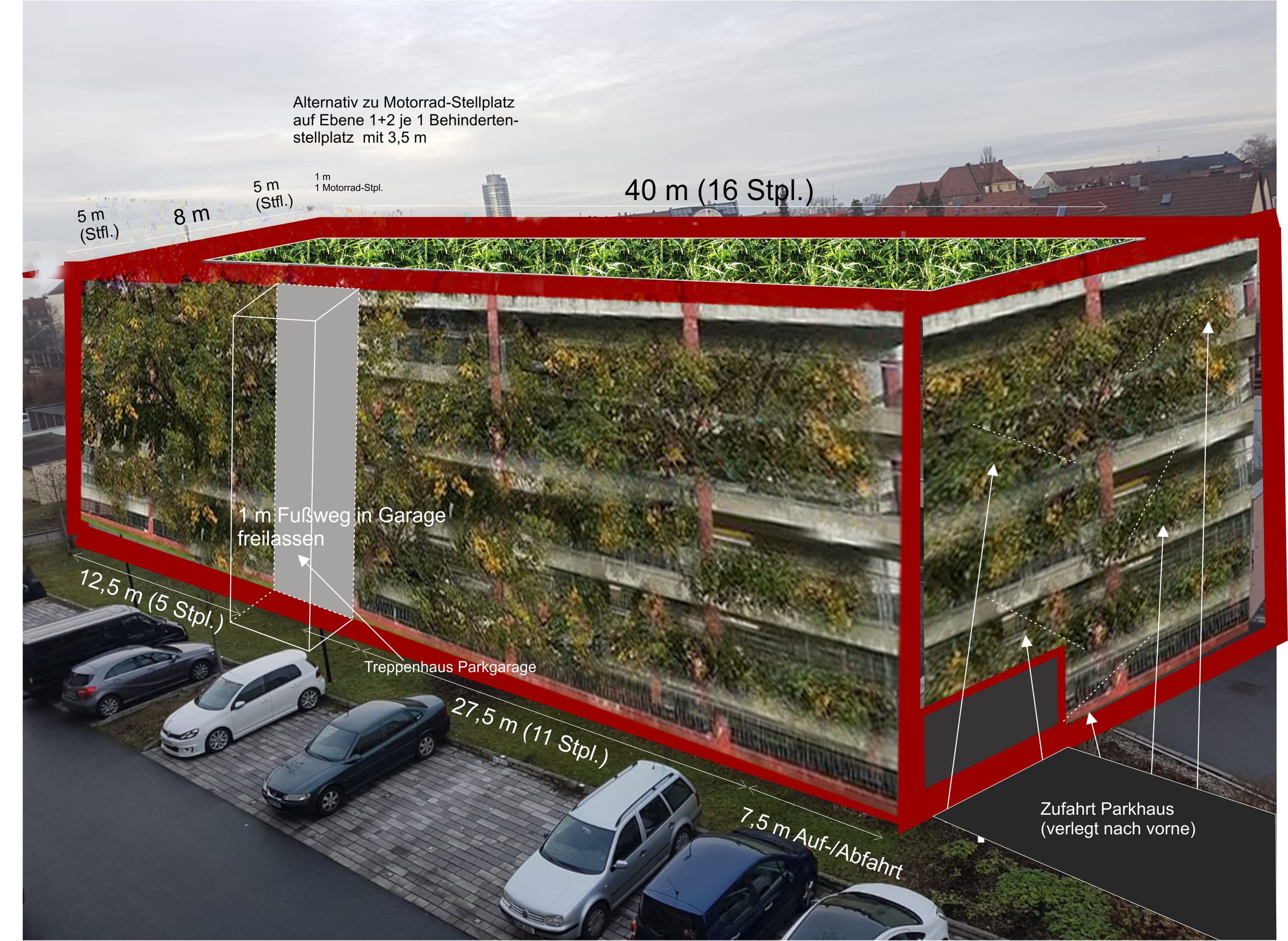 „Würde man Parkhäuser auf dem Dach und an den Fassaden umfangreich begrünen, wäre das sogar ein stadtklimatischer Gewinn zur jetzigen Situation“, argumentiert der 2. BN-Vorsitzende Oliver Schneider. „Im Klimawandel können wir uns keine Billigplanung mehr leisten, die ohne zwingenden Grund Grünflächen vernichtet.“