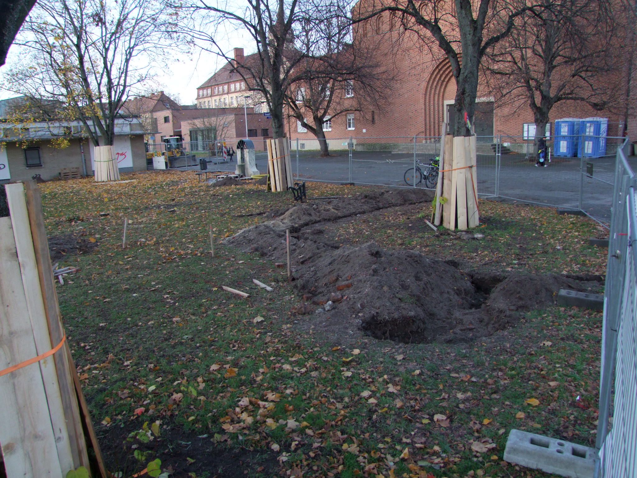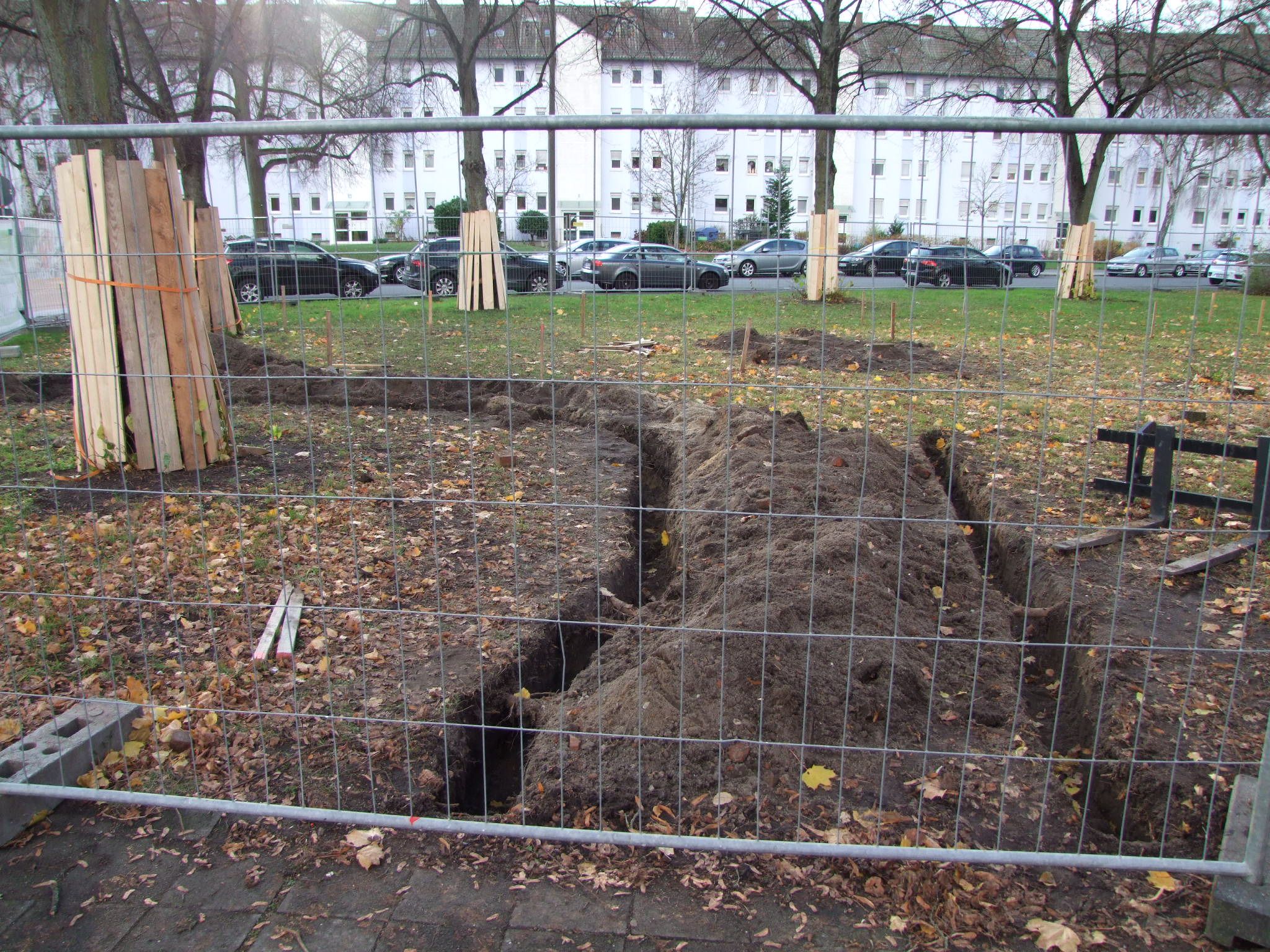 Diese Beschreibung plus Fotos der intakten Grünfläche und angrenzenden Lorschstraße deuteten weder massive Eingriffe in die Wiese noch Baumfällungen an. Man erwartete noch eine baldige Beteiligung zur Gestaltung. Stattdessen rückten die Bagger an. Zwei Tage nach Baubeginn waren erstmals Details am Bauzaun zu lesen. Am Ende der Woche war tabula rasa in der kleinen Wiesenfläche und es drohen weitere Beschädigungen der säumenden großen Linden.