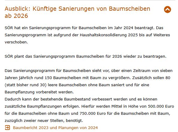 SÖR hat deshalb „die dringende Notwendigkeit“ zu einem auf sieben Jahre angelegten Sanierungsprogramm gesehen und dieses zusammen mit dem Baumbericht für das Jahr 2023 am 24.4.2024 im Werkausschuss von SÖR vorgestellt (siehe Baumbericht 2023 im Anhang, Seiten 16 u. 17). Die Kosten pro Jahr wurden mit 1,25 Mio. Euro veranschlagt. Zusätzlich wurde der Bedarf von zwei Personalstellen angemeldet.